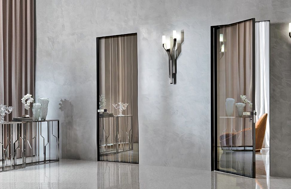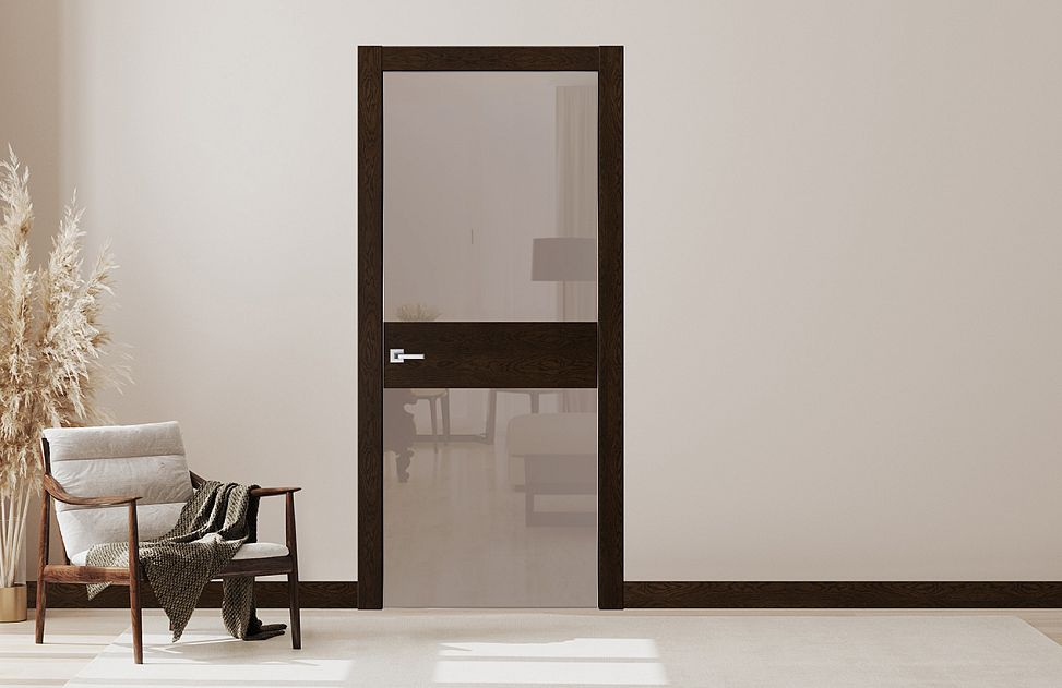 Зеркало можно установить на всю поверхность двери или сделать отдельные вставки разного размера. Максимальная высота таких дверей - 3м, но если высота проема ниже, а хочется дверь в “потолок”, то полотно рекомендуем дополнить зеркальной фальш-фрамугой, тем самым вы визуально увеличите высоту двери без изменения самого проема.
