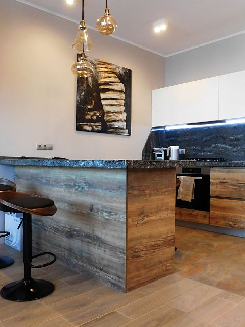 Эта семья купила недостроенный дом, поэтому с некоторыми его особенностями пришлось смириться: например, с невысокими потолками в гостиной и всём первом этаже и довольно крутыми ступенями лестницы. Часть дома пристроили к существующему зданию. Получились большая кухня-столовая, прихожая, три спальных на втором этаже, на каждом этаже по санузлу. На первом этаже также разместилась комната няни. Все отделочные работы необходимо было выполнить в очень сжатые сроки, так как заказчикам очень хотелось лето встретить на море в новом доме.