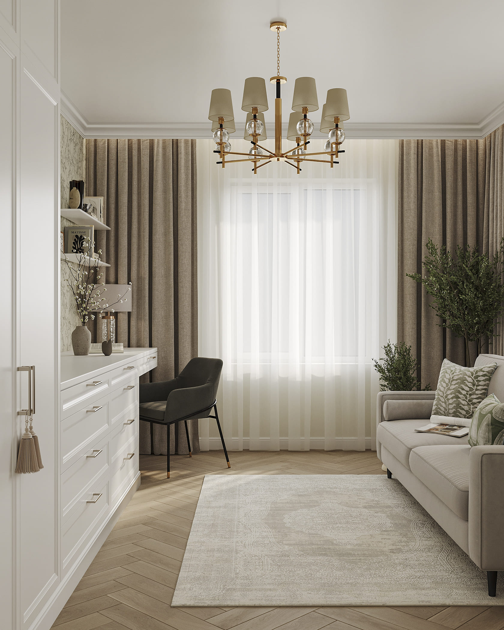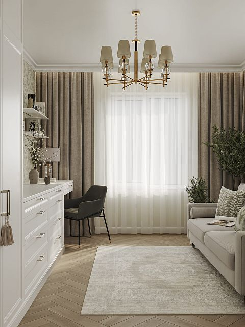 Цветовая палитра дарит пространству легкость и свежесть, а умело подобранные акценты в виде изящной мебели и элементов декора создают гармонию и элегантность. Мягкие текстуры и натуральные материалы дополняют общий стиль, превращая дом в истинное убежище для отдыха и спокойствия.