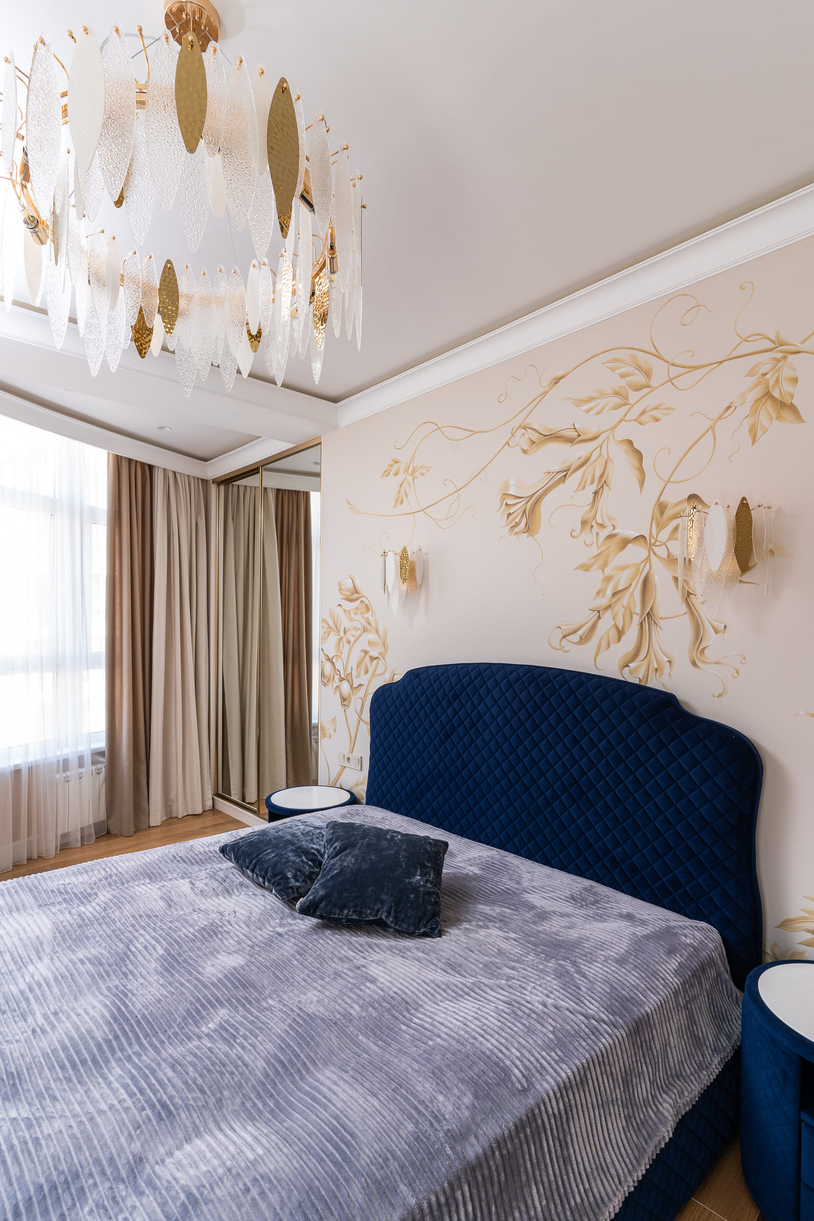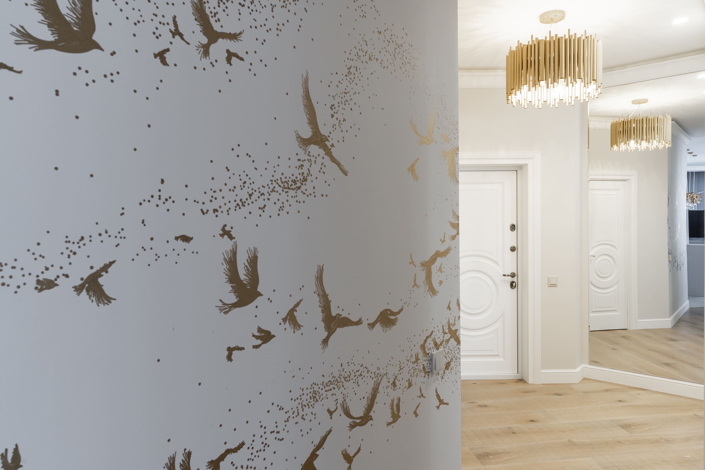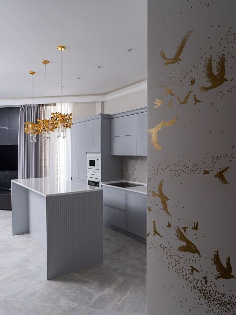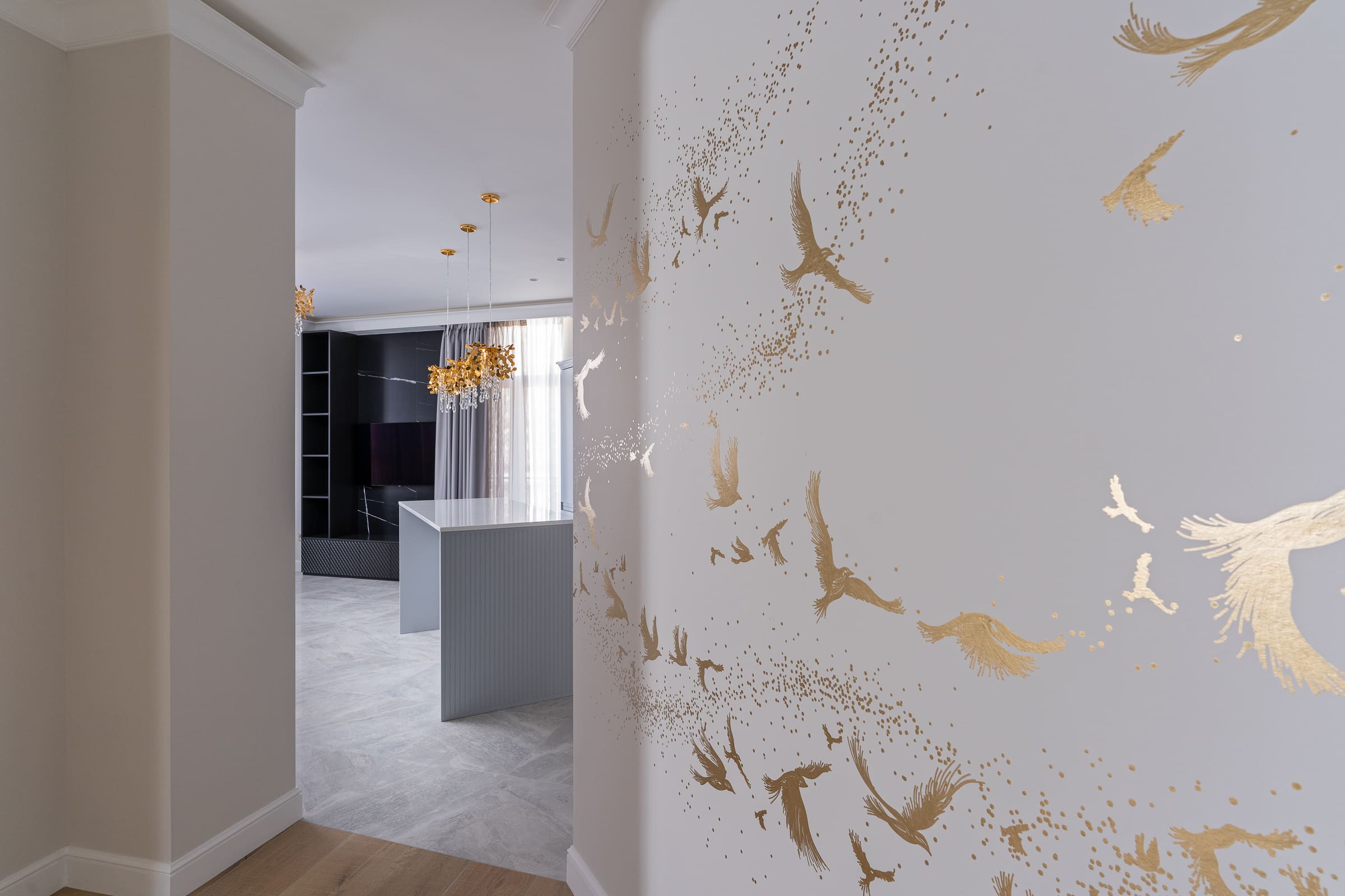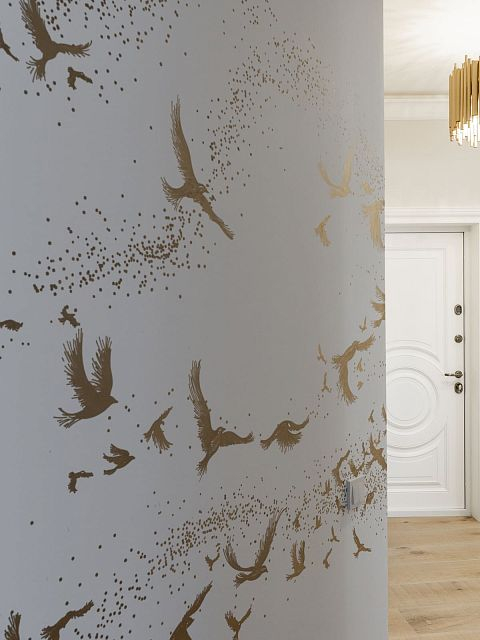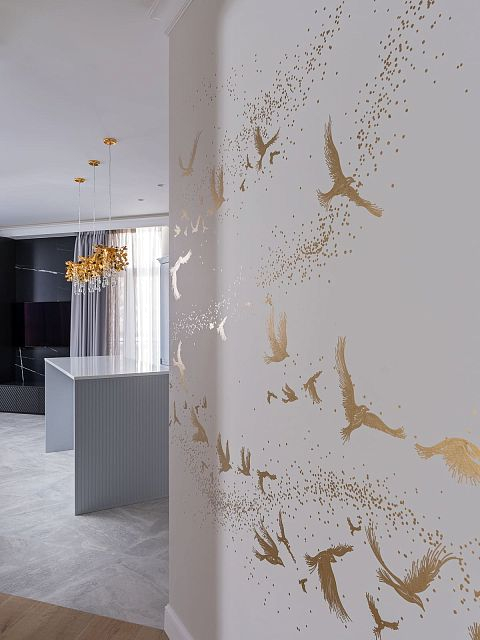 Остальные детали интерьера под стать: обои ручной работы с золотыми узорами, дизайнерские светильники и мебель.