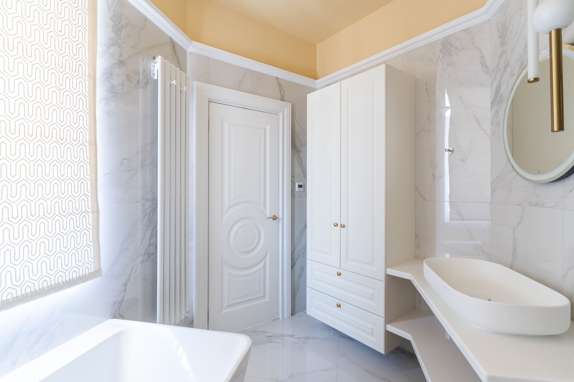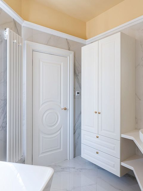Для оформления дверных проемов они выбрали белоснежные Bergamo6, с модной многоярусной фрезеровкой. Кстати, хозяевам так понравился дизайн полотен, что и двери для входа в гардеробную они индивидуально заказывали с таким же рисунком.