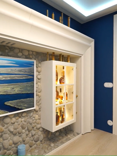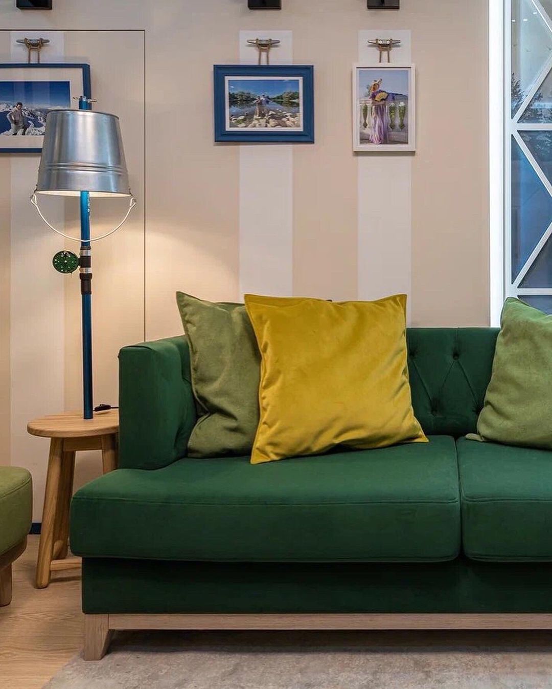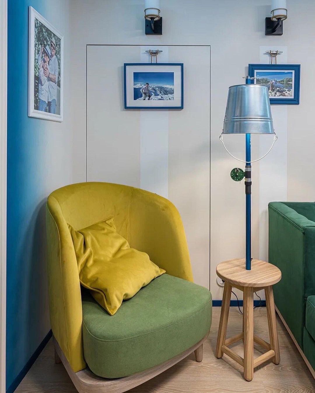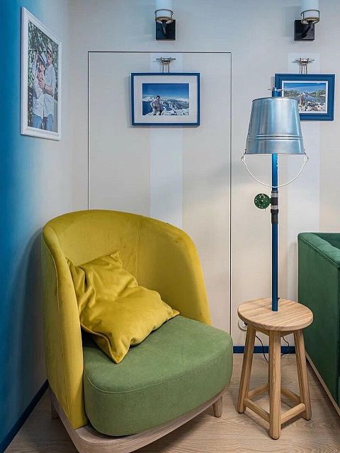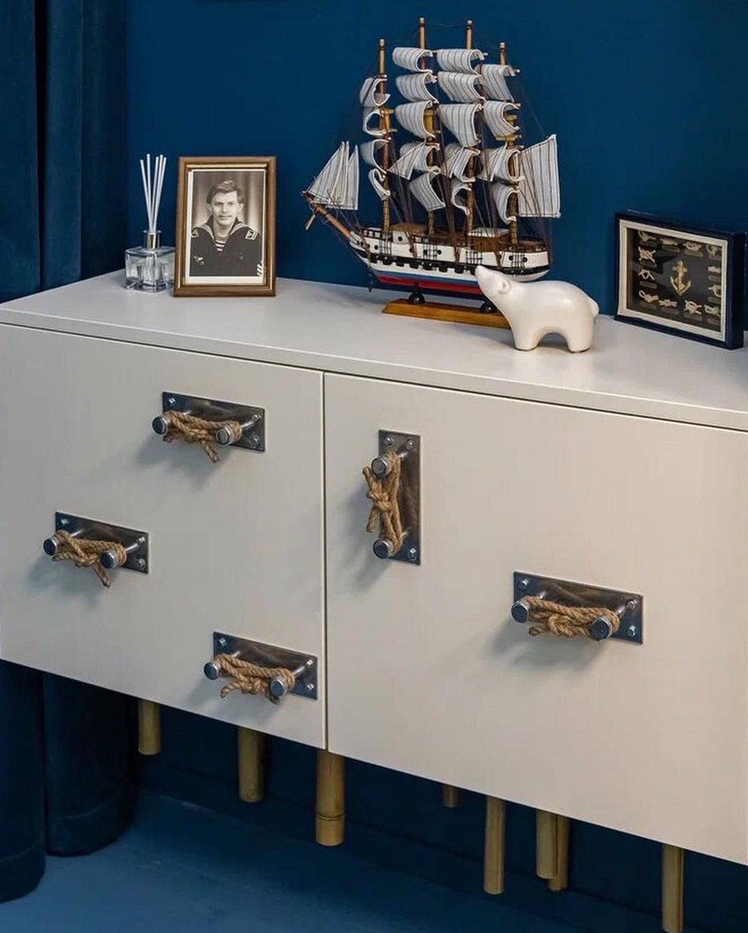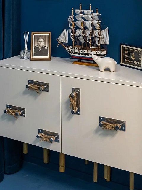- Жизнь героев квартиры неразрывно связана с рекой Иртыш. И дизайнер решил отразить эту связь в неожиданных интерьерных деталях: фотографии подвесил на канатах, миниатюрные «кнехты» стали ручками комода, удочка теперь является основанием торшера, а вместо абажура использовано рыбацкое ведро.