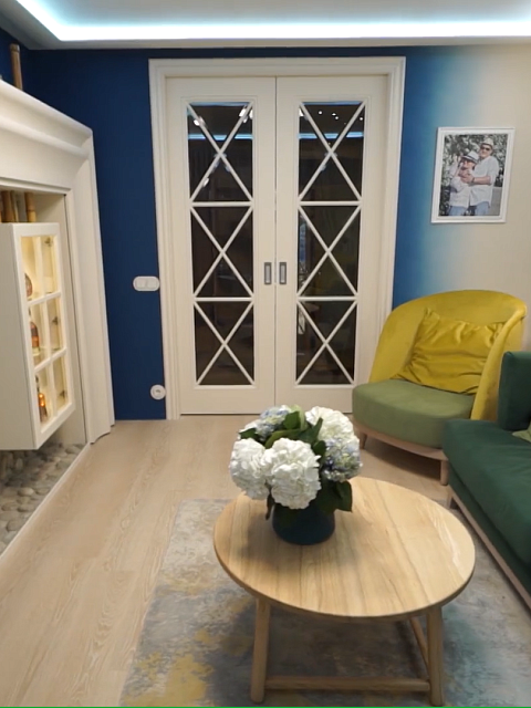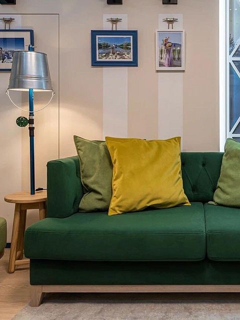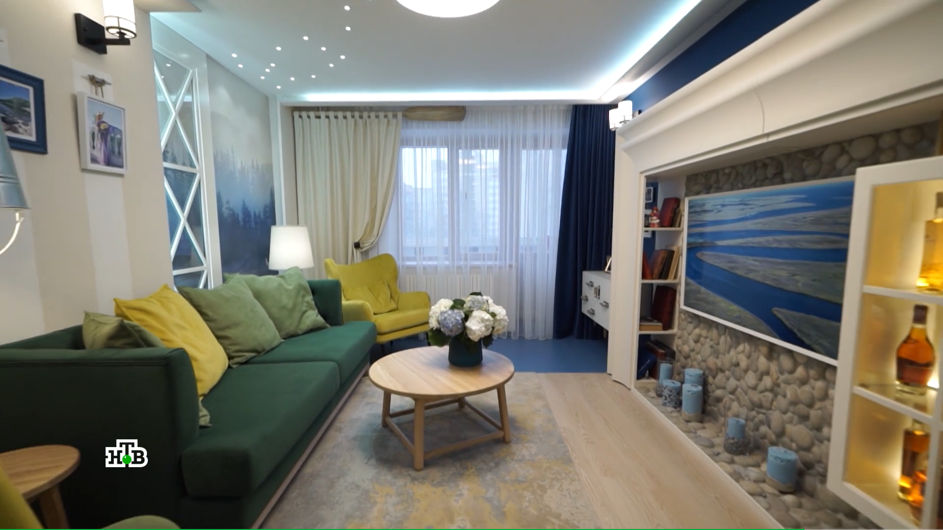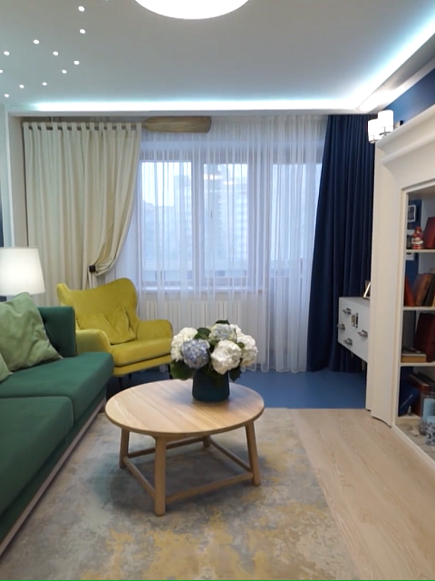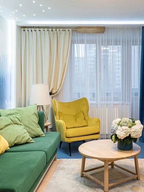- Цветовая гамма гостиной выполнена в природных оттенках: глубокий синий цвет, похожий на цвет воды, и нежный кремовый, напоминающий утреннюю дымку над рекой, и насыщенный зеленый, и солнечный желтый.