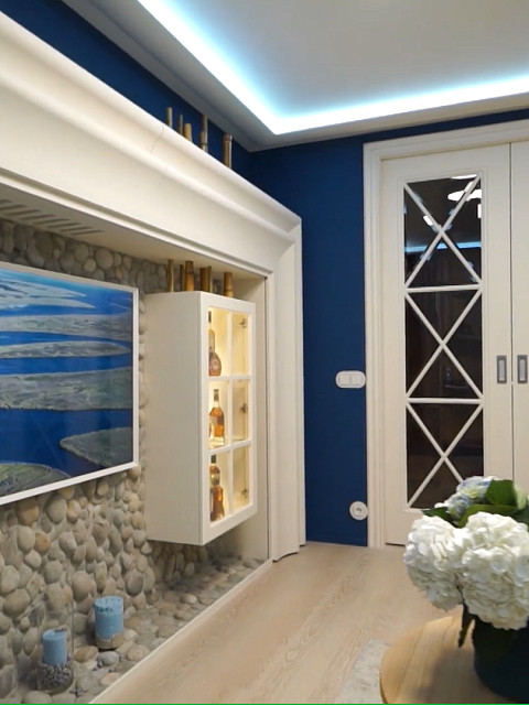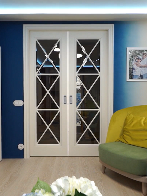 - Вход в гостиную сделали парадным. Для этого установили раздвижные двери Amelia, изящные модели в стиле романтичного французского прованса. Главным акцентом дверей является багет в форме буквы X, фацетное стекло и шикарные фигурные наличники.