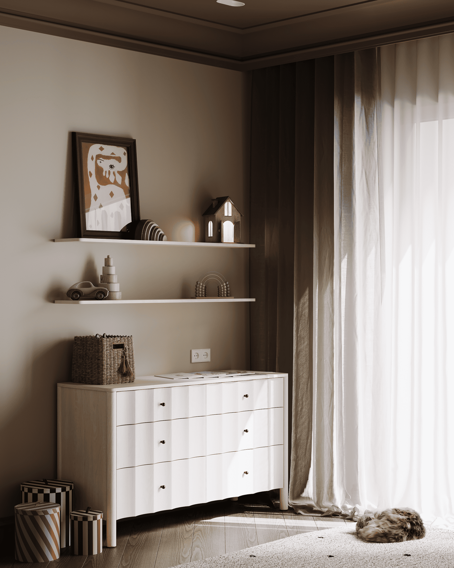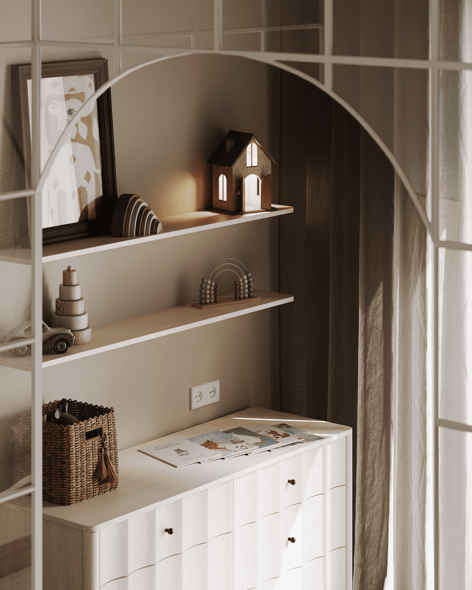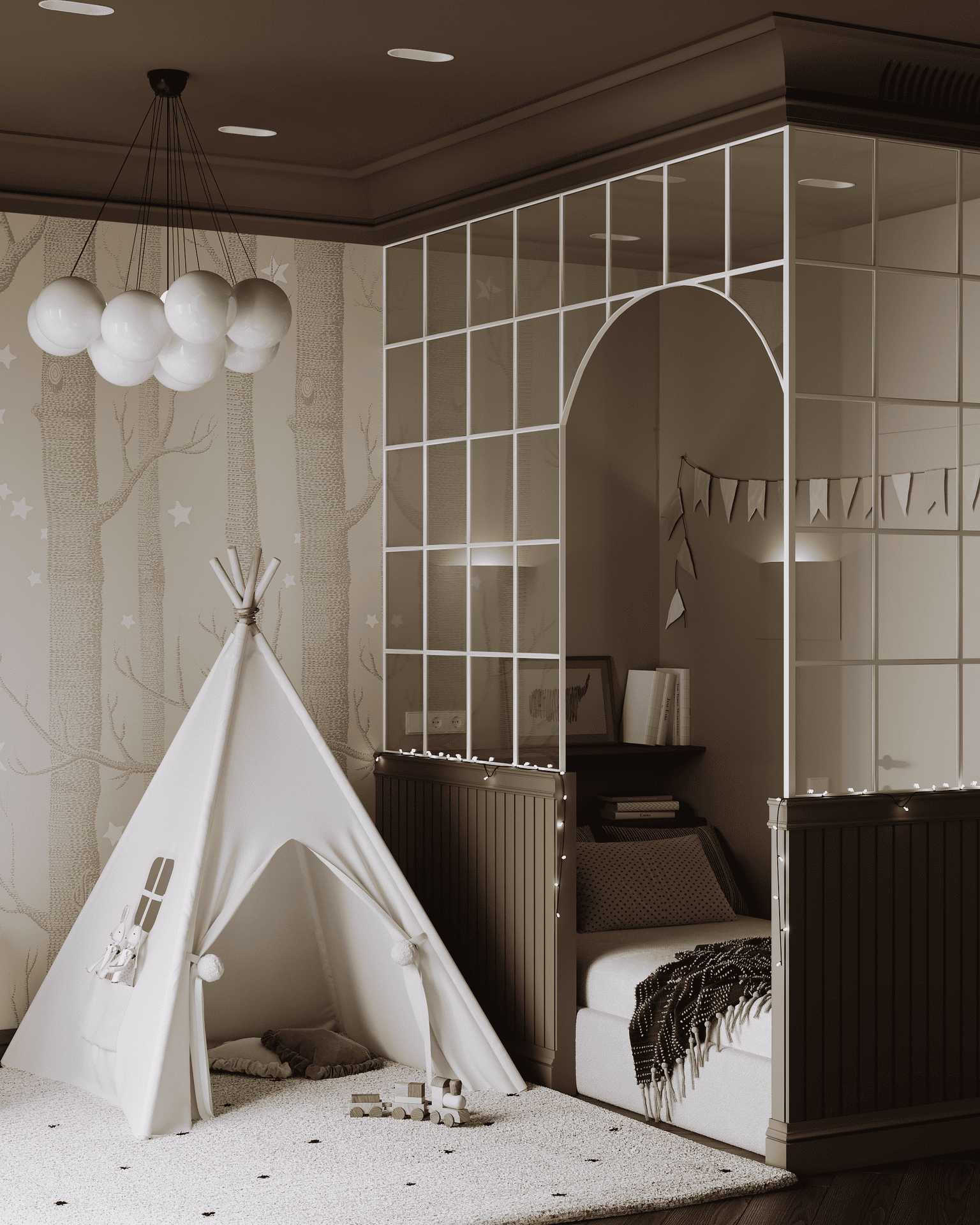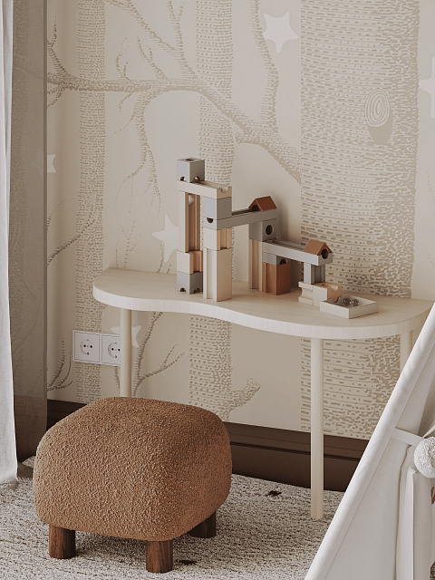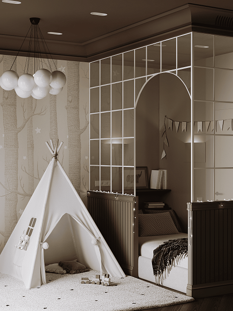 В этой детской ребёнок может чувствовать себя защищено: кровать находится как бы "в домике" - там удобно отдыхать и читать книжки. Вне "домика" - таинственный лес, который воссоздаётся, благодаря обоям от Cole & Son 'Woods stars'. Здесь стоит палатка, в которой можно валяться на подушках и играть.