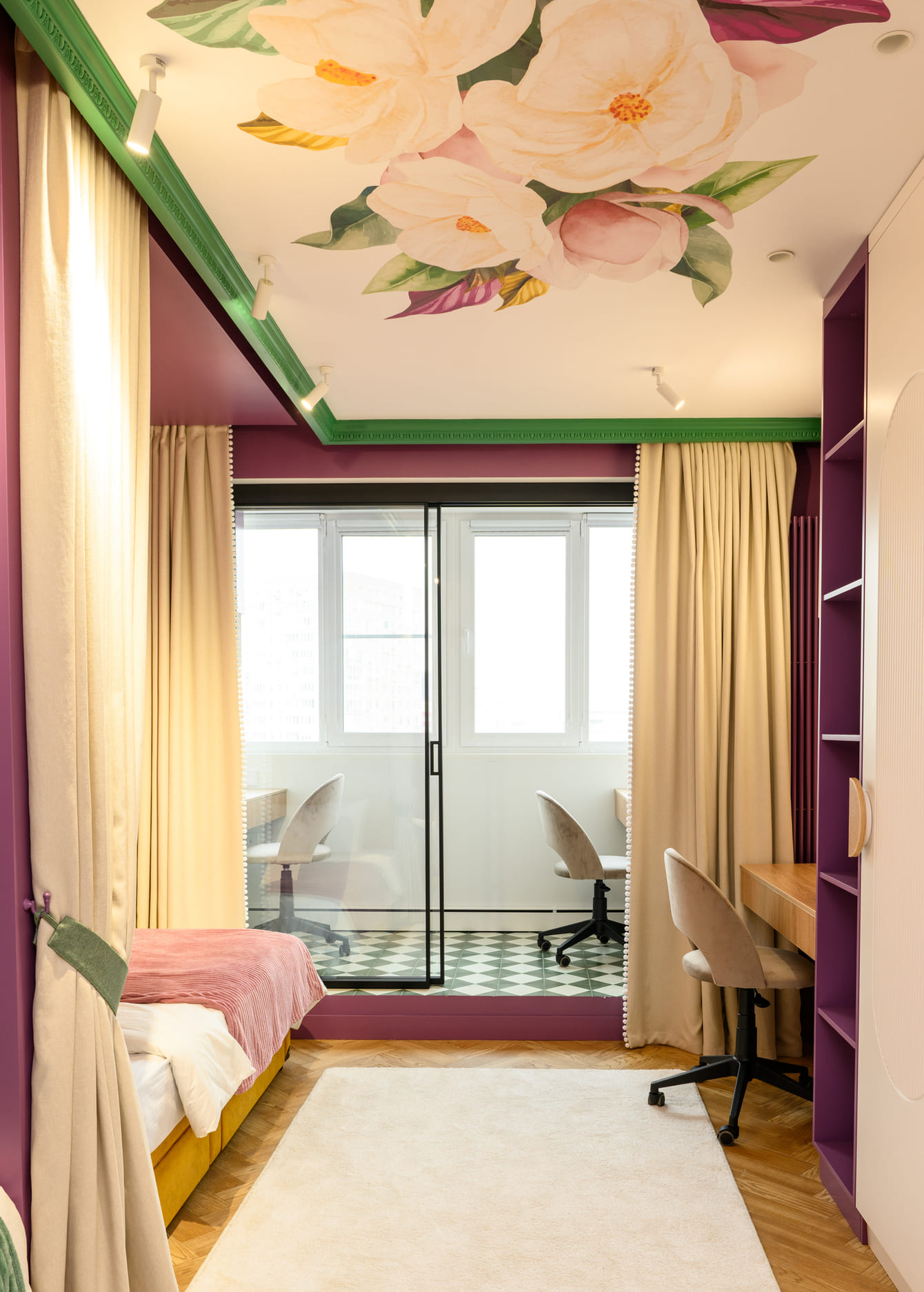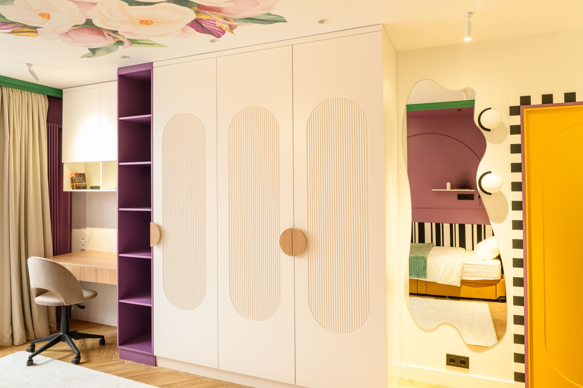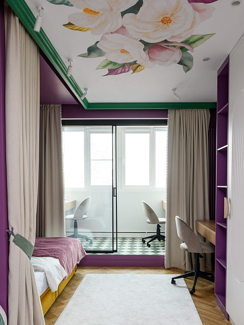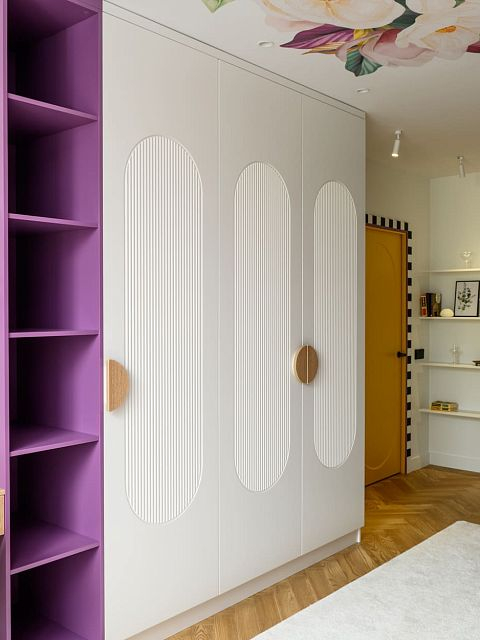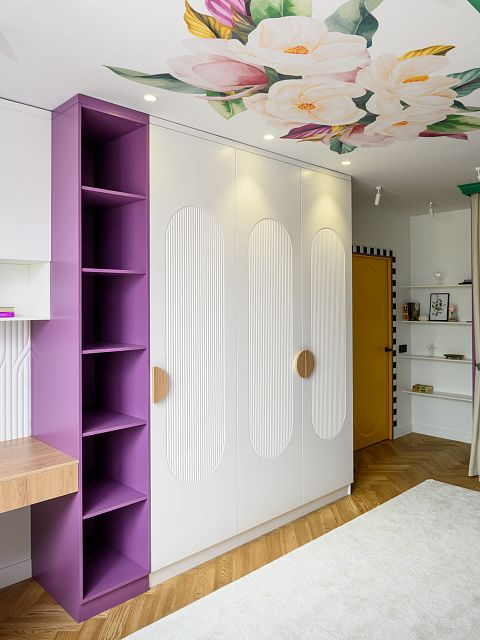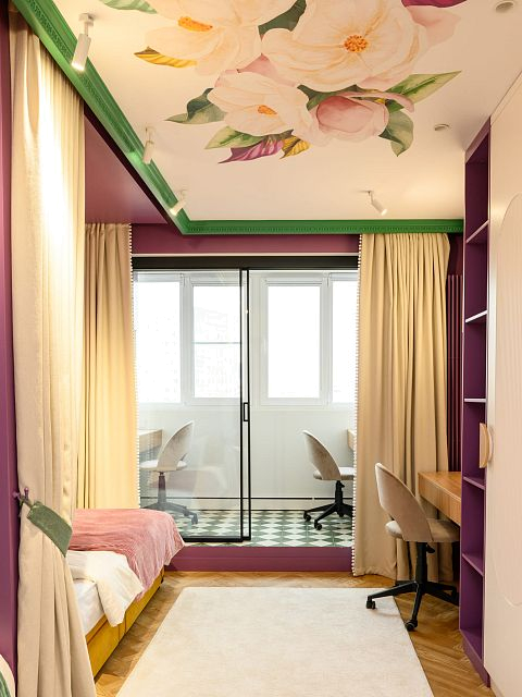 В этом проекте было принято смелое решение: вместо трех отдельных кроватей в детской были созданы три отдельные комнаты, где каждая из сестер сможет найти уединение. Был убран оконно-балконный блок, что позволило получить 23 квадратных метра вместе с лоджией. Простенок между пространствами был демонтирован, а получившийся проем немного уменьшили.