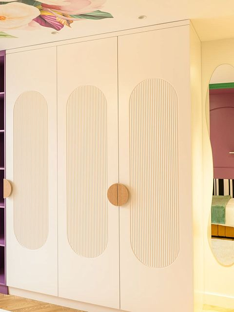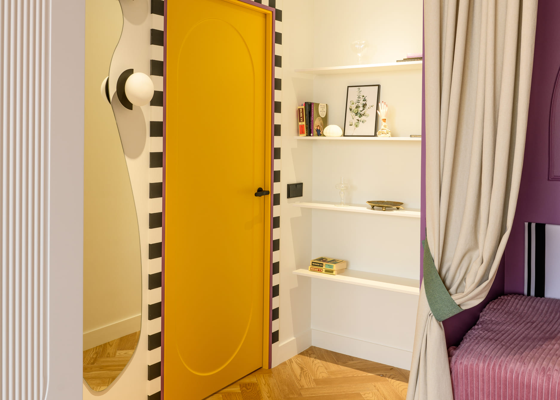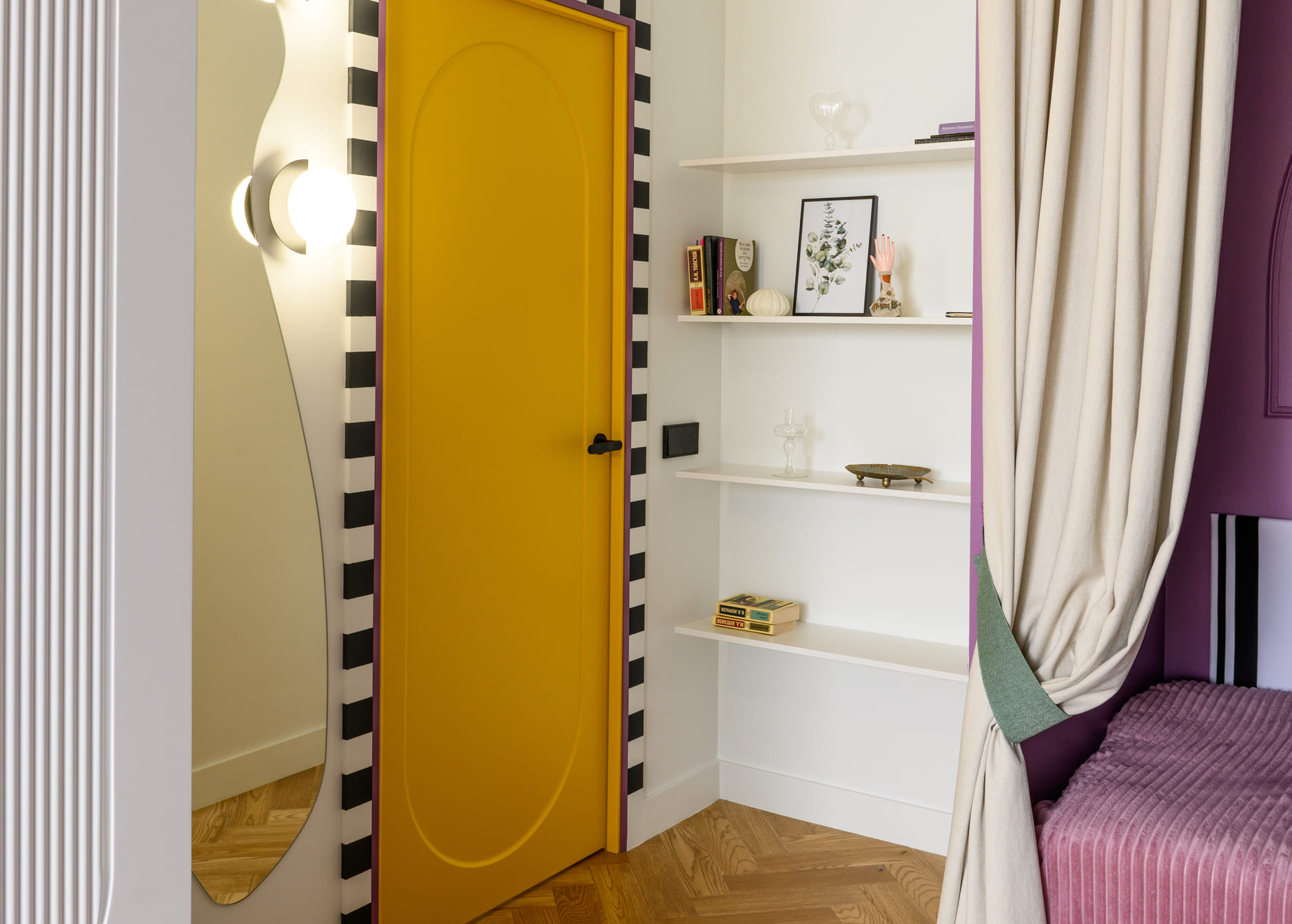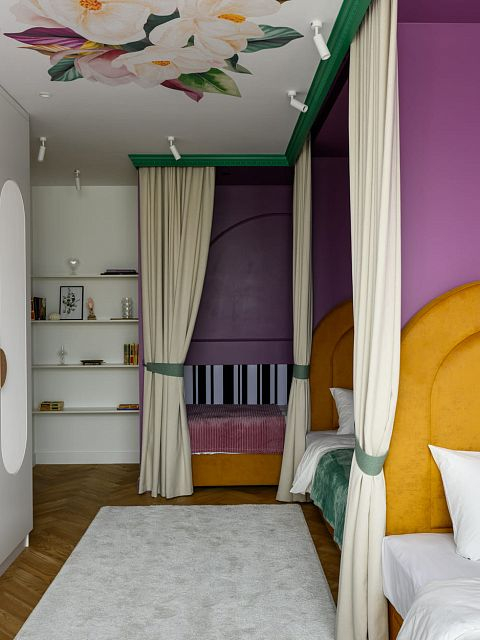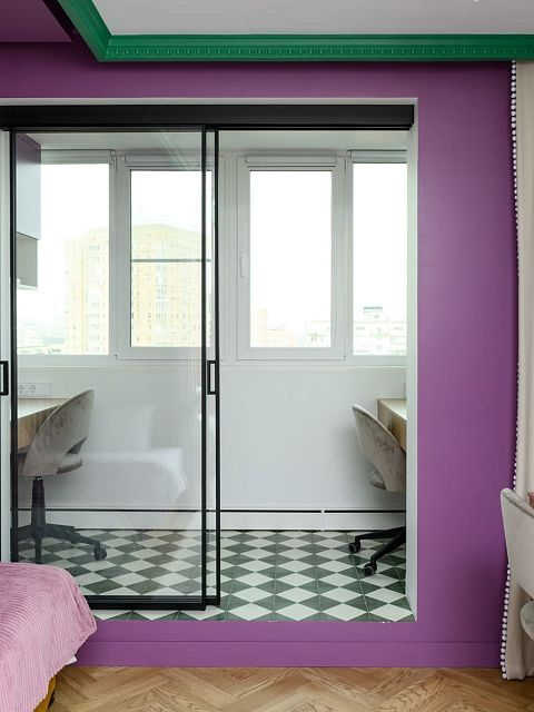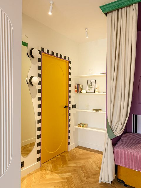 В этом проекте было принято смелое решение: вместо трех отдельных кроватей в детской были созданы три отдельные комнаты, где каждая из сестер сможет найти уединение. Был убран оконно-балконный блок, что позволило получить 23 квадратных метра вместе с лоджией. Простенок между пространствами был демонтирован, а получившийся проем немного уменьшили.