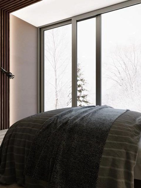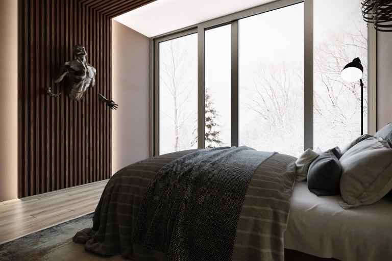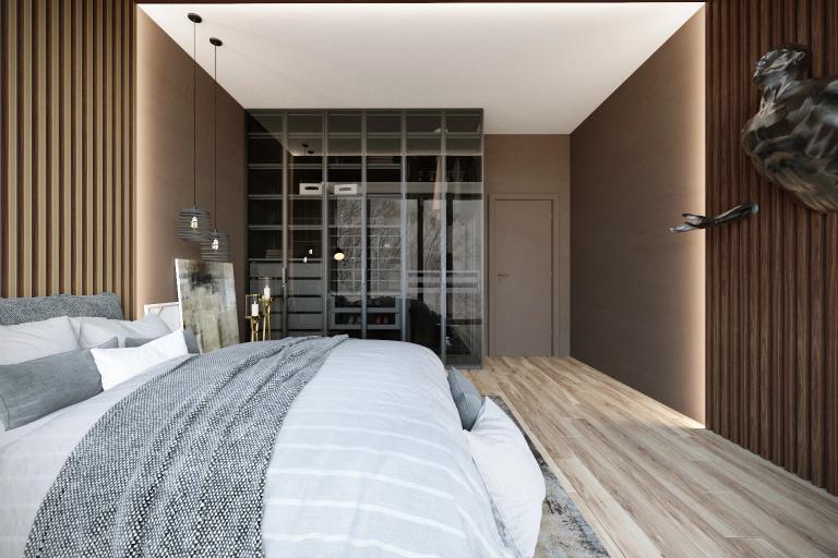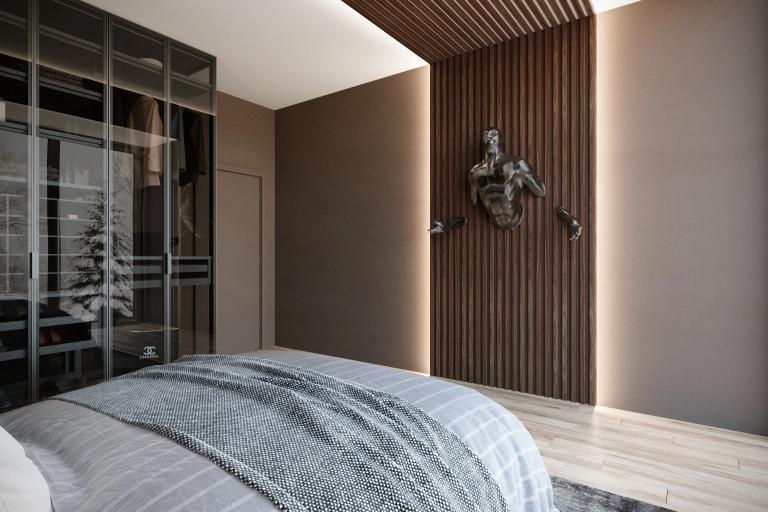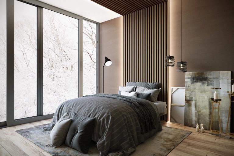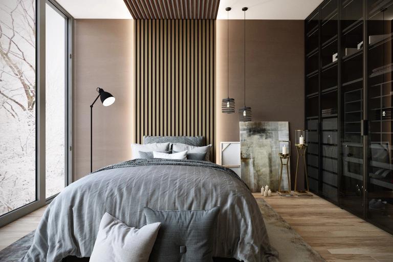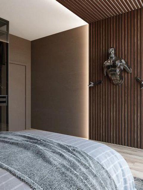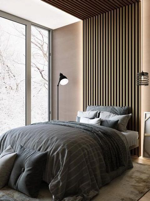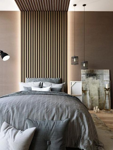 Обратите внимание насколько гармонично наши декоративные рейки вписались в эту спальню в шоколадных тонах.