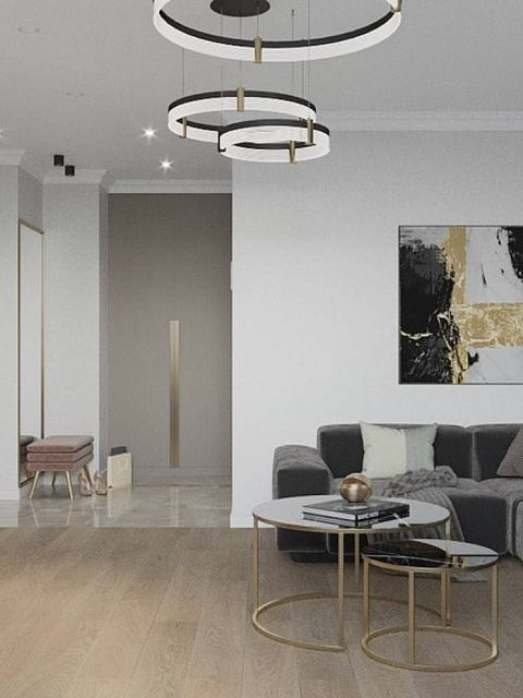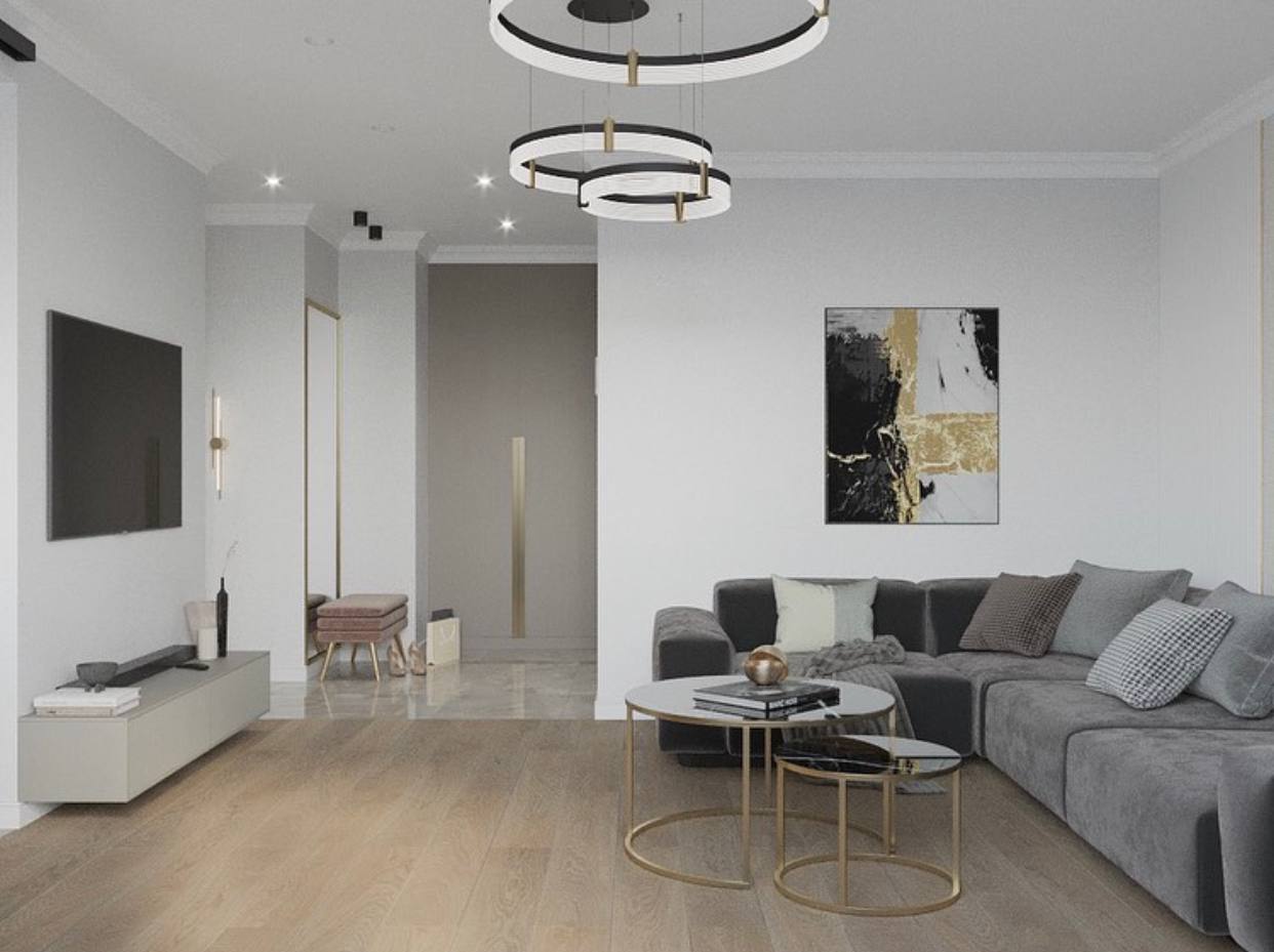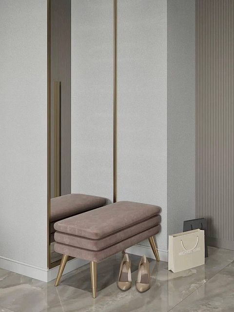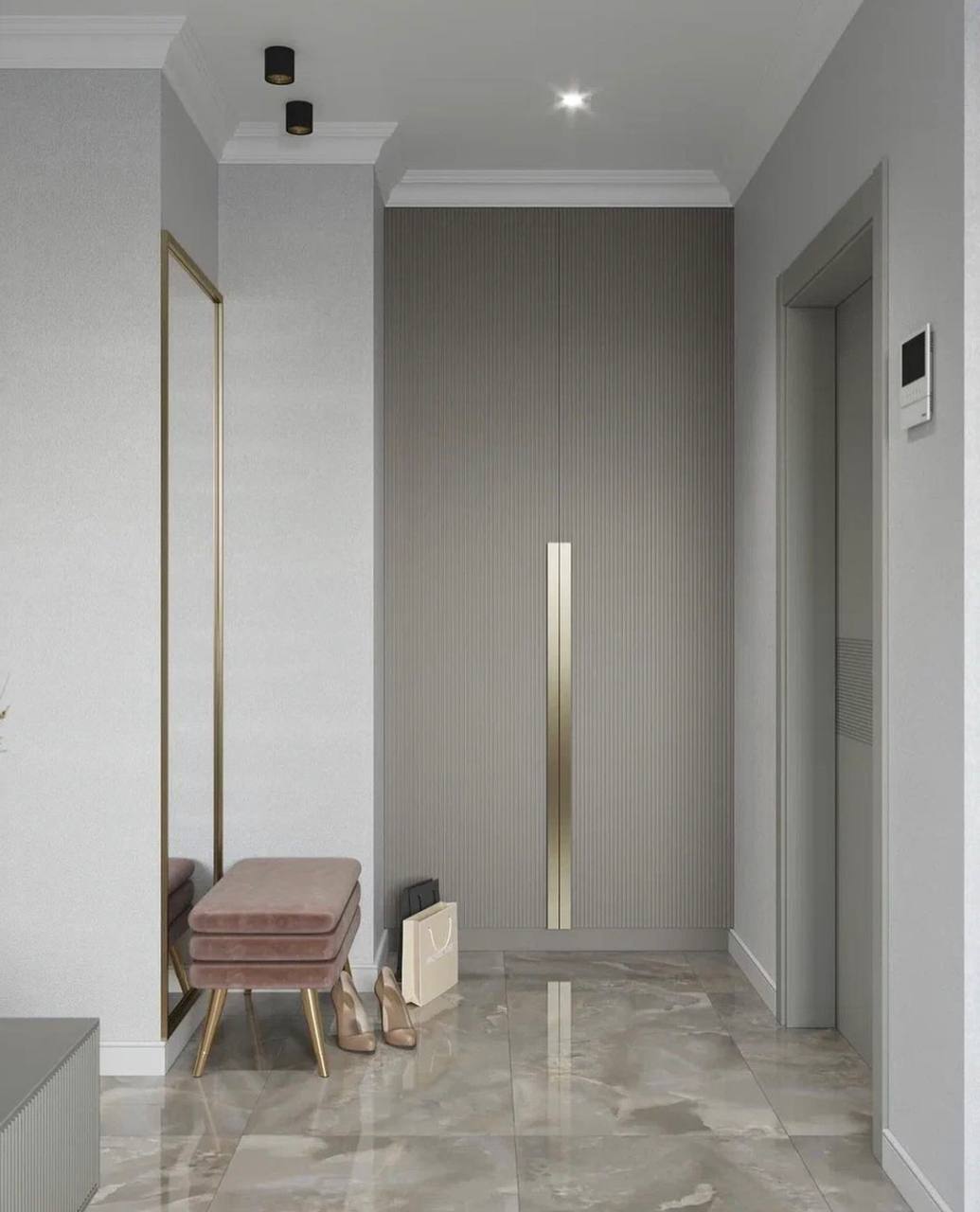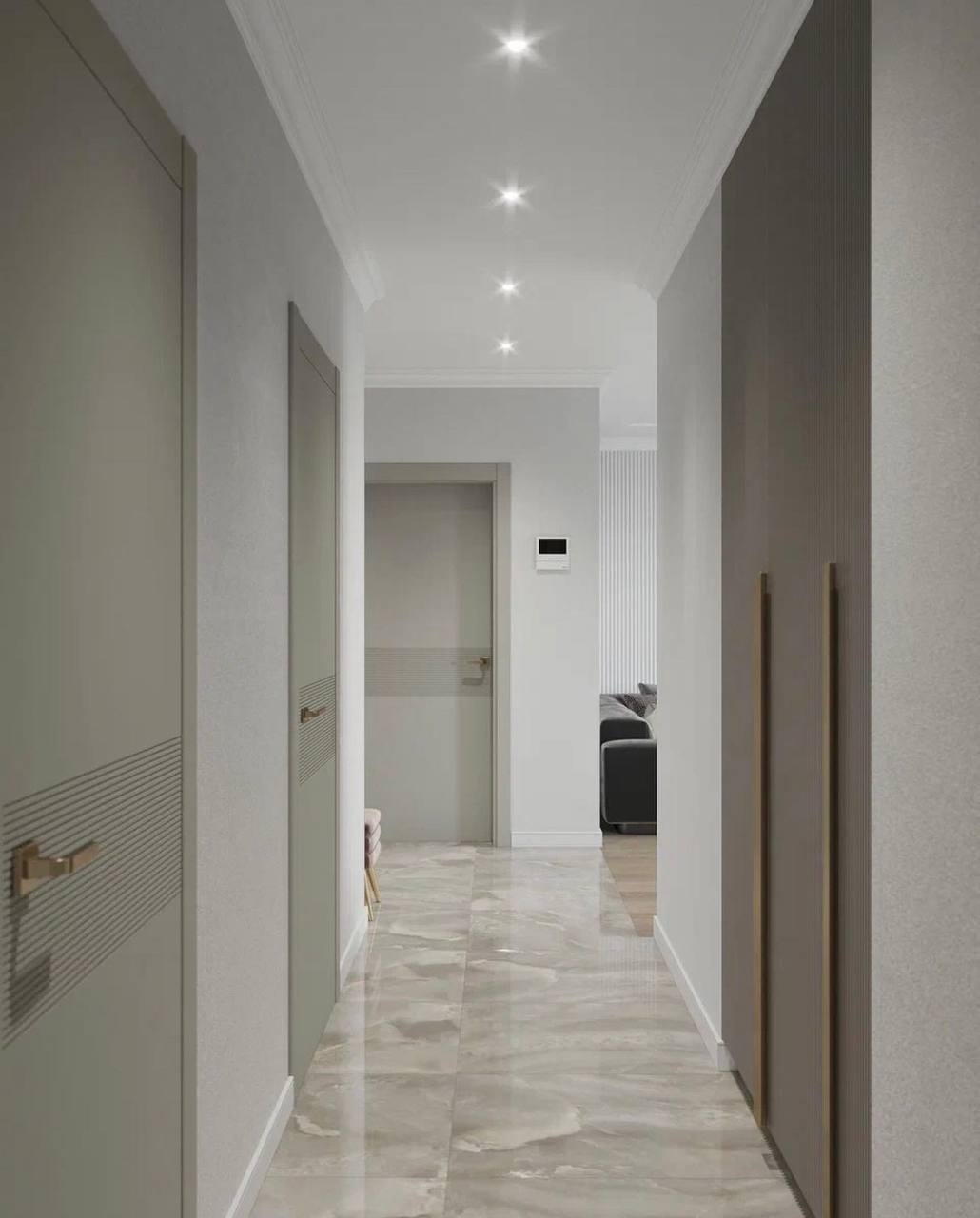 Для проекта была выбрана сдержанная цветовая гамма в серых благородных тонах, присутствуют трендовые рифленые поверхности. Рисунок с бороздками на межкомнатных дверях Mezzo в эмали гармонично перекликается с фасадами шкафов, тумб. Вся композиция выглядит целостной. Акцента и лоска добавляют латунные детали в виде фурнитуры, молдингов на стенах и ножек у мебели.