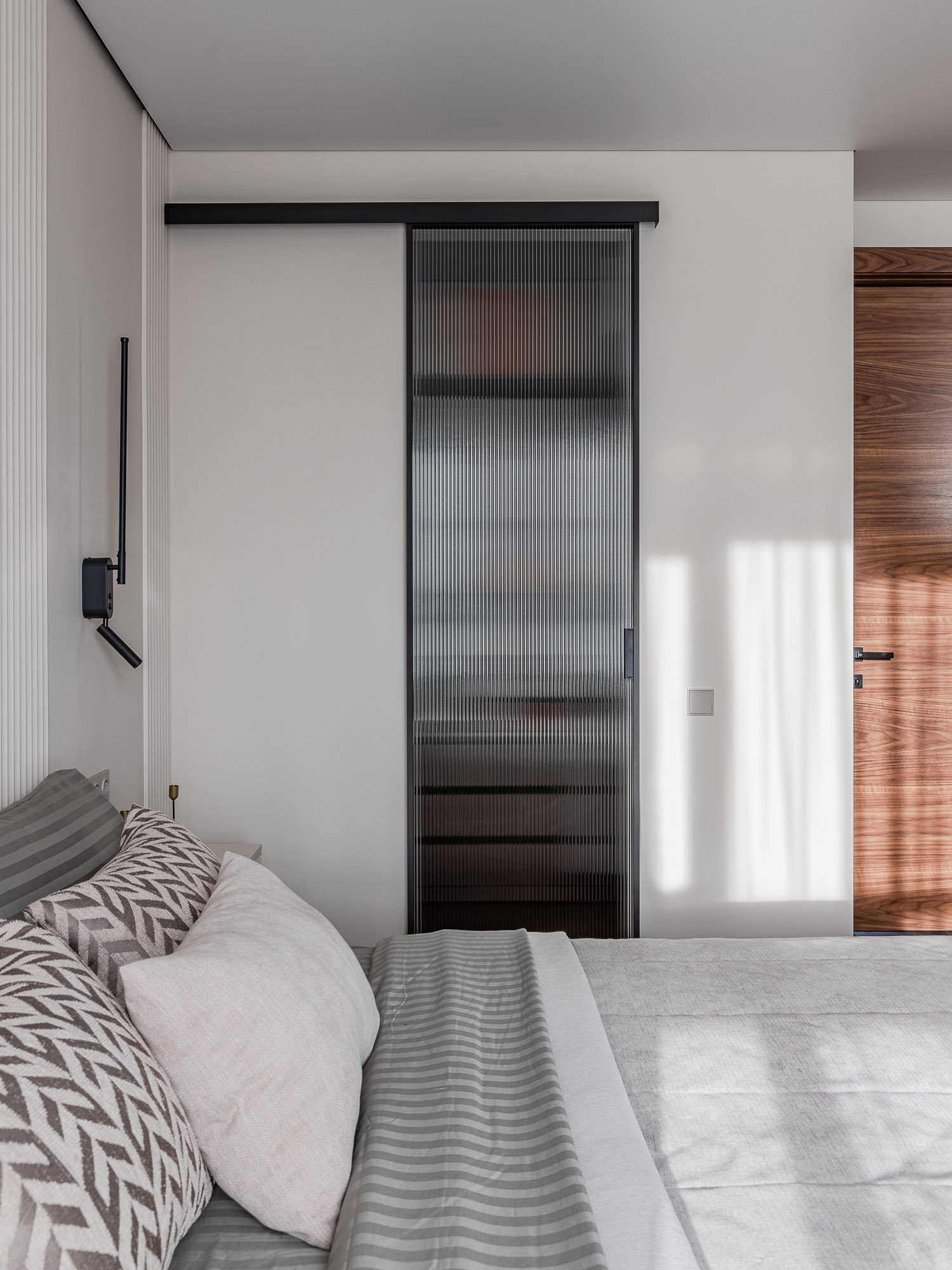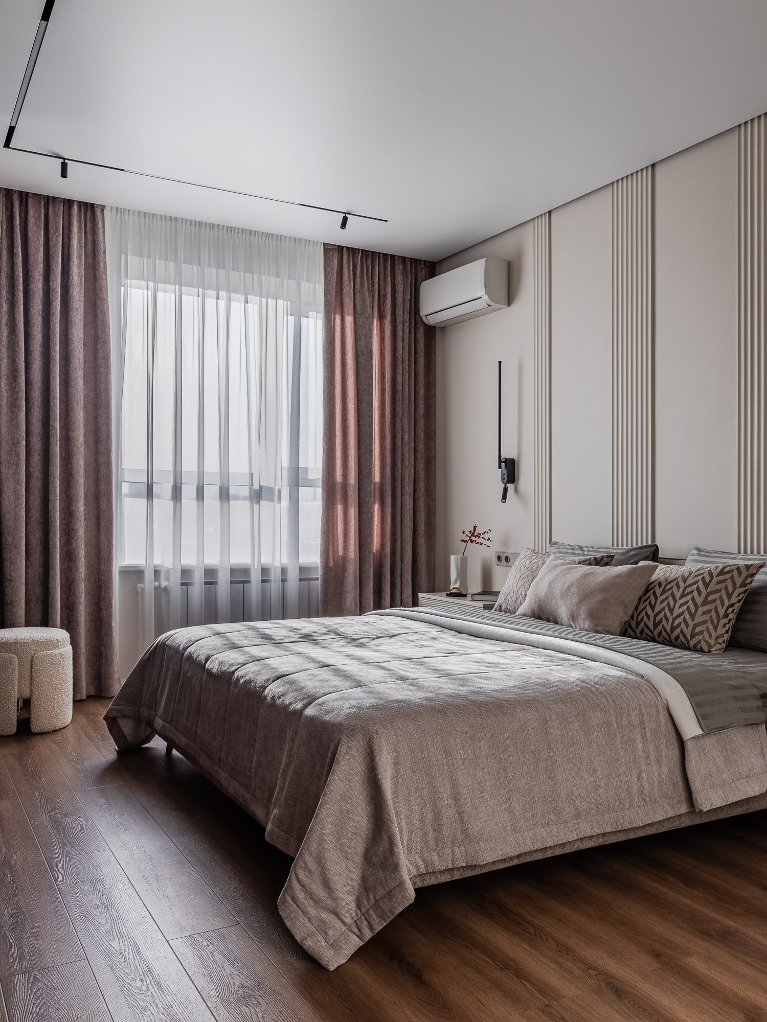 Спальня хозяев украшена элементами из дерева, придающими интерьеру природность и теплый характер. Эти детали делают атмосферу еще более домашней и расслабляющей.