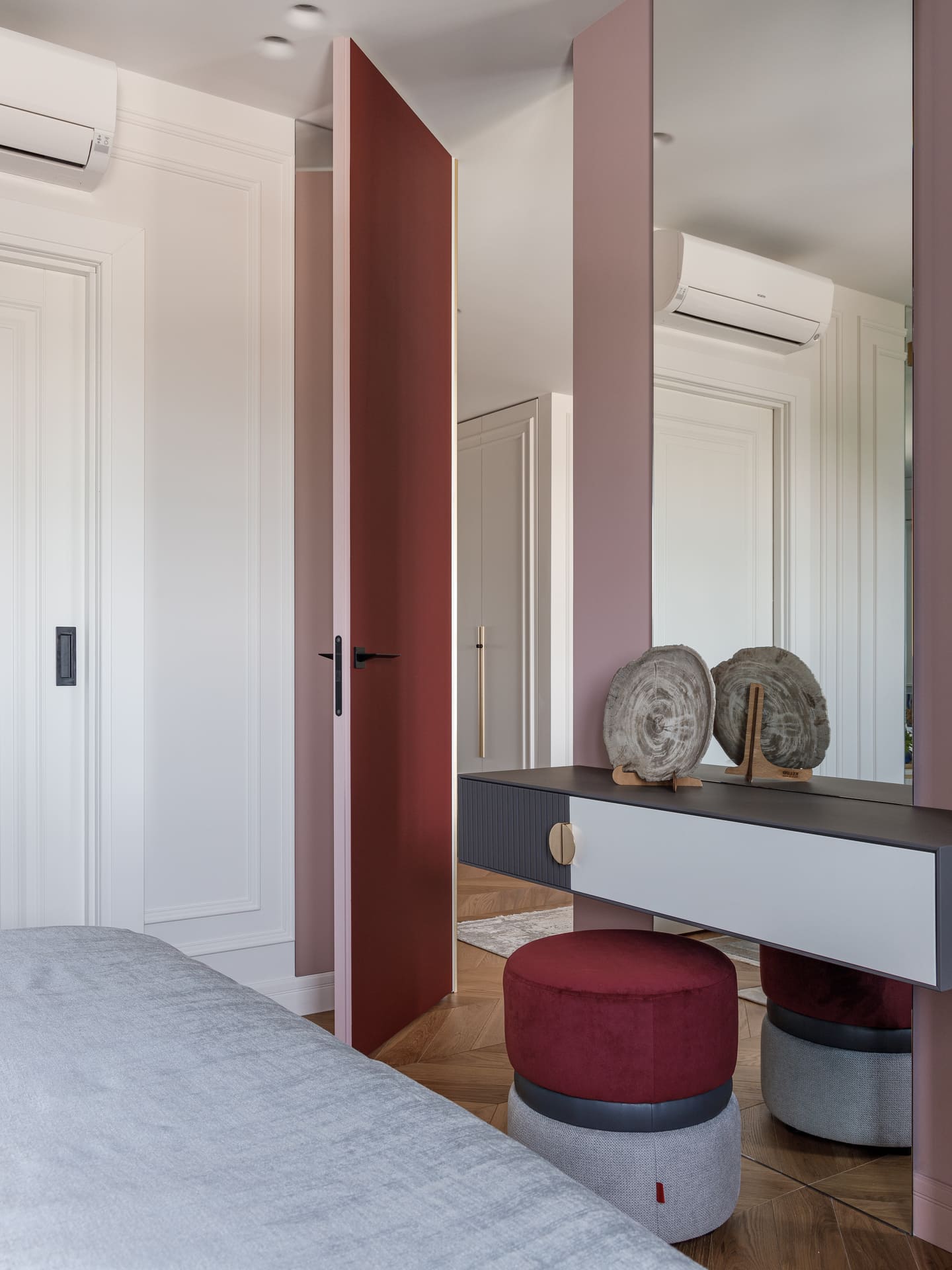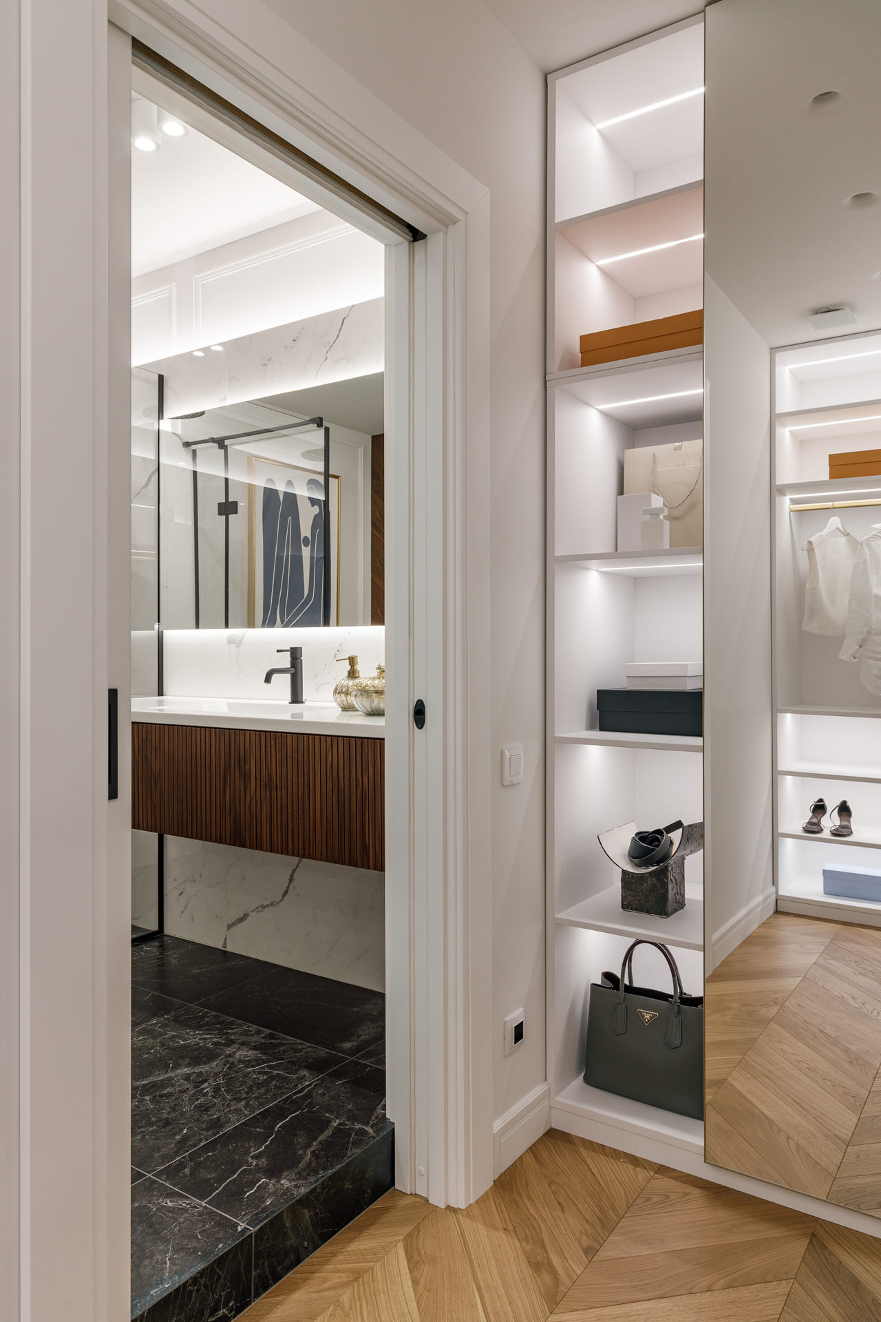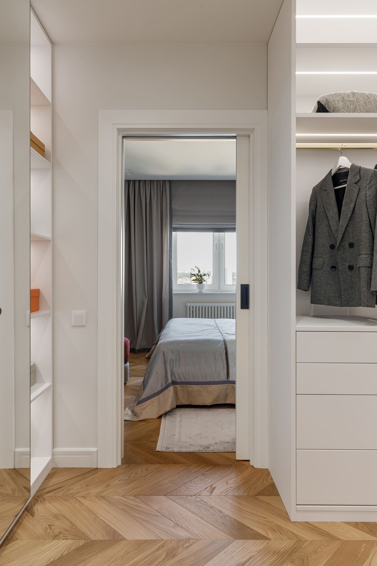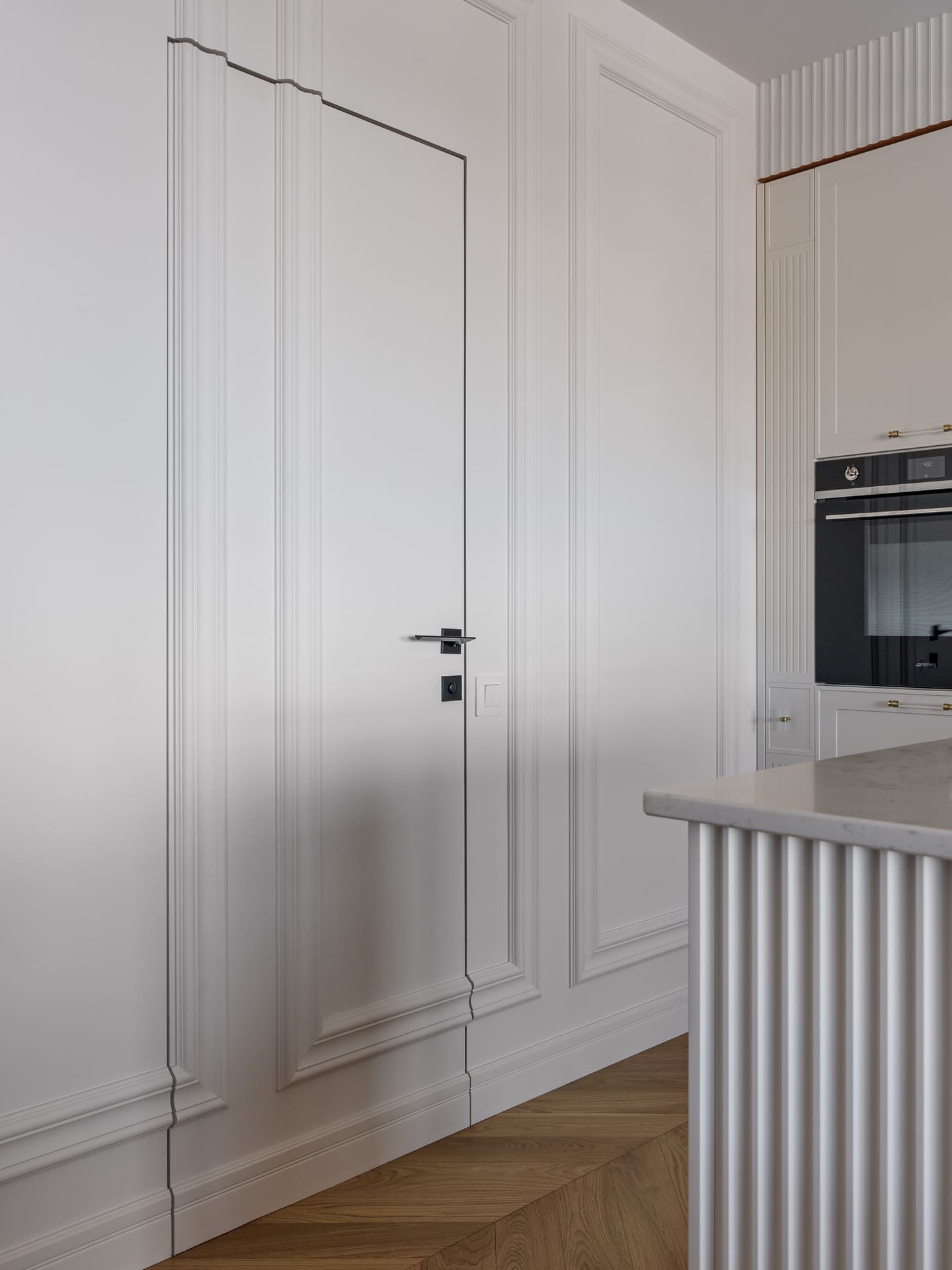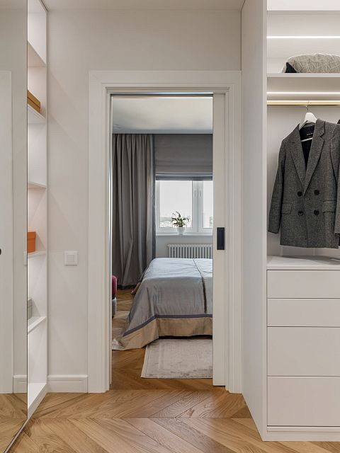 В проекте особое внимание уделено межкомнатным дверям. Двери Elegance 1 и Secret прекрасно вписываются в общий стиль, добавляя нотки изысканности и гармонии. Эти двери не только эффективны с точки зрения функциональности, но и становятся важными элементами декора, которые подчеркивают общую концепцию квартиры.