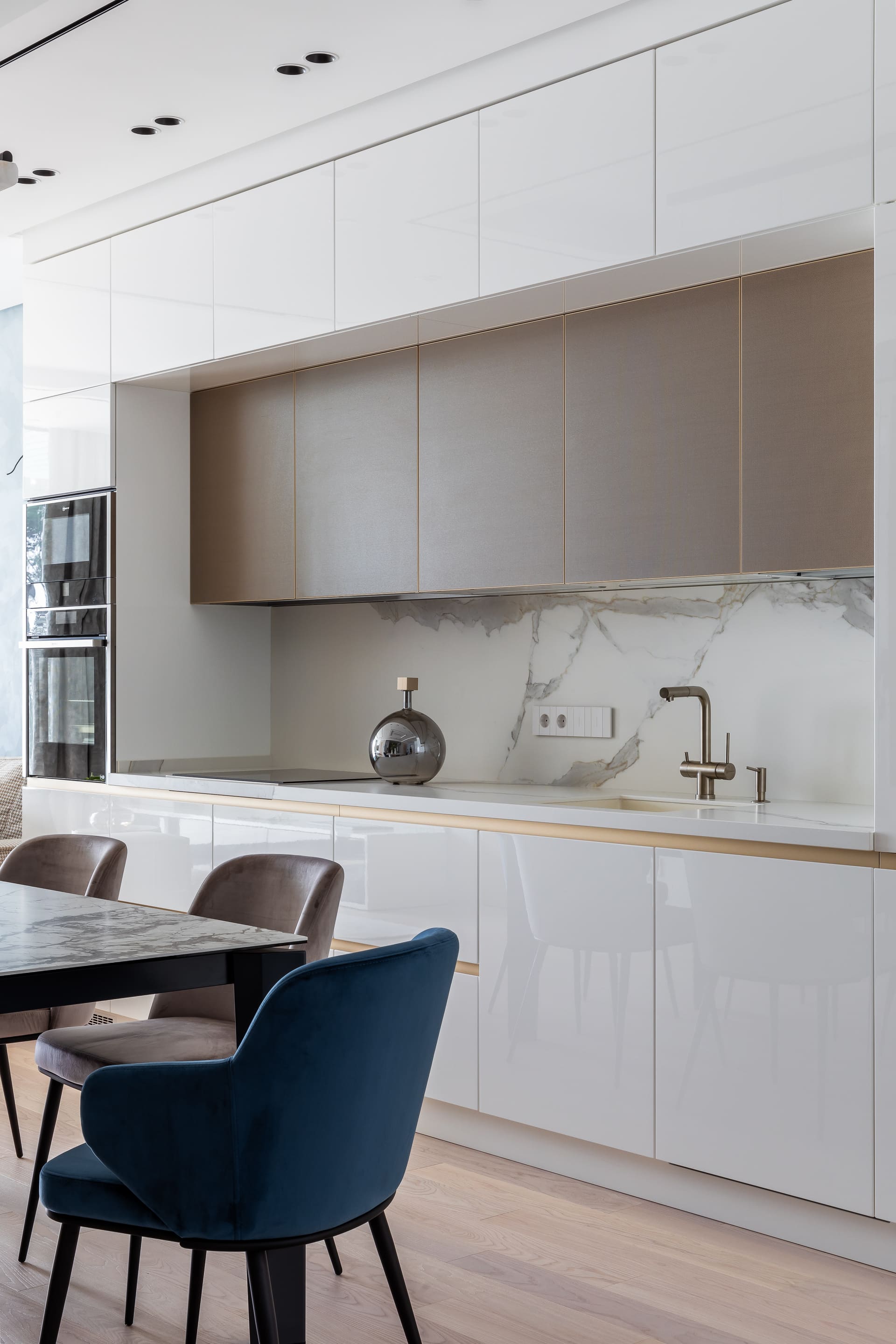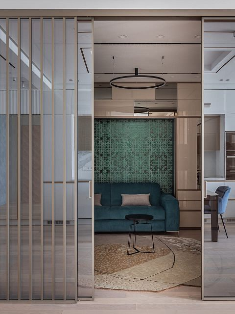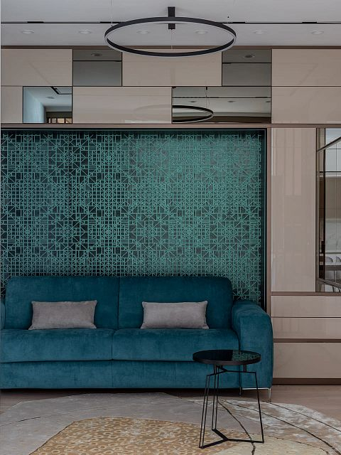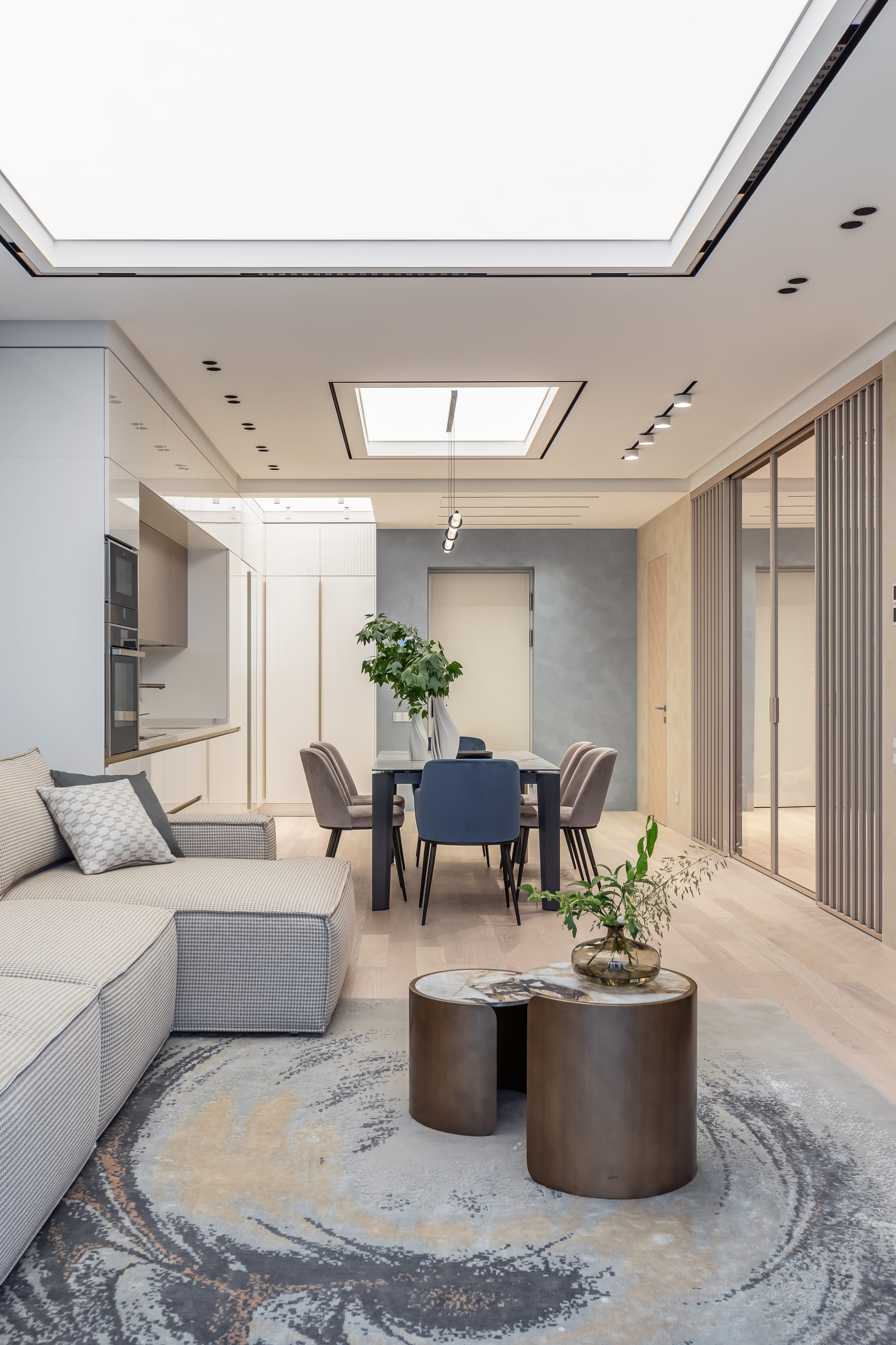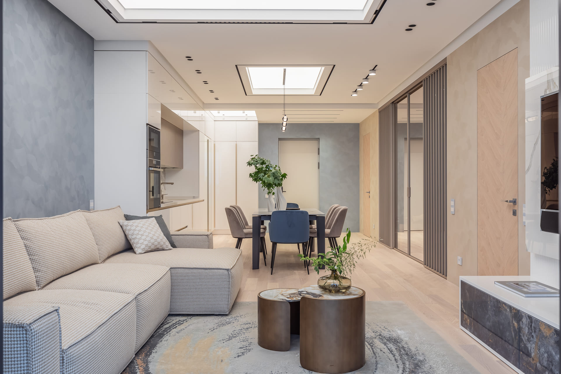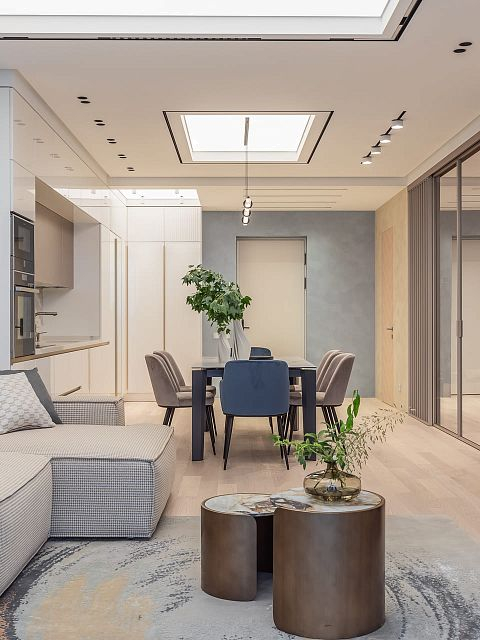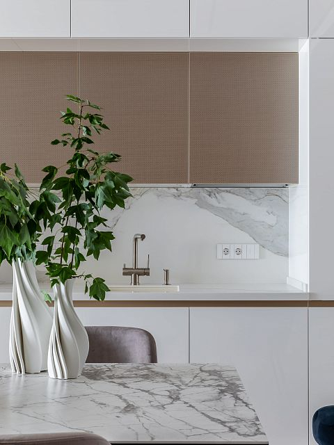 В интерьере преобладают мягкие, естественные оттенки, которые вызывают ассоциации с яркими пейзажами. Теплая цветовая палитра, в которую включены кремовые, песочные и нежные голубые тона, создает атмосферу спокойствия и уюта.