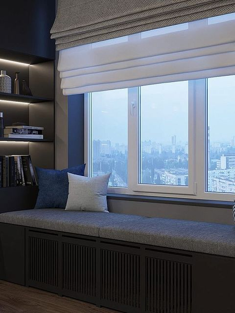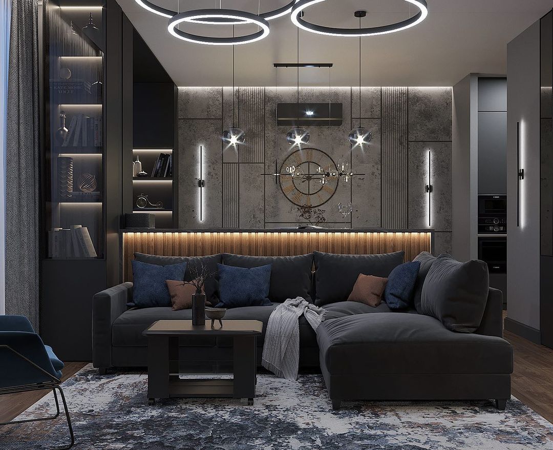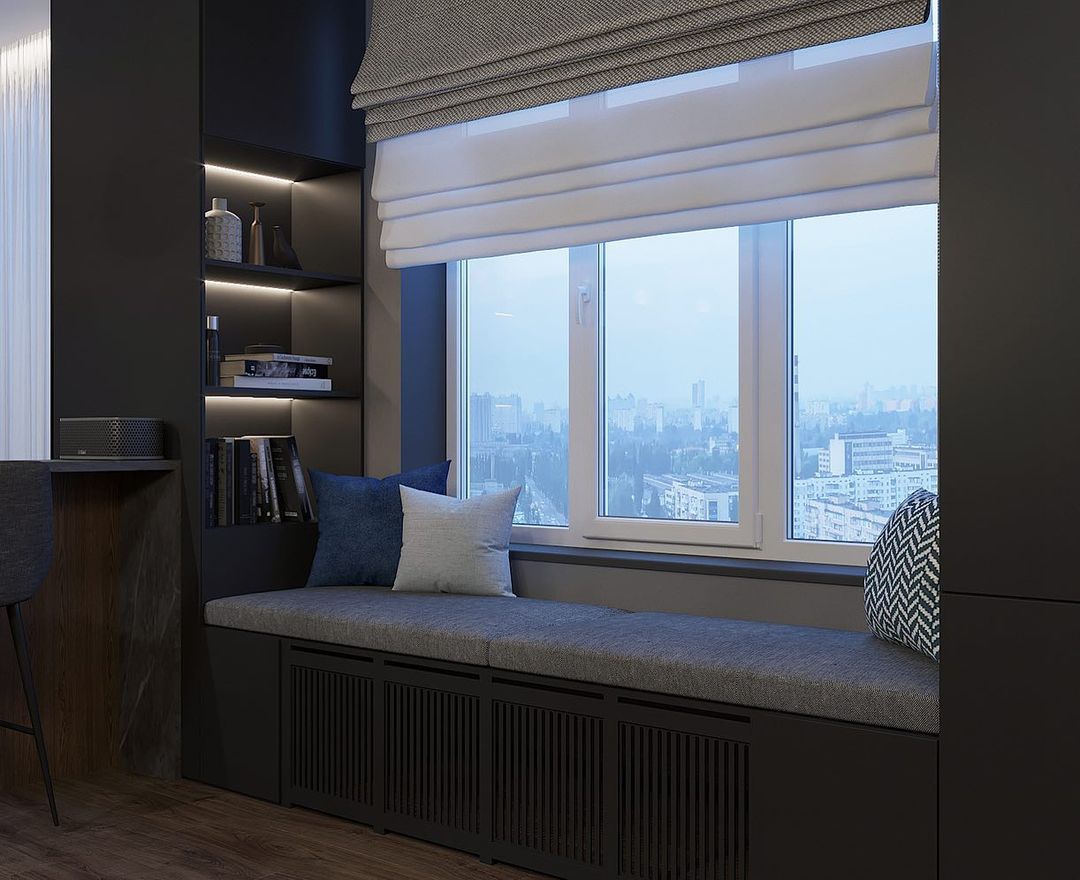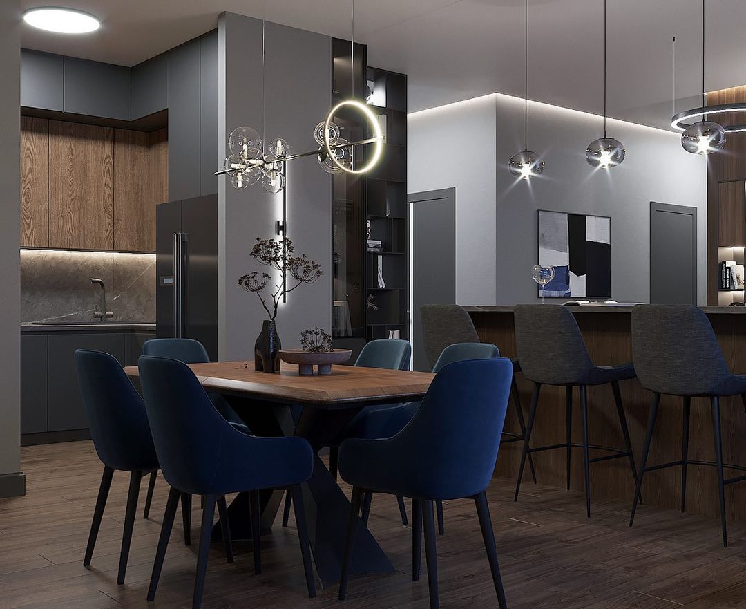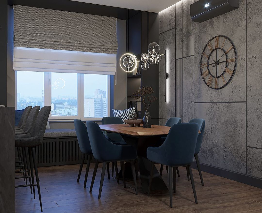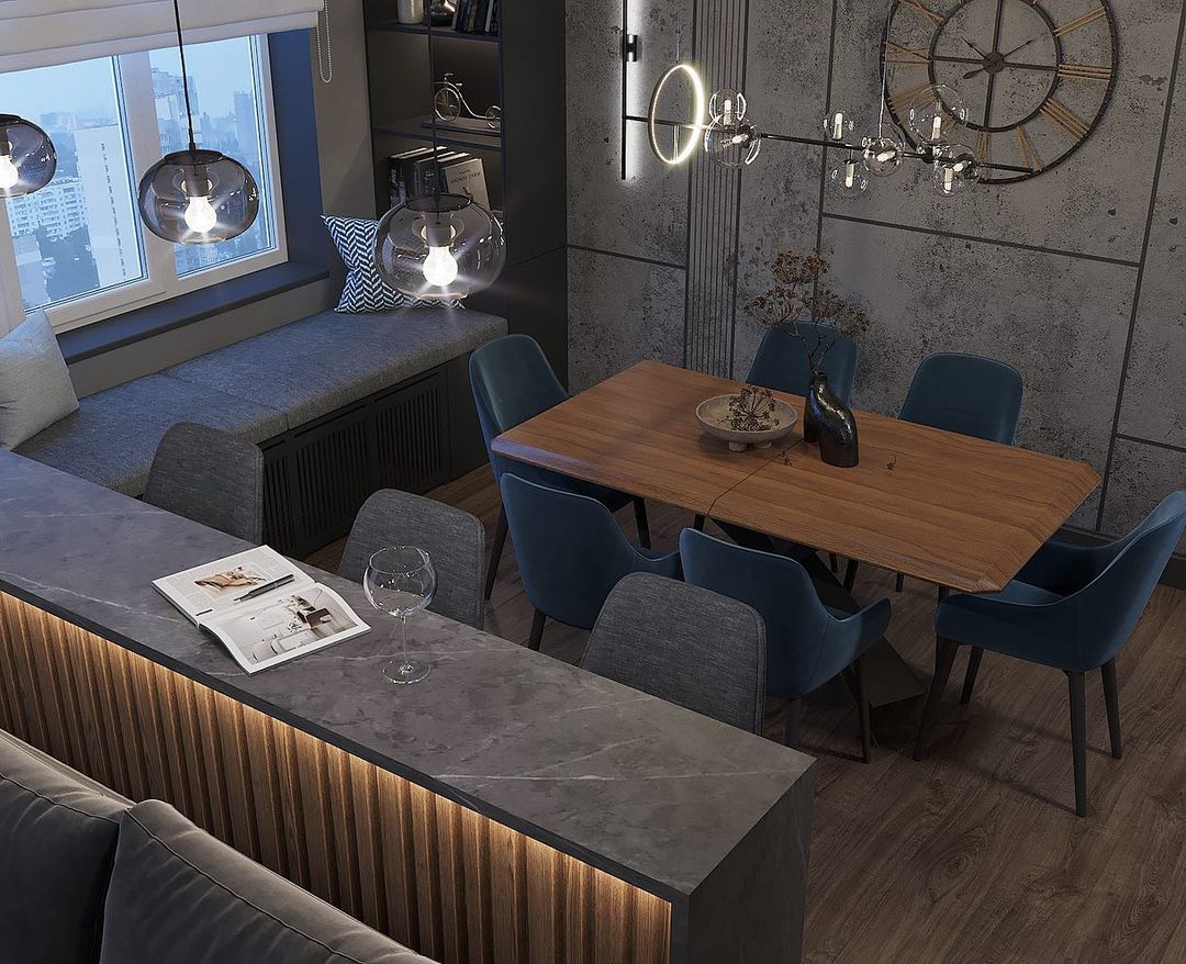 Благодаря грамотной дизайнерской планировке в помещении удалось разместить большой диван с креслом и TV-зоной, барную стойку, большой обеденный стол и мягкую зону для отдыха у окна.