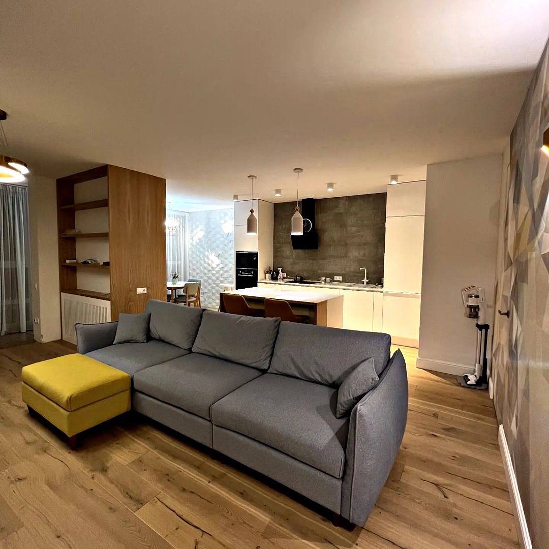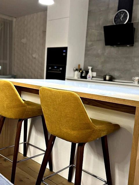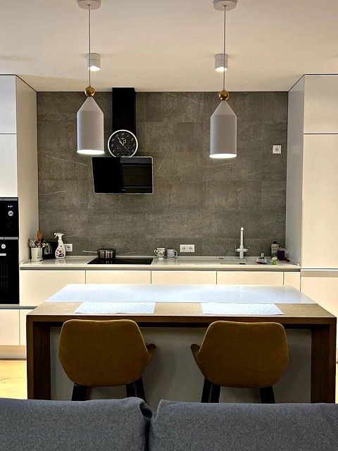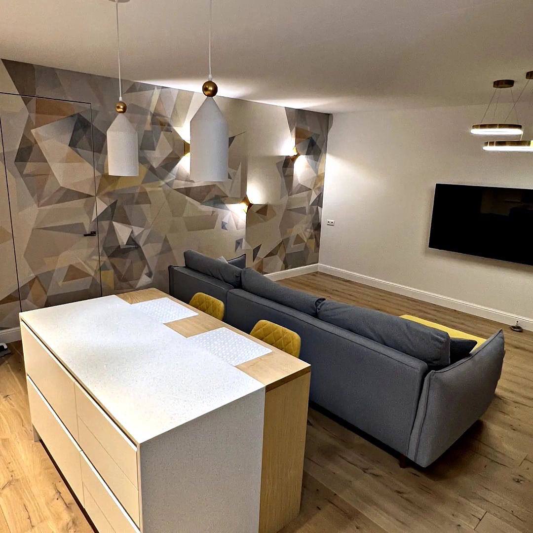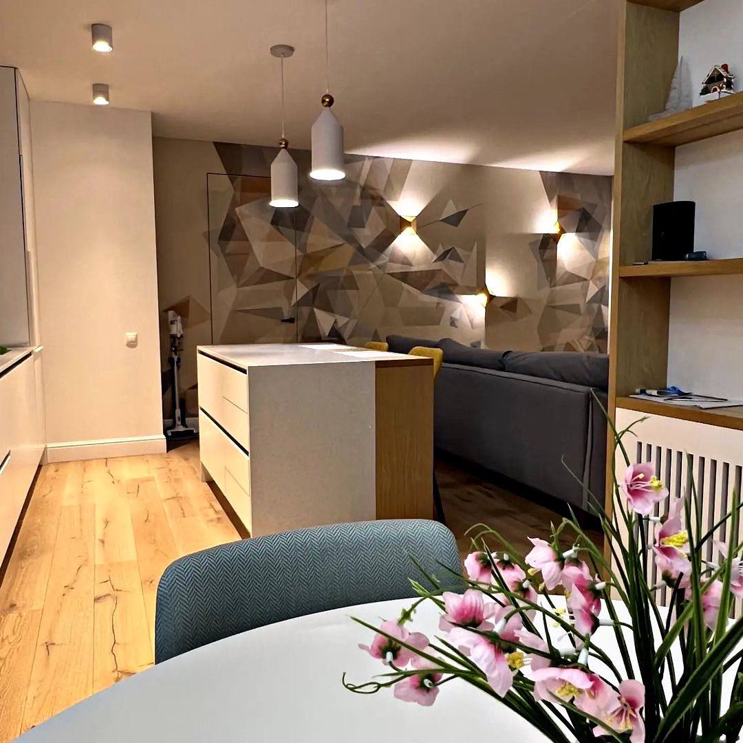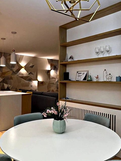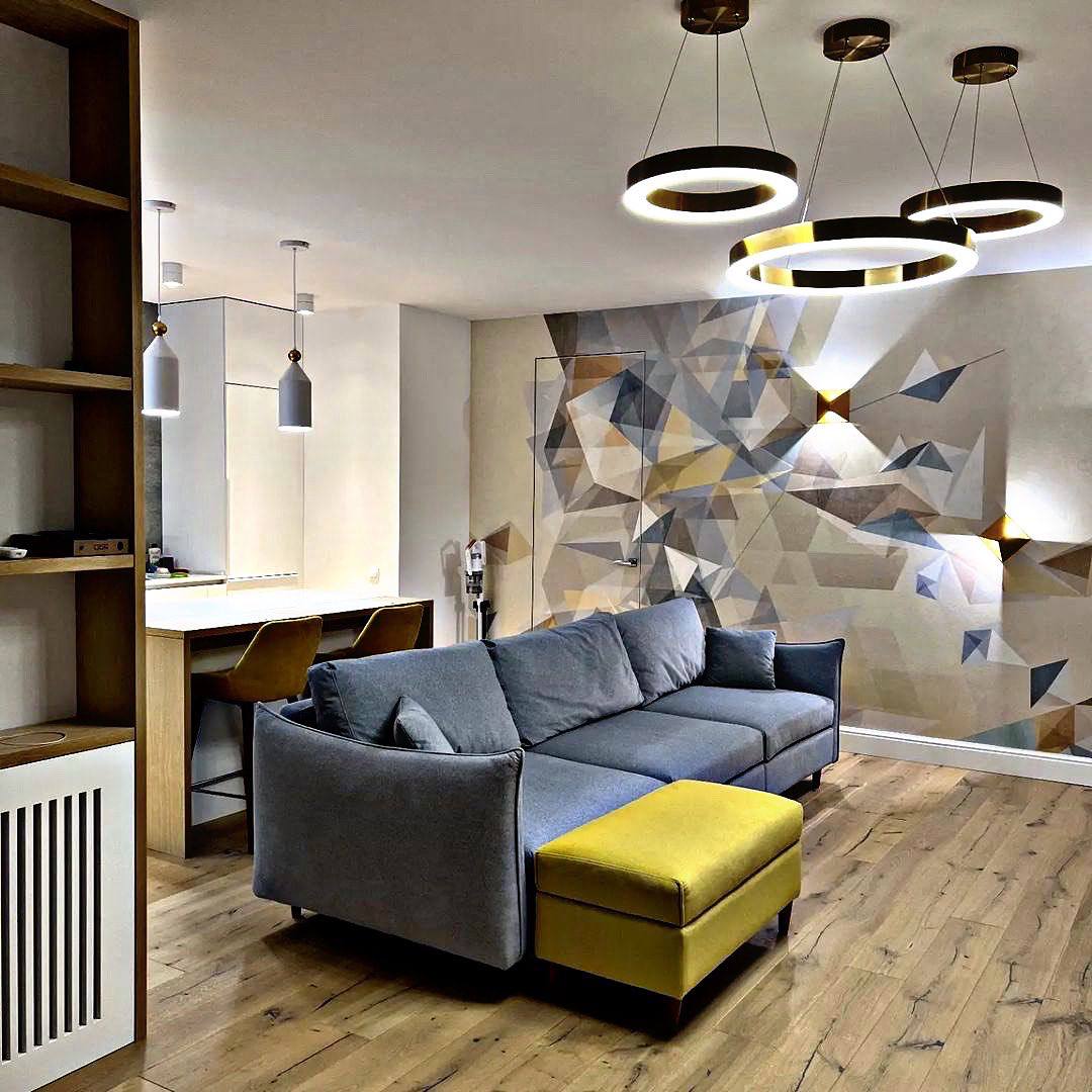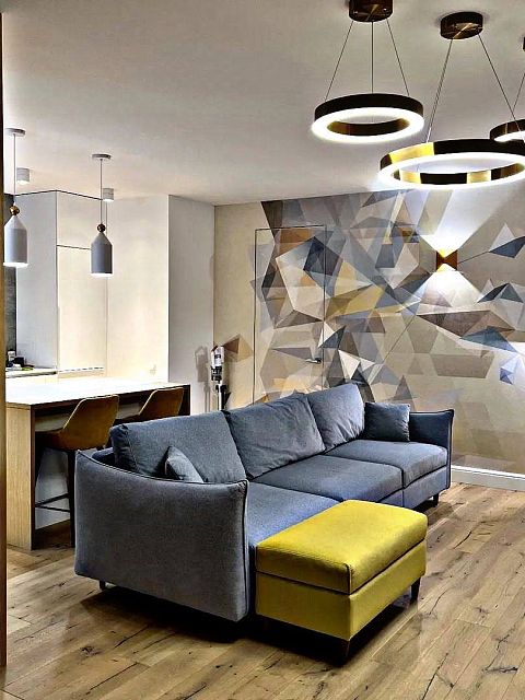 Своему новому проекту дизайнер Ирина Алексеева (г.Уфа) придала выразительности в первую очередь за счет яркой стены с геометрическим рисунком и стильных светильников в монохромной отделке. Использование дверей скрытого монтажа от фабрики Terem позволило сделать акцент на интересные дизайнерские задумки, а пространство более легким и графичным.