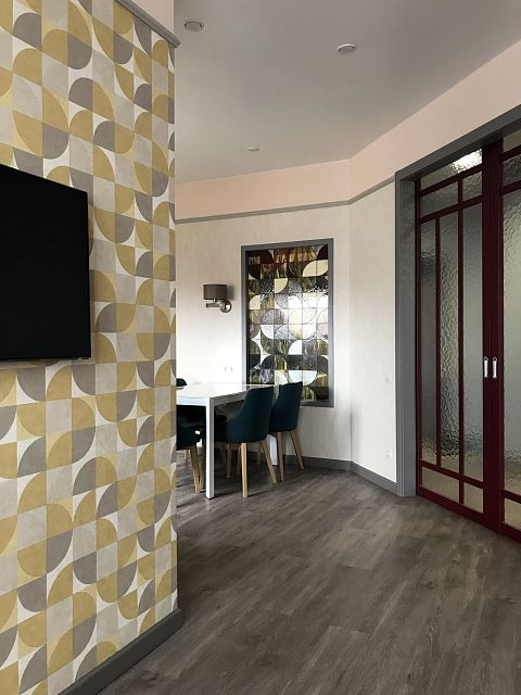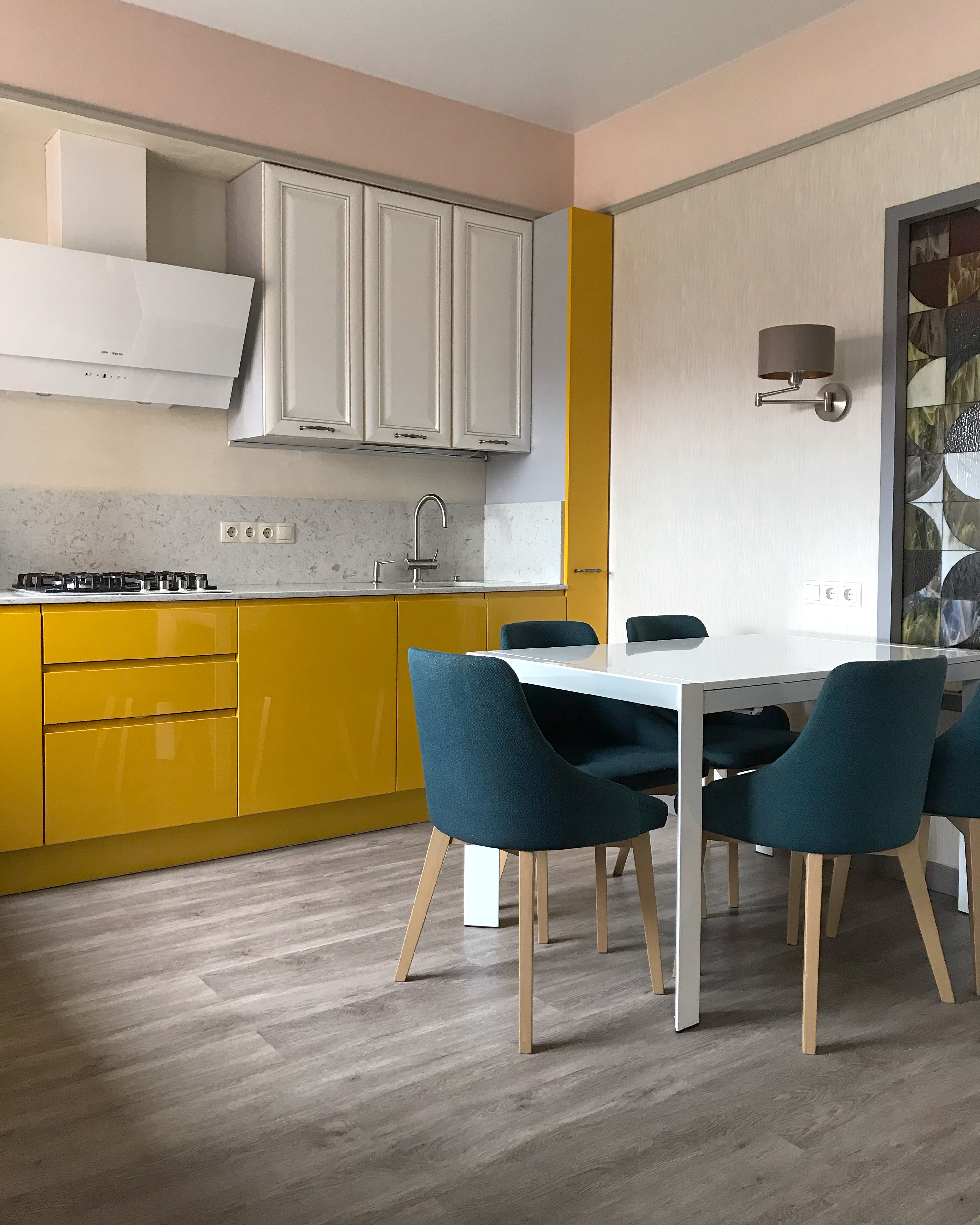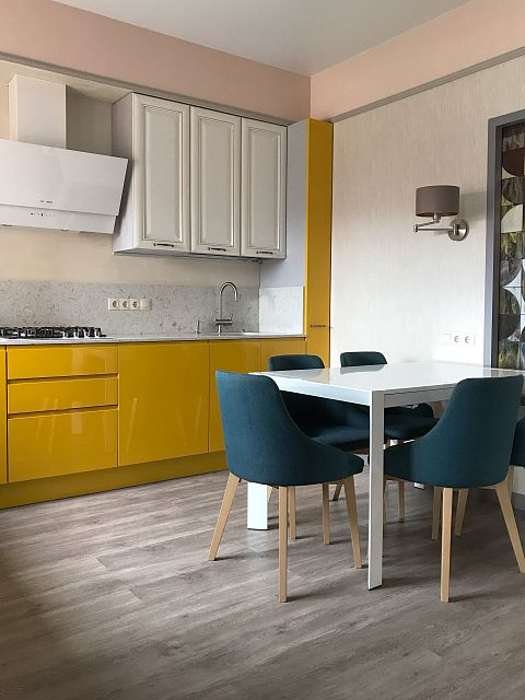 В кухне-гостиной главный акцент на кухонный гарнитур. Глянцевые фасады тёплого жёлтого оттенка создают ощущение солнечного дня в любую погоду. Витраж, выполненный по моим эскизам, позволяет проходить свету в прихожую и эффектно смотрится даже без подсветки.