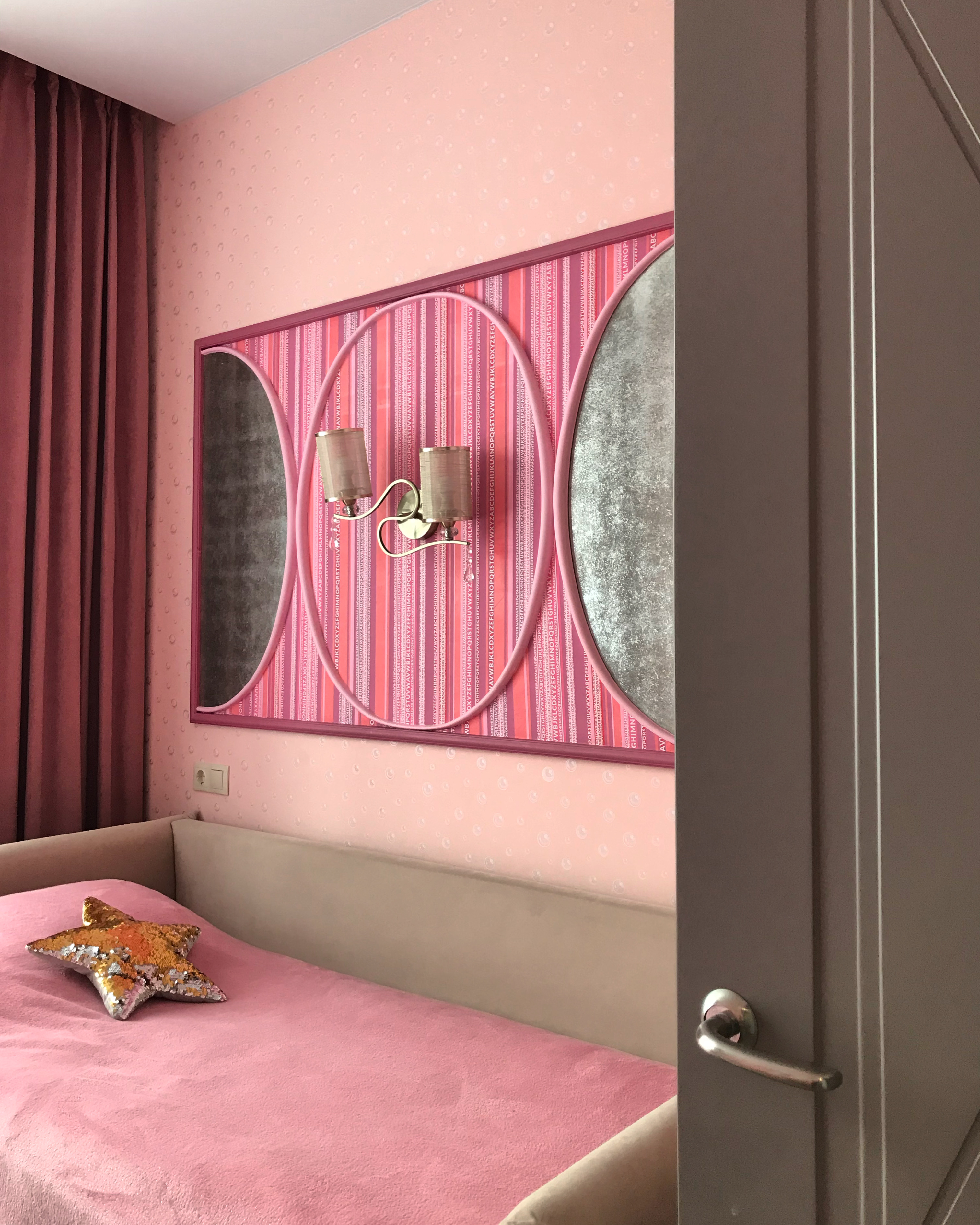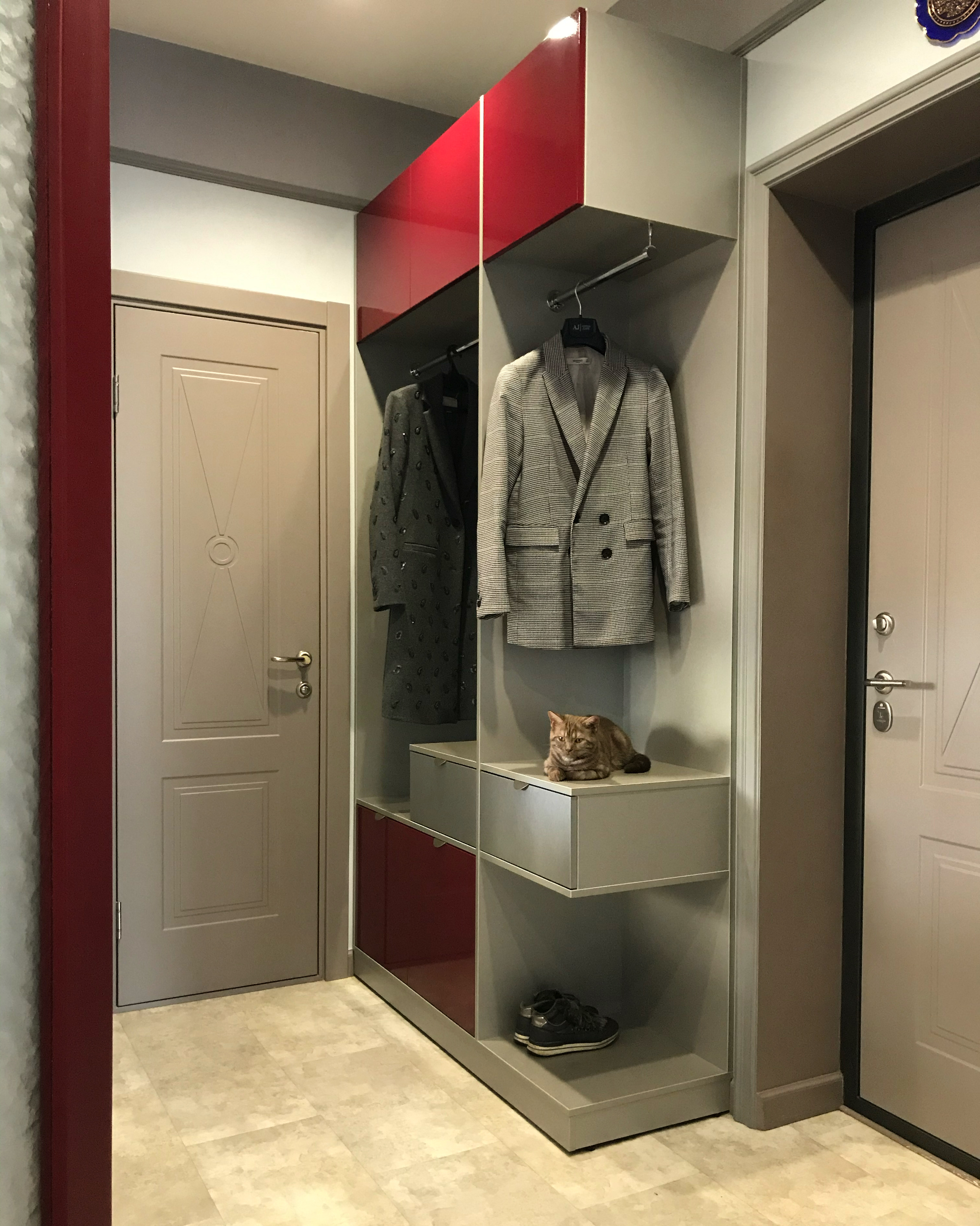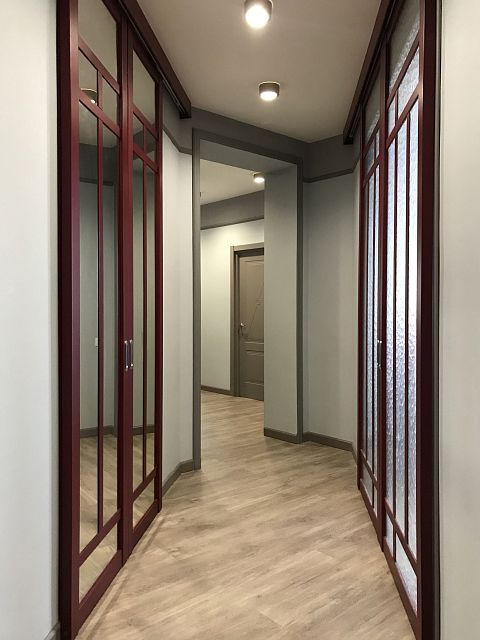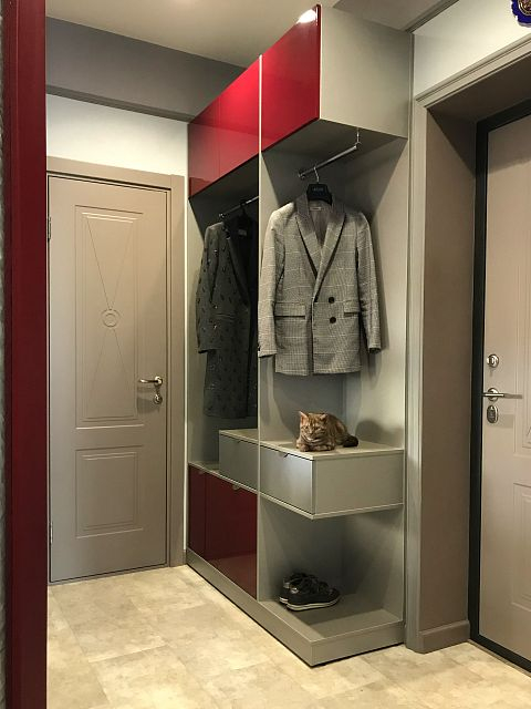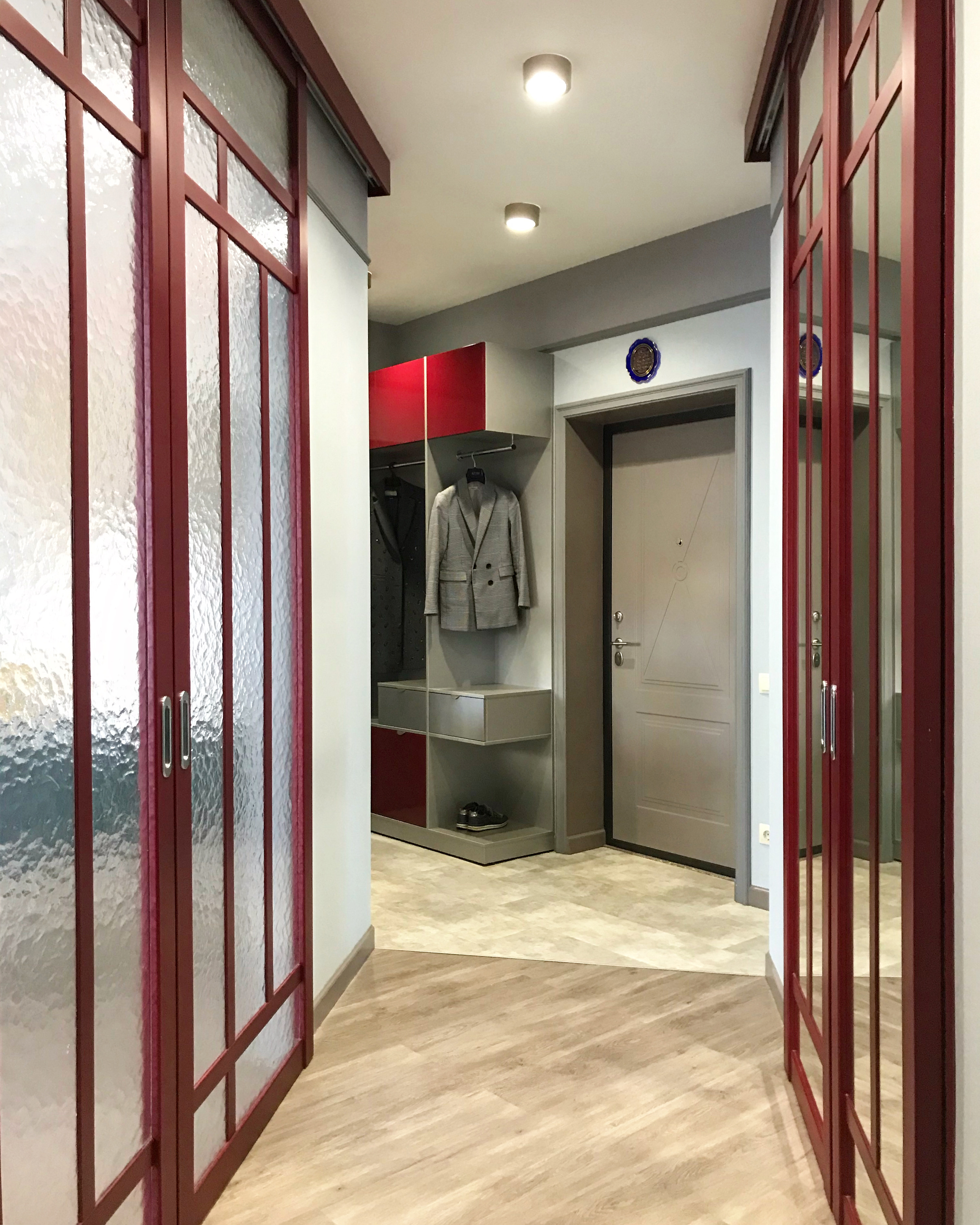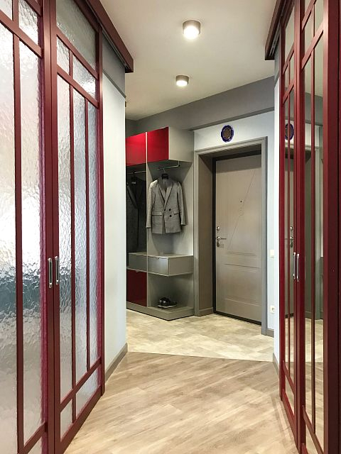 В итоге выбор заказчиков пал на оригинальное дверное полотно модели Marko 2 из коллекции Fusion, также по эскизам дизайнера изготовлены межкомнатные перегородки, насыщенного ягодного цвета.