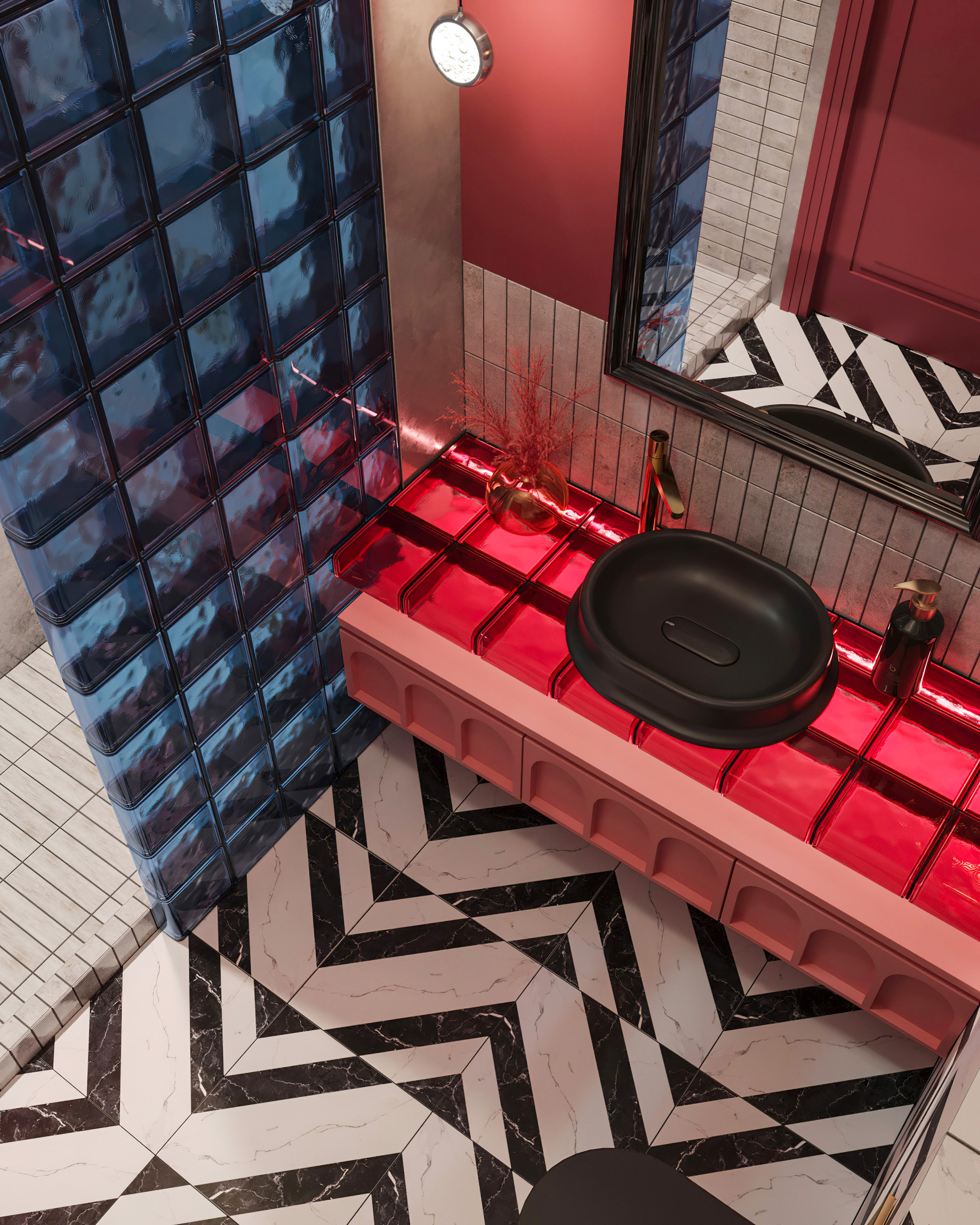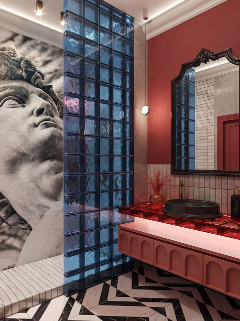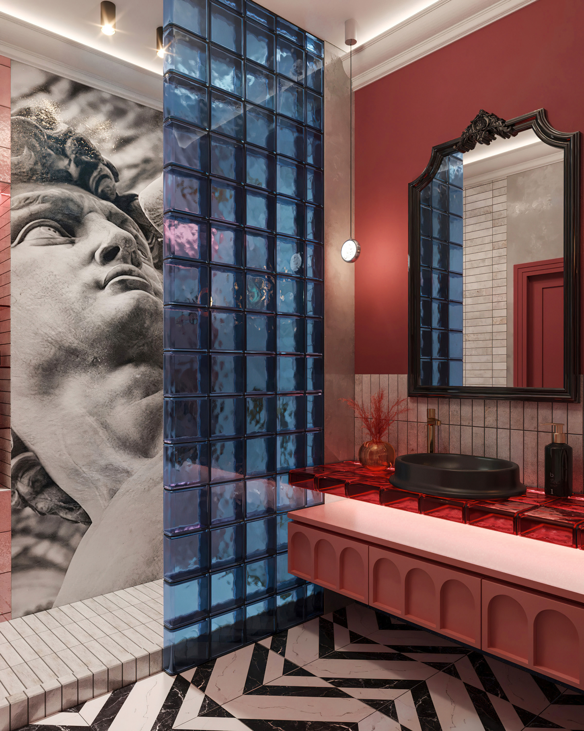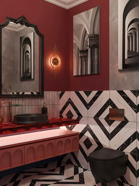Санузел продолжает концепцию прихожей, делая акцент на оригинальные и нестандартные решения. Здесь можно увидеть смелые сочетания текстур, например, глянцевые и матовые поверхности, которые создают эффектный визуальный контраст. Зонирование пространства осуществляется с помощью оригинальных элементов декора, которые не только придают уникальность, но и делают функциональность максимально удобной.