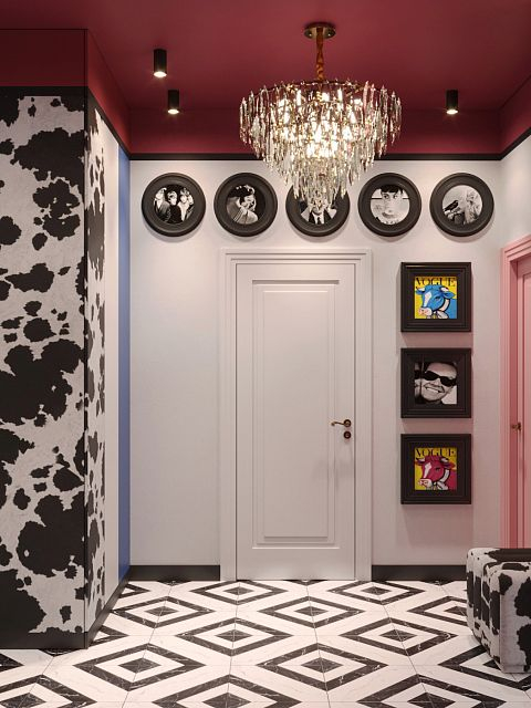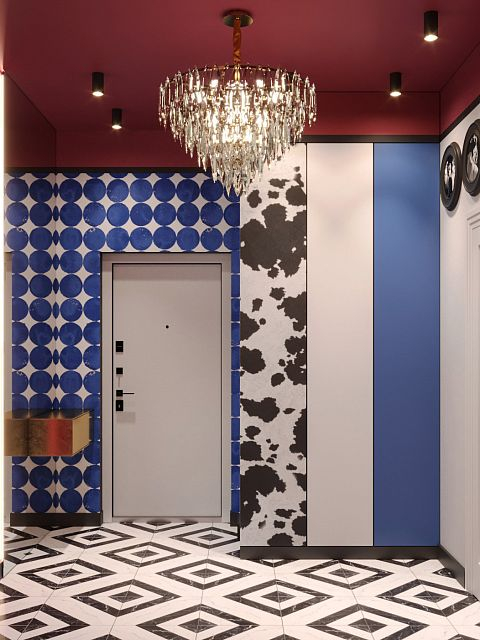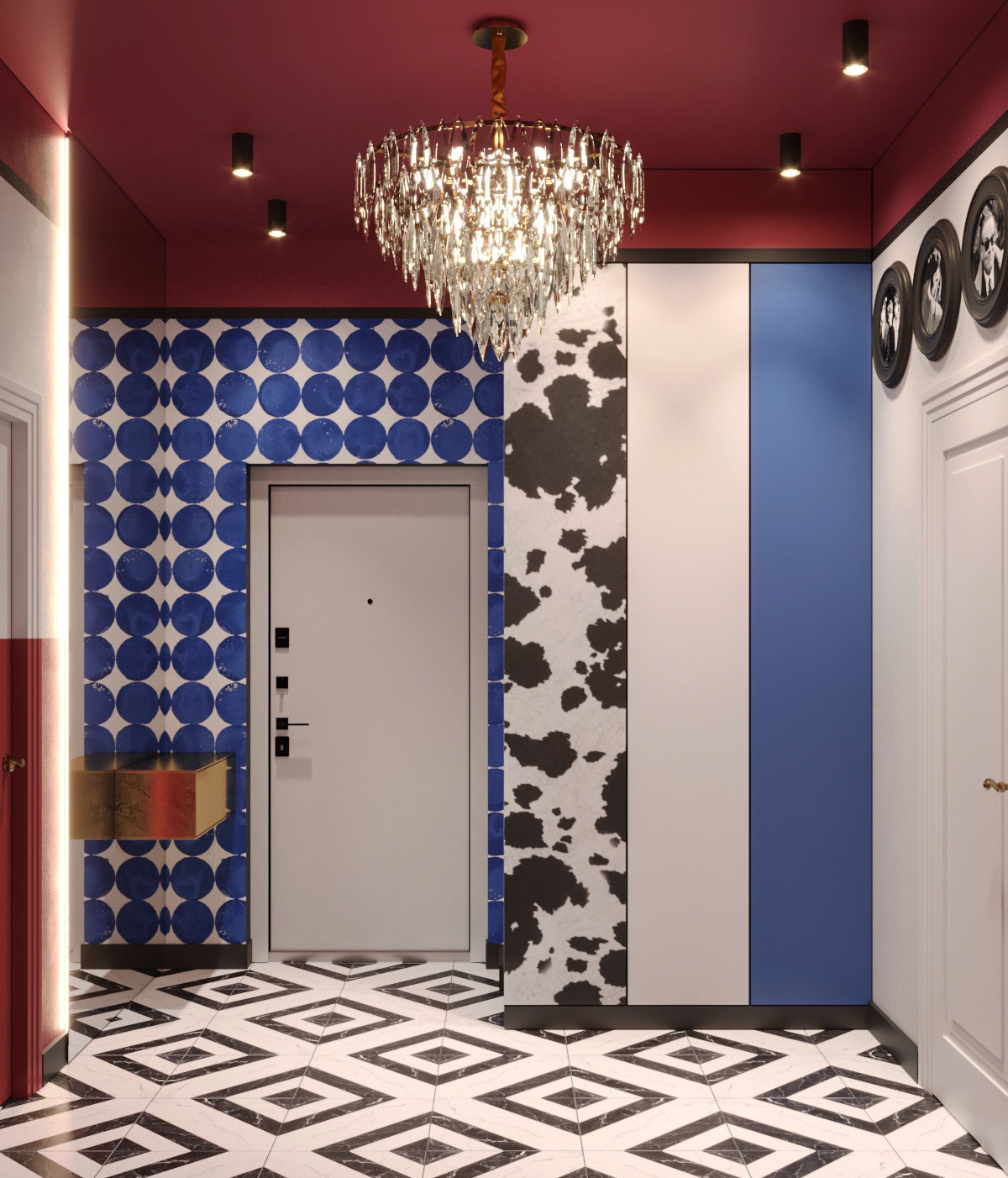 Входная зона встречает гостей насыщенной бардовой палитрой, которая создает чувство уюта и тепла. Яркие акценты синего цвета используются в декоре, добавляя интерьеру нотки современности и креативности.