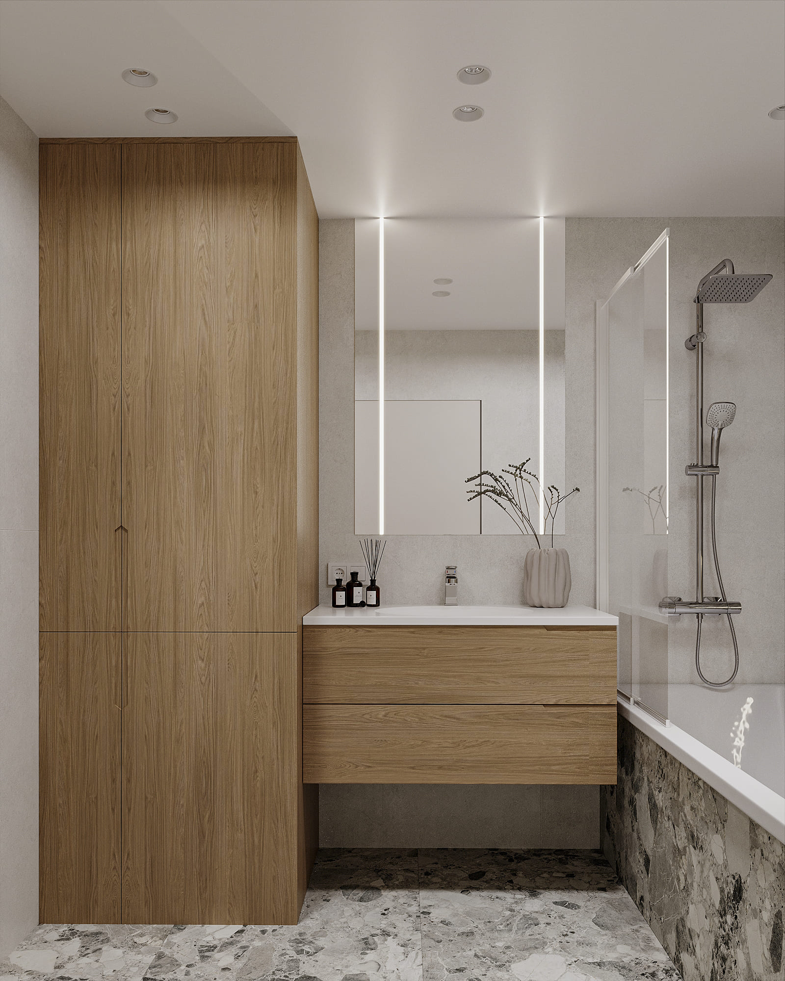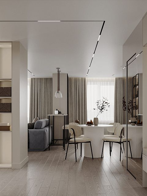Интерьер наполнен светом и воздухом, что способствует ощущению простора, несмотря на размеры квартиры. Такой проект демонстрирует, как можно гармонично сочетать современные решения с теплотой домашнего уюта, создавая комфортное жилое пространство для всего семейного счастья.