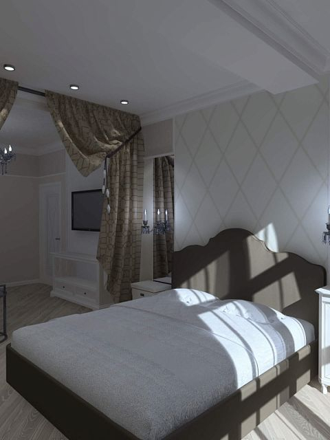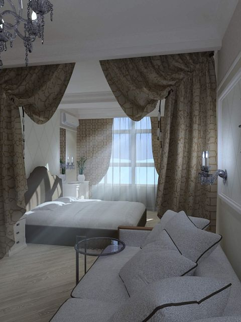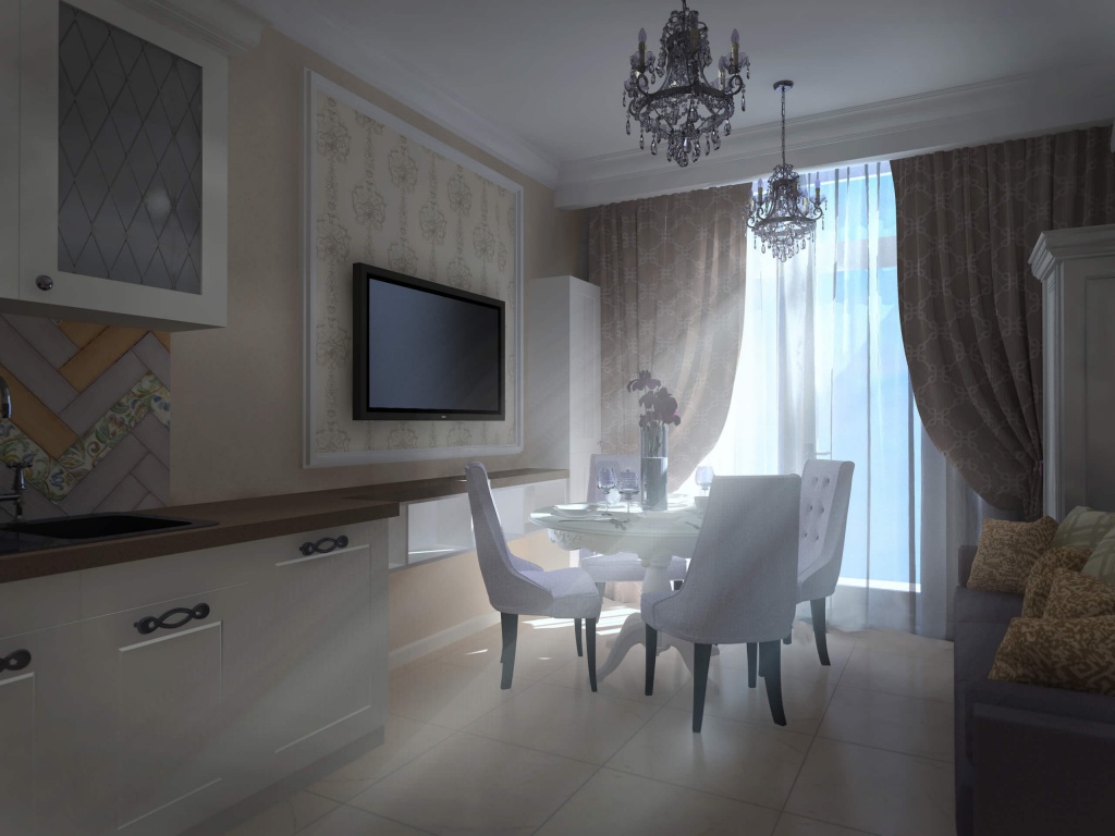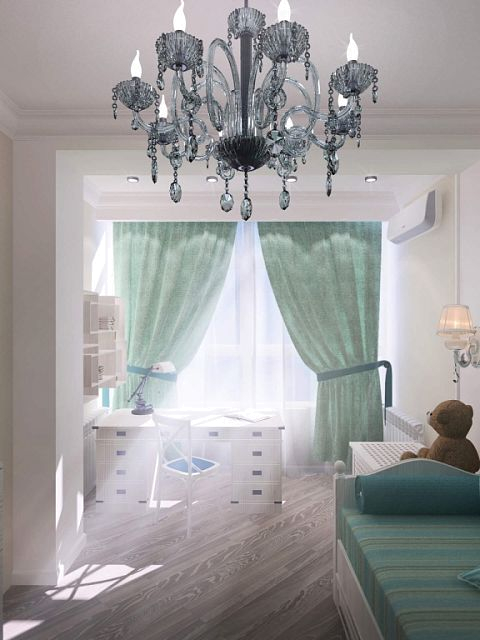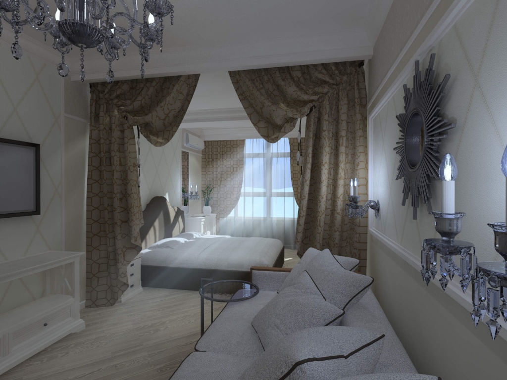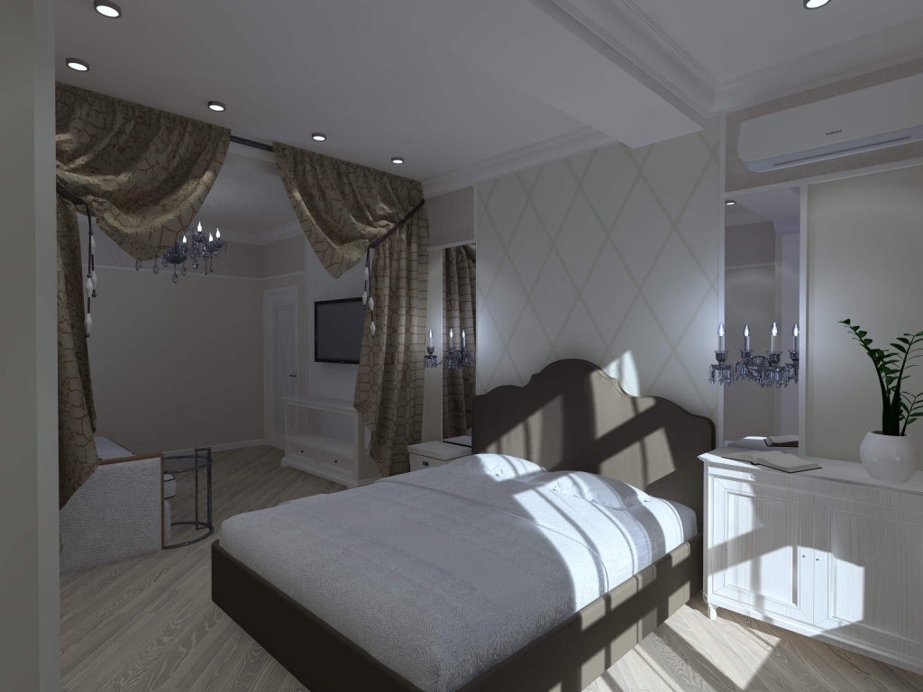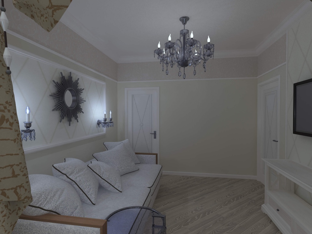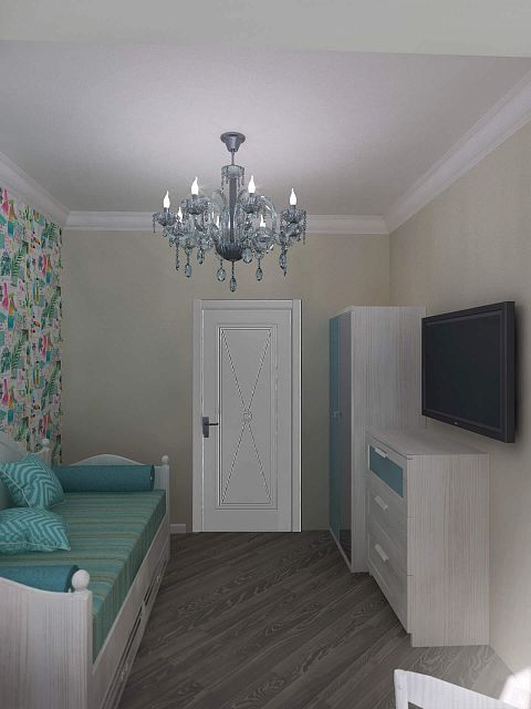 Двухкомнатная квартира с большой кухней была приобретена семьей из трёх человек с дочерью дошкольного возраста для собственного проживания. Но при этом необходимо мыло учесть размещение друзей и родственников, приезжающих в гости на лето. Поэтому в квартире была выполнена существенная перепланировка. Одну комнату (детскую) мы чуть уменьшили, отдав эту площадь прихожей для создания двух вместительных шкафов. В спальной хозяев отделили небольшой собственный санузел. Прихожая не осталась тёмной благодаря двустворчатым дверям с матовым стеклом, ведущим в кухню-столовую. Изначально заказчики хотели уменьшить детскую и сделать гардеробную. Но при этом решении детская значительно уменьшалась бы по площади. Новая планировка создала места хранения в прихожей без ущерба для детской. Спальная хозяев изначально имела вытянутую форму. Мы воспользовались этим и разбили её на две зоны: кровать и гостиная с диваном и телевизором. Отделили их шторой на случай если гости или родственники будут спать на диване (ничего не поделаешь, это специфика курортного города).
