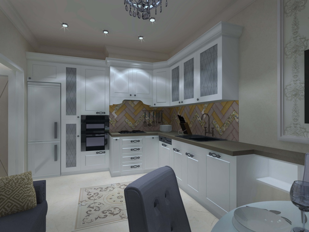 Для этой квартиры мы выбрали дверные полотна Marko 1 – одни из моих самых любимых – в белой эмали. Двухстворчатая дверь в кухню-столовую с матовым стеклом. Двери взяли стандартной высоты, с наличниками и доборами. Эта модель дверей стильная, заметная, диагонали придают ей солидности. Но в то же время дверь не настолько пафосная, чтобы подойти только в классические интерьеры. Единственное «но»: минимализм, лофт, хай-тек не для неё. Для кухни-столовой и комнат мы выбрали классические люстры с хрусталем. Они отлично подошли и к кухне и к рисунку обоев и к дверям.