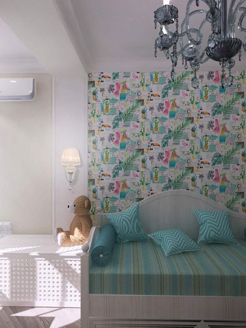 Целью было создать светлый интерьер в стиле «современная классика» с применением обоев на стенах, керамогранитом под мрамор сатуарио на полу в кухне и санузлах, ламинатом в комнатах, натяжными белыми матовыми потолками. Очень нарядной получилась кухня из белой немецкой плёнки с патиной а также сочетание рисунков обоев в столовой зоне. В детской комнате мы добавили цвета благодаря «веселым» обоям imaginarium, которые внесли нотку бирюзового цвета и ярких модных принтов в квартиру.