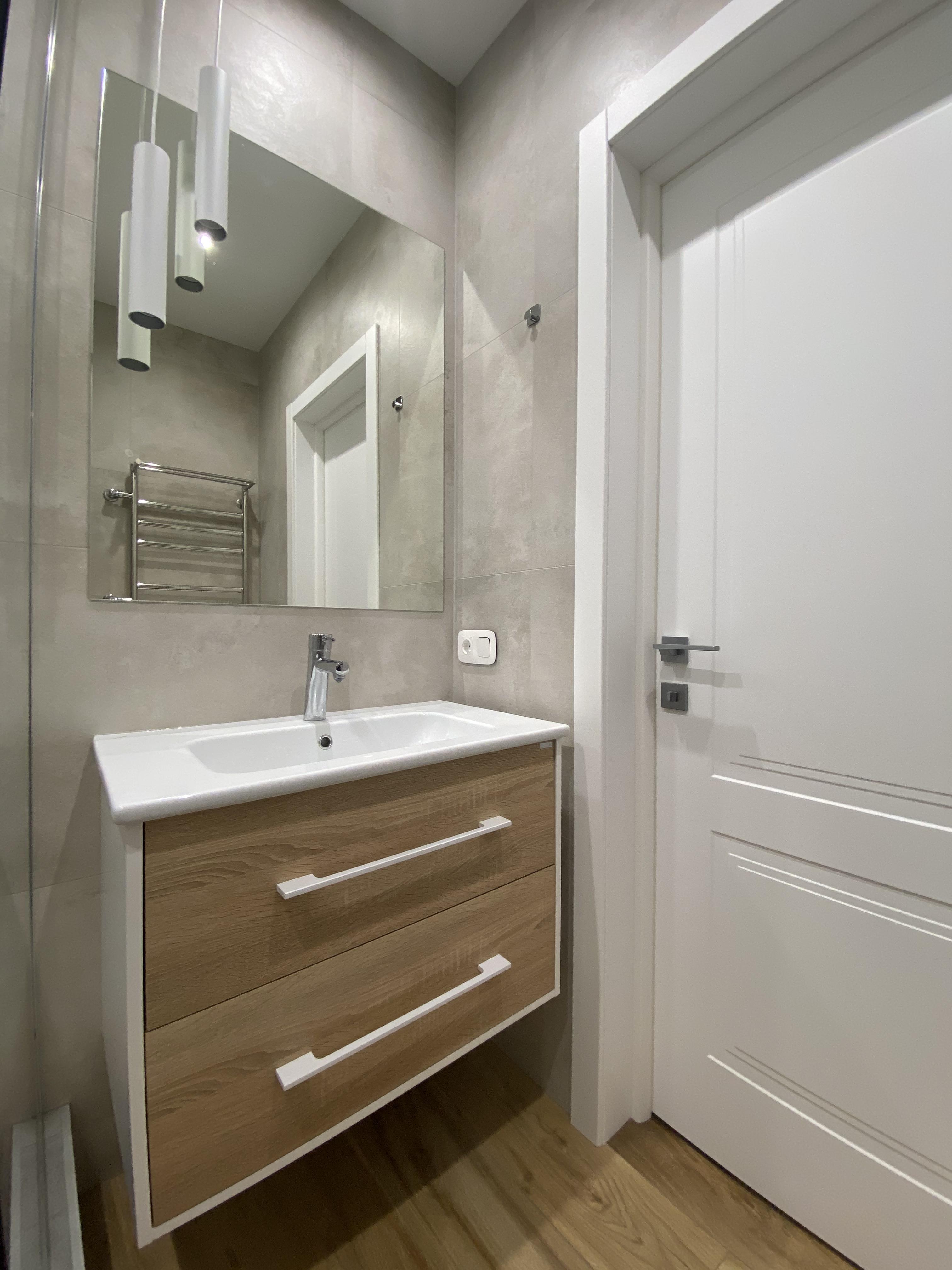 Для всей квартиры мы выбрали межкомнатную дверь модель Rino 2 в белой лаконичной эмали, с приятными тактильными свойствами. Дизайн модели очень красивый, сочетает в себе лёгкость фрезеровки, современность и классику. Дверь подчеркивает современный стиль интерьера и добавляет белые детали в пространство.