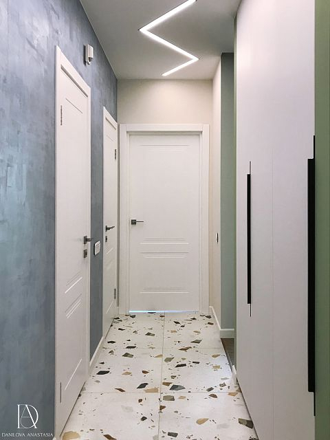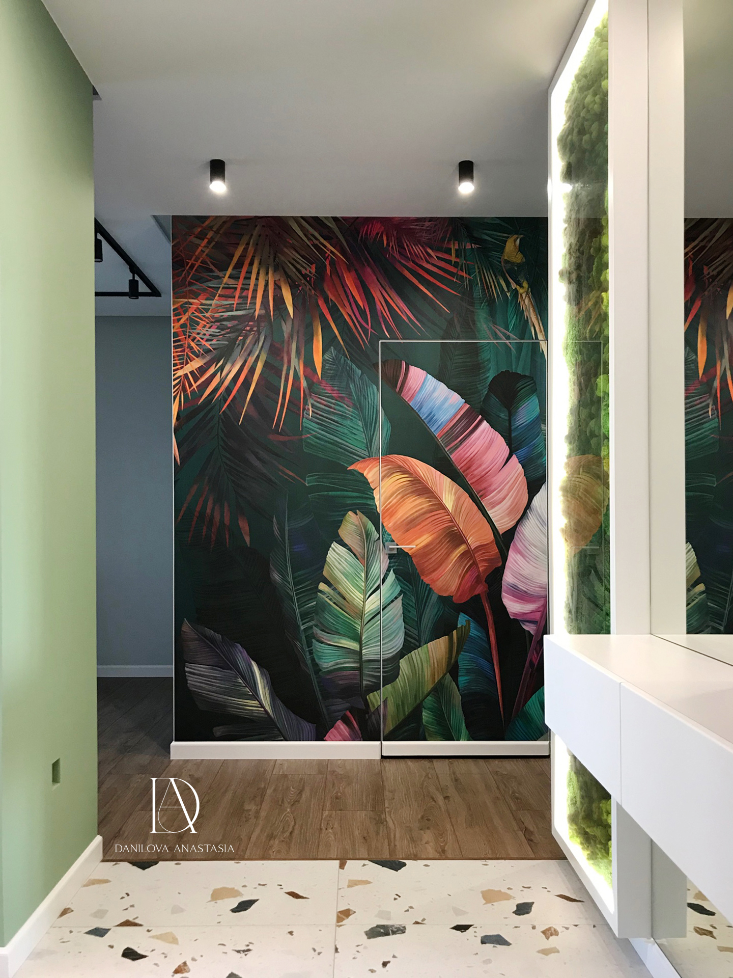 Также в проекте мы использовали скрытую дверь, чтобы сделать акцентную фреску в интерьере при входе и скрыть гардеробную комнату. Дверь взяли с алюминиевой кромкой, чтобы максимально плотно прийти к нему фреской и не задевать фреску во время эксплуатации. Со стороны гардеробной дверь покрасили.