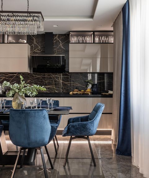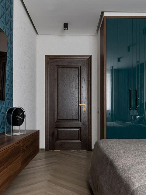 Глухие двери использованы для спальни и кабинета, а остекленная Rosso с элегантным фацетом – на входе в просторную гостиную, где любят собираться друзья семьи. Благодаря фацету на ограненных кромках стекла свет играет и переливается всеми цветами радуги.
