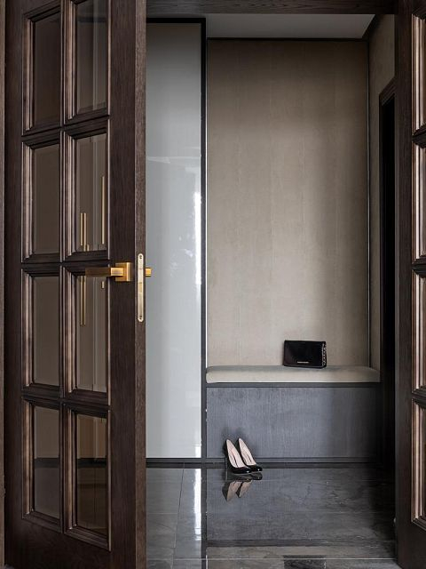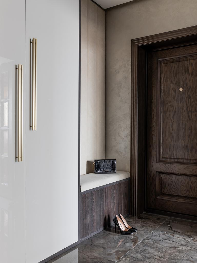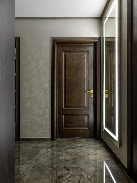 Глубина покрытия шпона достигается за счет поэтапного нанесения материалов. Сначала шпон тонируется в темный цвет, после высыхания основы двери покрываются более светлыми тонами эмали и лака. Полученный эффект вы можете увидеть на фото проекта.