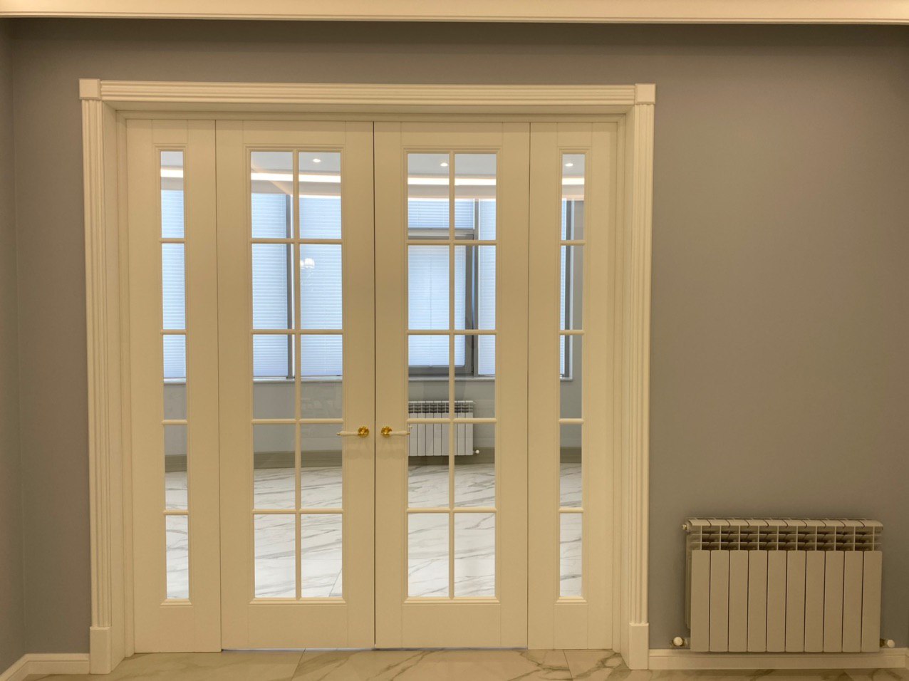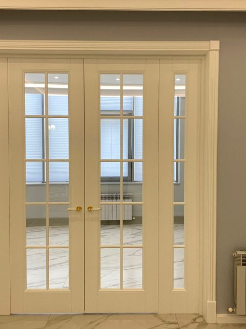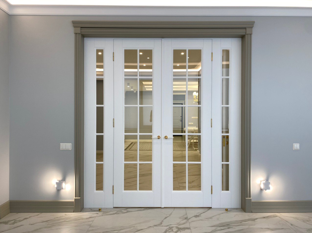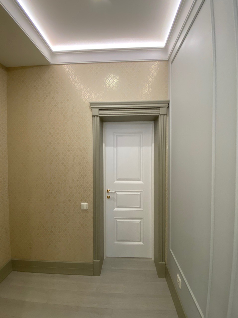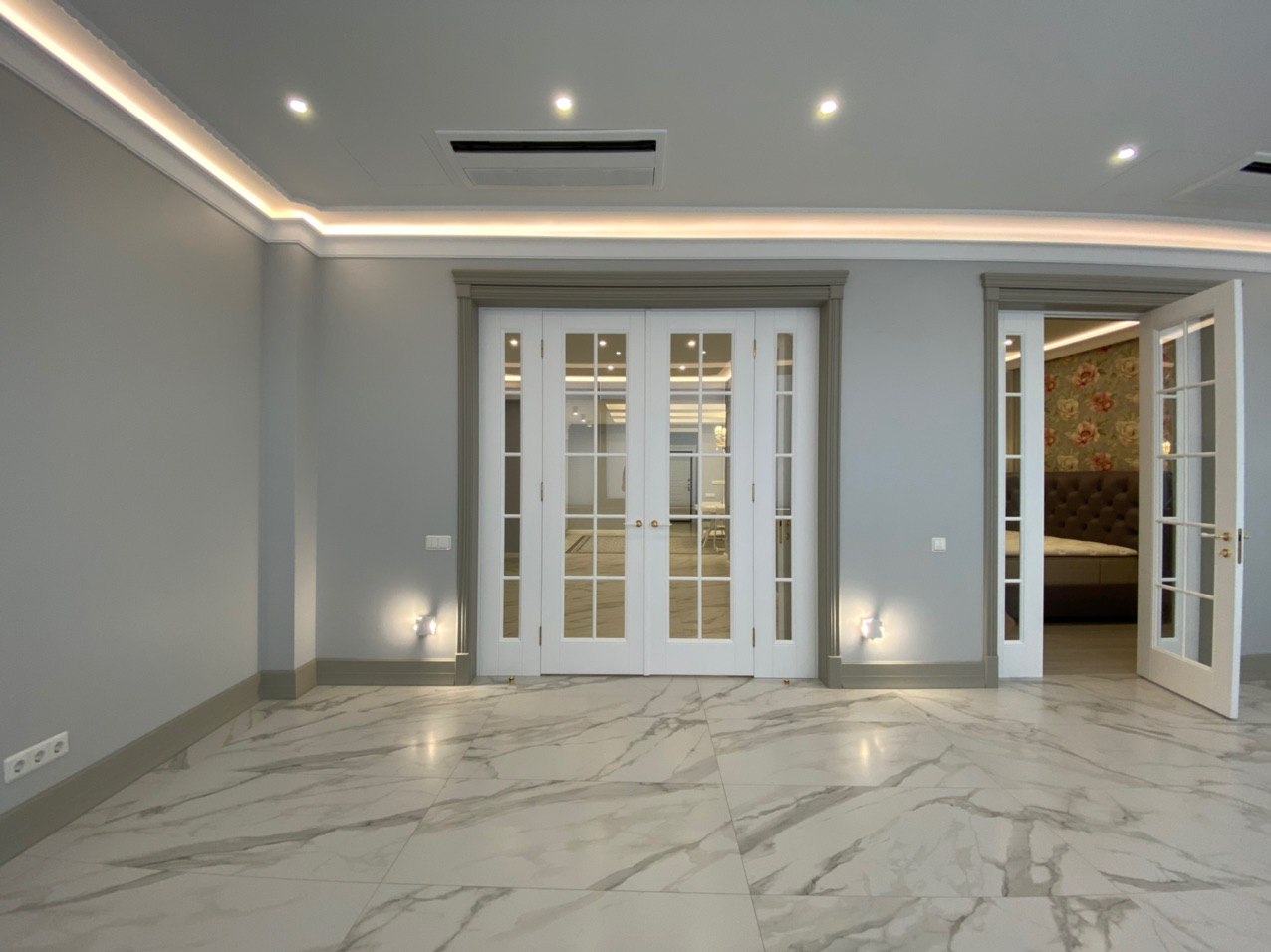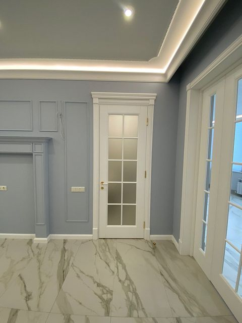 Каминная комната в холодное время года, по умолчанию, становится центром внимания и любимым местом времяпровождения всей семьи. Огонь притягивает и завораживает, создает уют и тепло. Нами выполнена отделка базовой комплектации каминной комнаты по желанию заказчика: неброское точечное освещение и светодиодная подсветка по периметру комнаты, декорирование стен рамками из молдингов и золотыми вставками, изящная ниша для электрокамина. Благодаря легким остекленным двустворчатым дверям, которые ведут на террасу, в каминной всегда много естественного света.