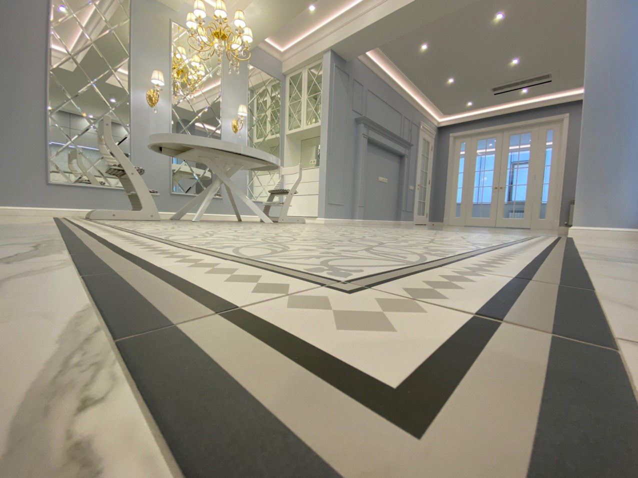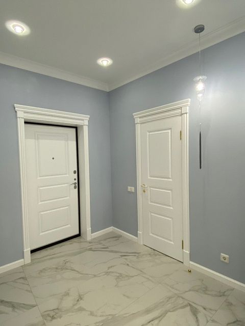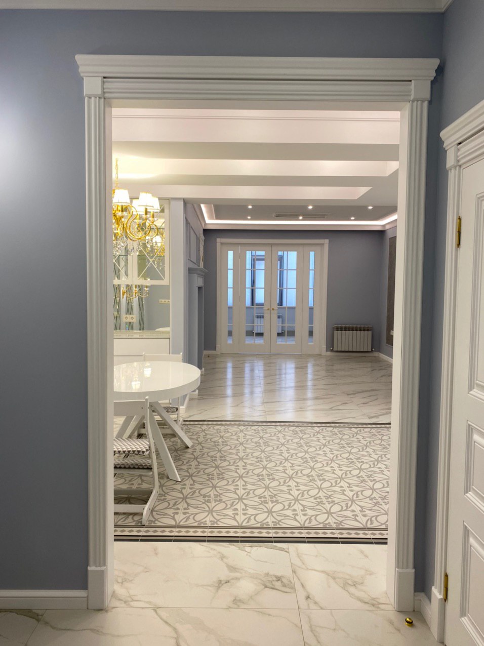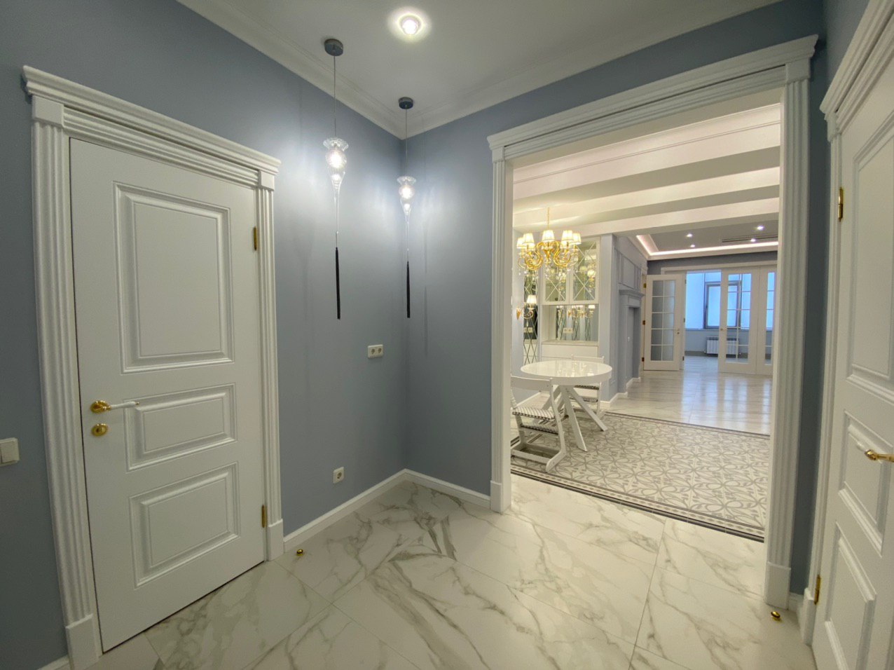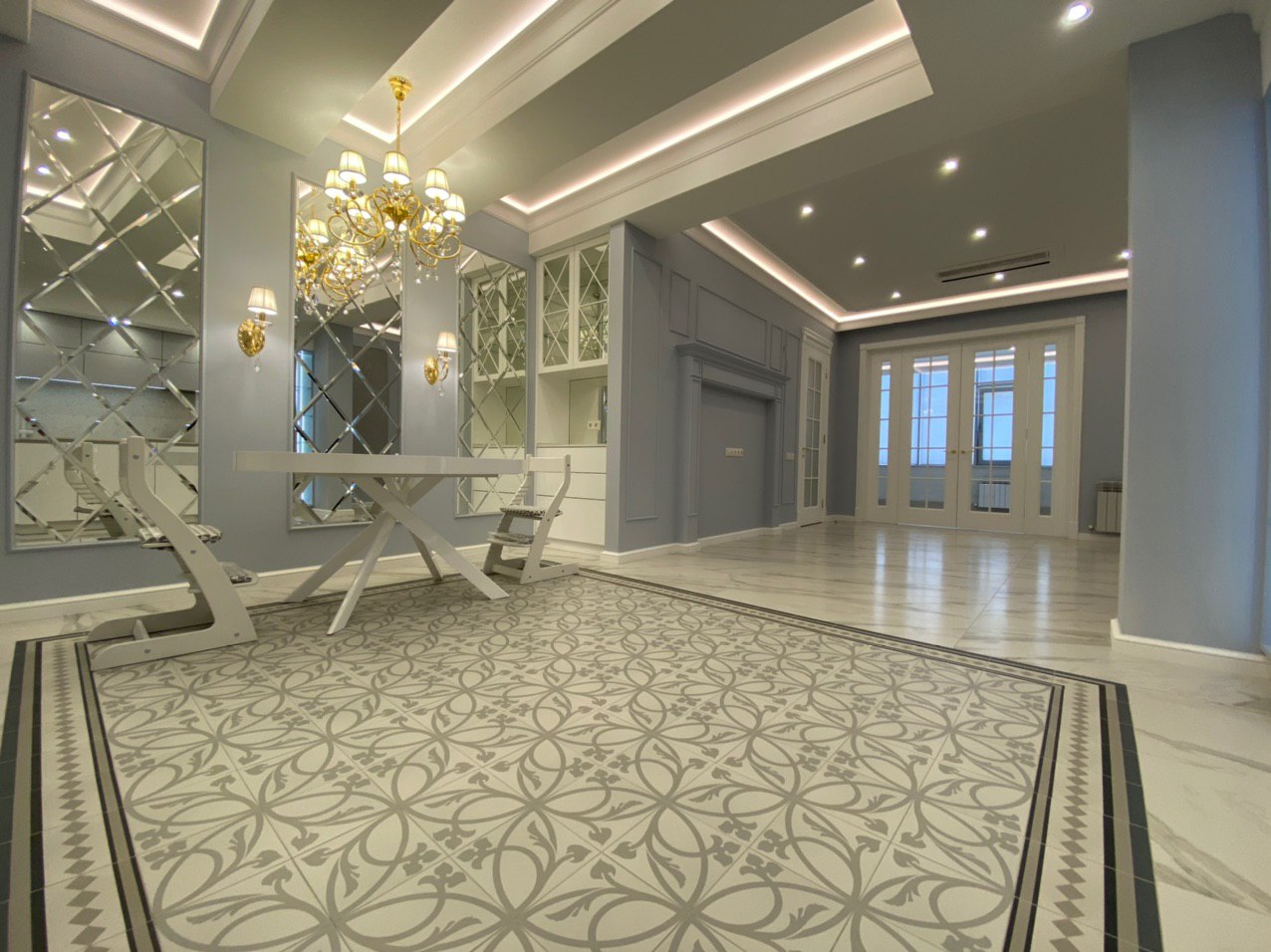 Прекрасная двухкомнатная квартира выполнена в стиле неоклассика. Освежающие холодные тона, подобранные для этого проекта, смягчают позолоченные элементы декора и освещения. Квартира получилась очень светлой, утонченной, нежной и уютной. Наш проект состоит из: прихожей, хозблока, 2х санузлов, кухни-столовой, просторной каминной комнаты, светлой закрытой террасы и шикарной спальни.