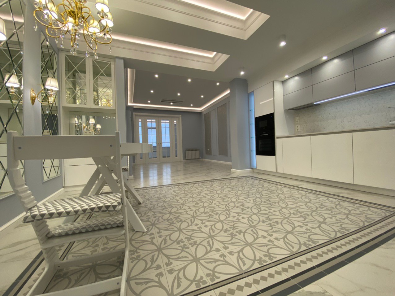 Просторная кухня-столовая встречает своих гостей морем света. Зона столовой группы декорирована зеркалами и встроенным буфетом, вся композиция создает чувство легкости, изящности и невесомости. А вот рабочая зона получилась весьма лаконичной и практичной. Особое внимание хочется уделить световому решению для данного помещения. Очень гармонично и выгодно в одной композиции сочетается современная потолочная конструкция с светодиодной подсветкой, точечные светильники в рабочей зоне и классическая группа из люстры и бра с столовой зоне. А сочетание зеркал и огромного количества света в данном случае не просто расширяют пространство, но и создают атмосферу уюта и тепла.