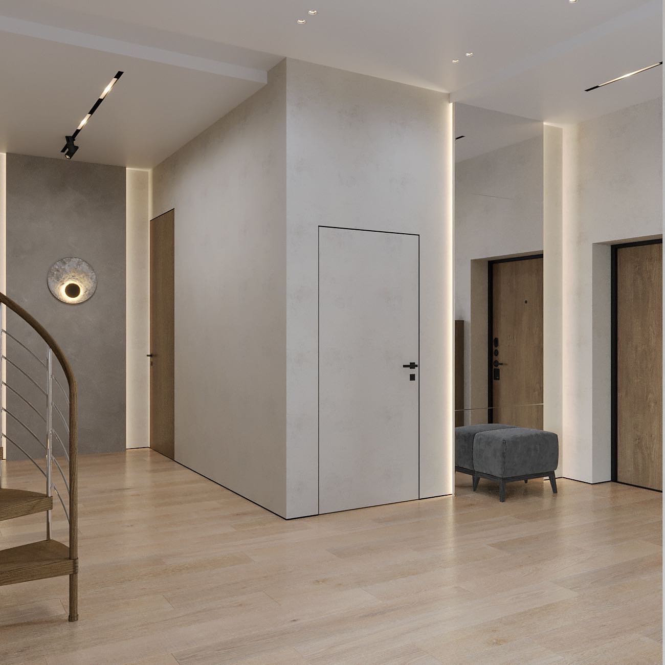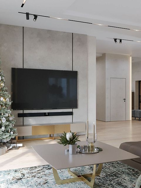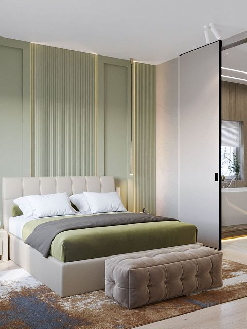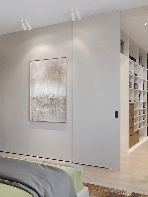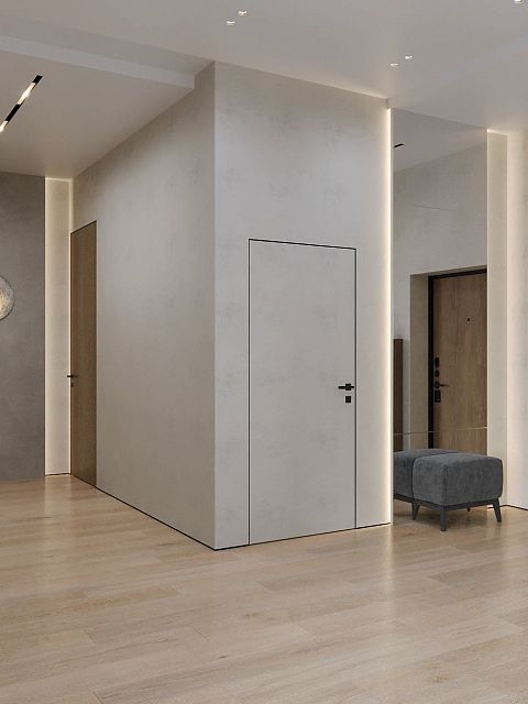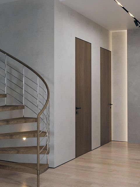 Вместе с тем, вся обстановка максимально продумана и функциональна: входы в гардеробную и санузлы скрыты от посторонних глаз дверями, смонтированными при помощи невидимого механизма открывания INVISIBLE или в скрытом алюминиевом коробе и окрашенными в цвет стен. А нотки трендовости интерьеру добавляют модные высокие двери в покрытии натуральный шпон дуба, цвет «Мускат».
