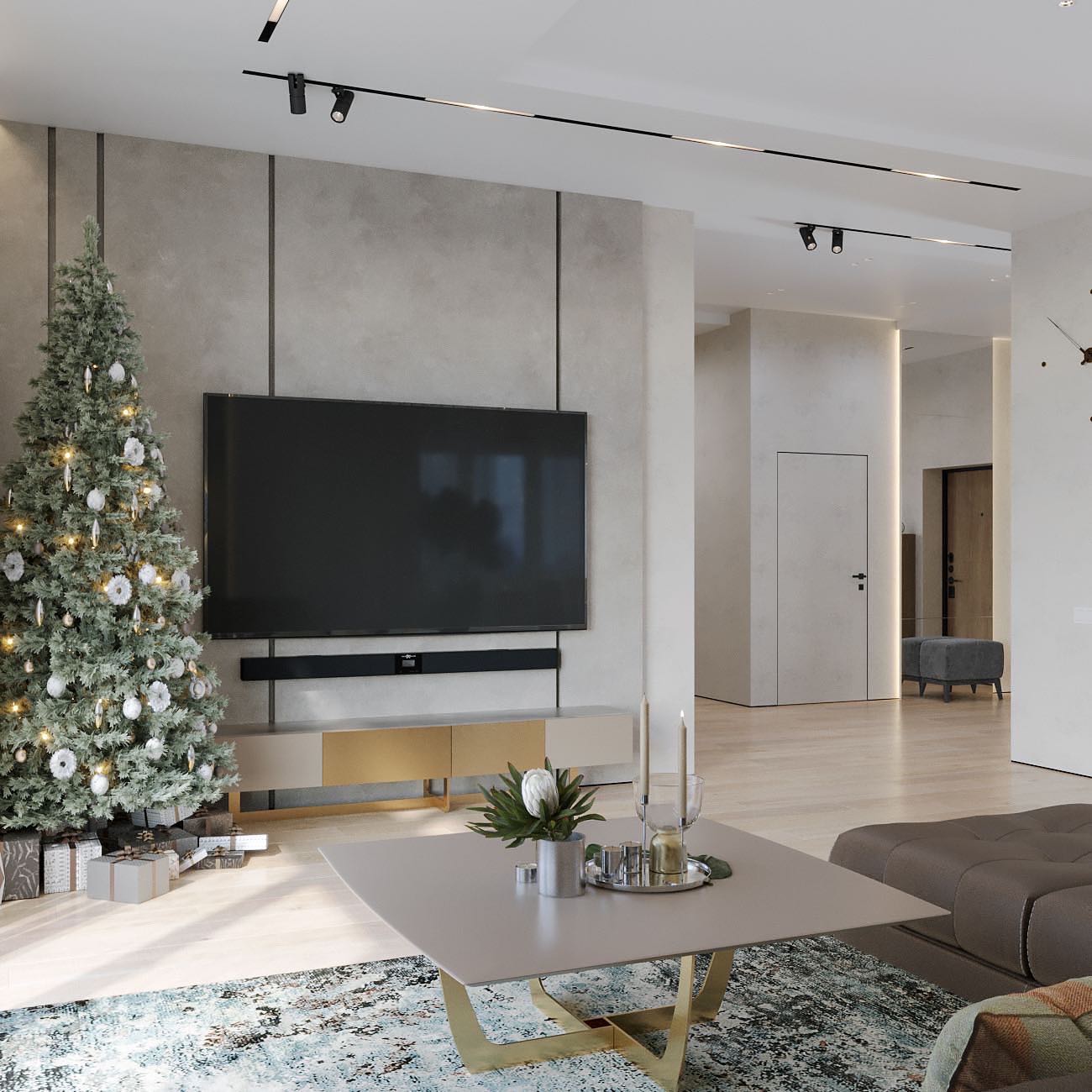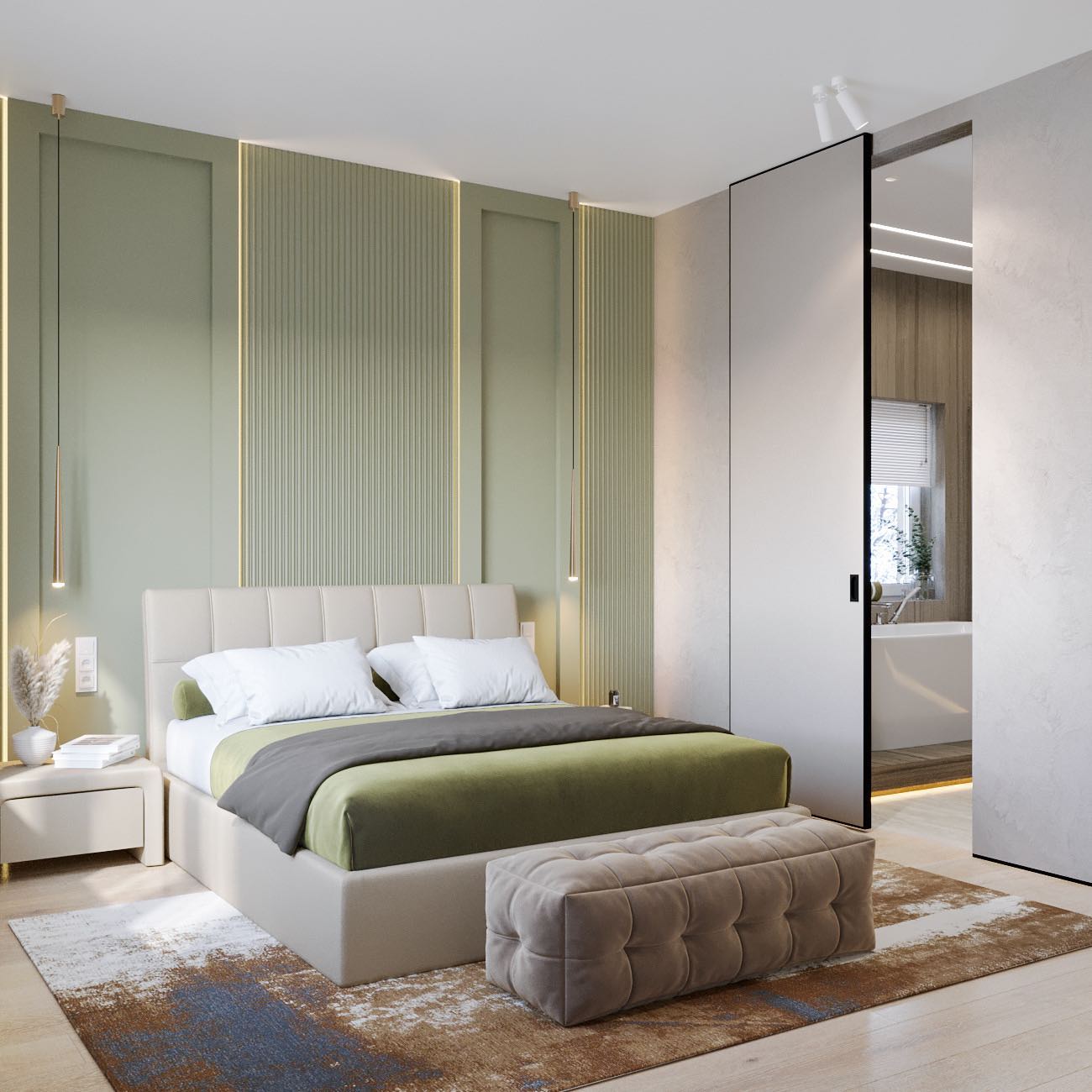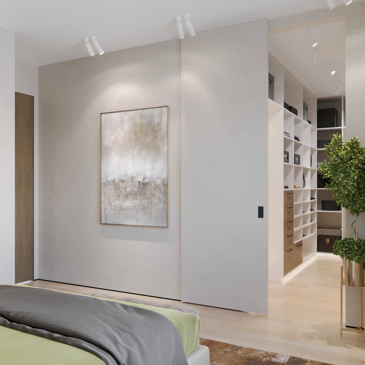 Вместе с тем, вся обстановка максимально продумана и функциональна: входы в гардеробную и санузлы скрыты от посторонних глаз дверями, смонтированными при помощи невидимого механизма открывания INVISIBLE или в скрытом алюминиевом коробе и окрашенными в цвет стен. А нотки трендовости интерьеру добавляют модные высокие двери в покрытии натуральный шпон дуба, цвет «Мускат».
