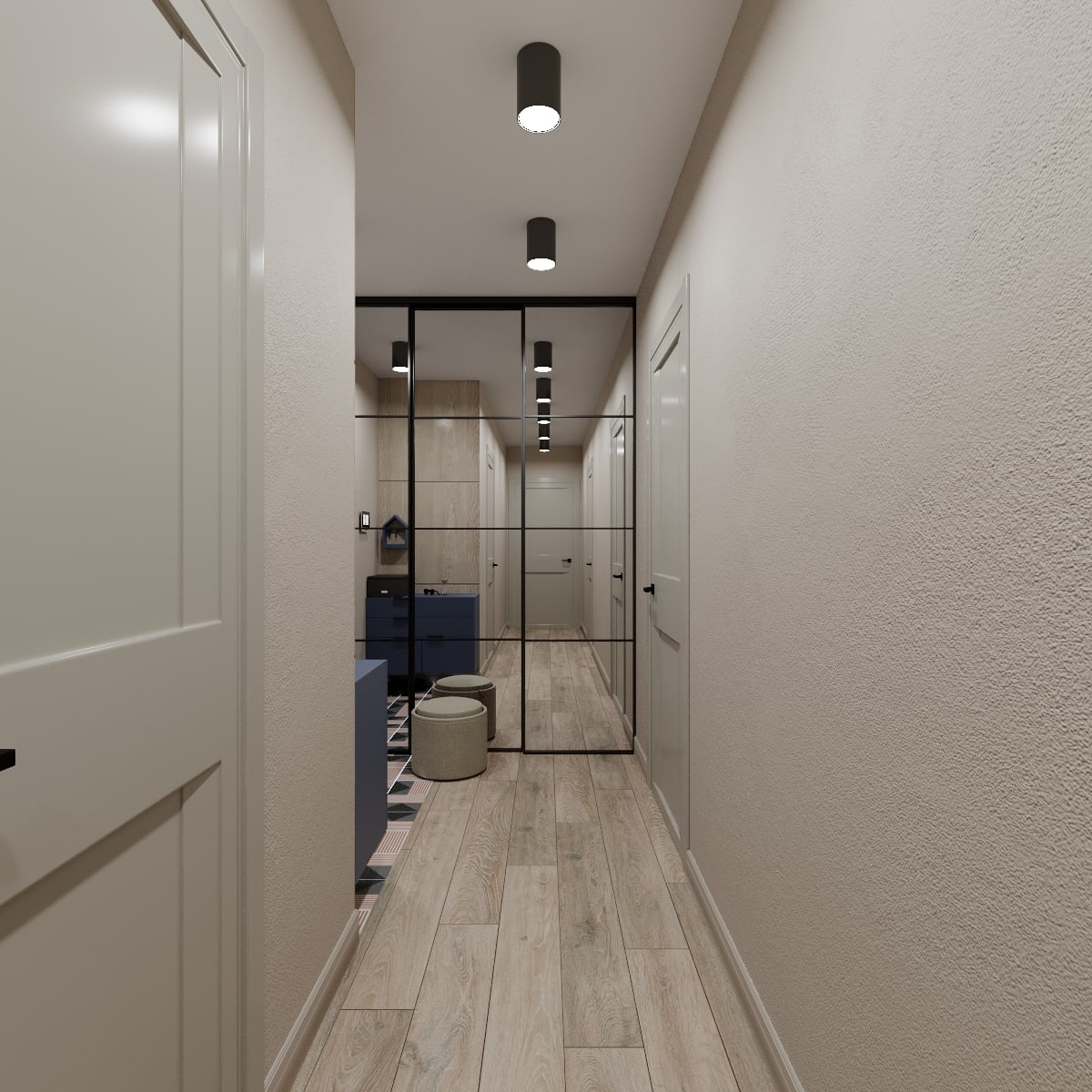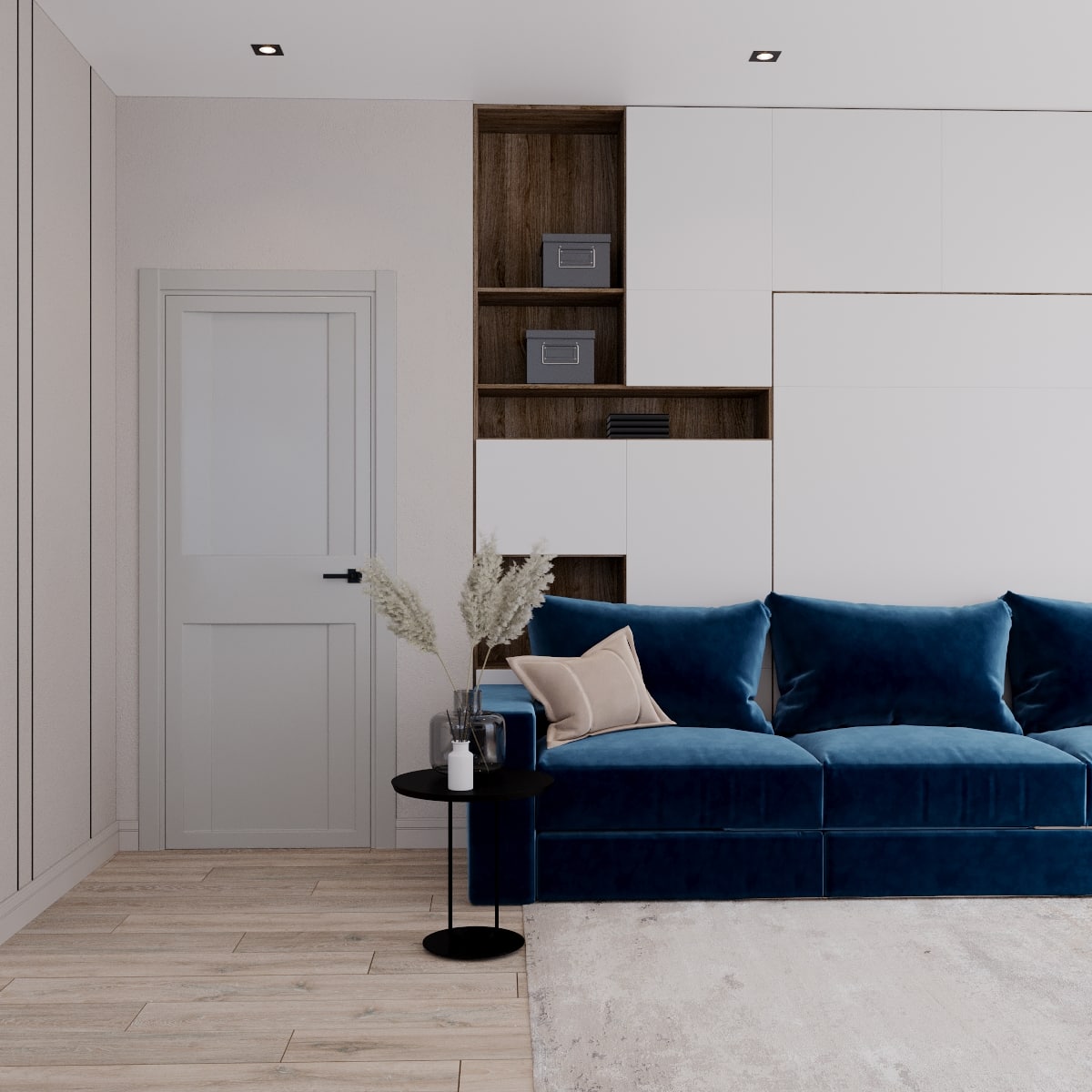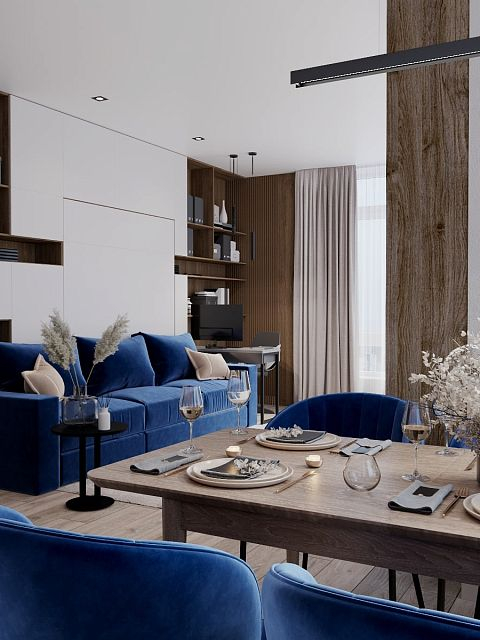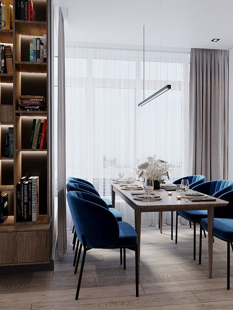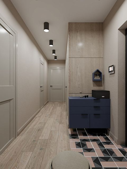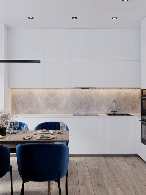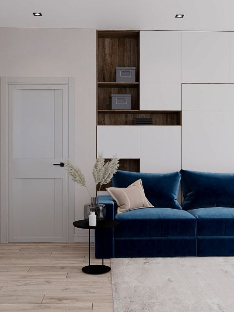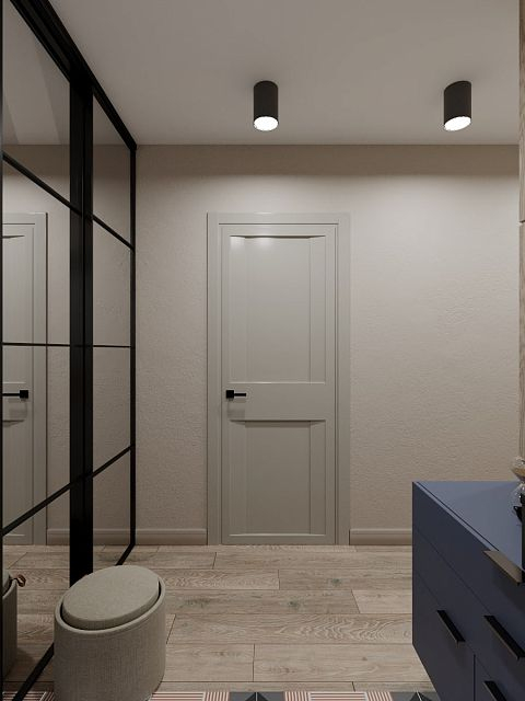В проекте кемеровского дизайнера Татьяны Лапуновой, на наш взгляд, два таких стильных акцента: мебель глубокого синего цвета и новинка нашей фабрики – дверь PODIO 01 из коллекции Design в эмали светлого цвета. Оригинальность этой модели в необычной, создающей разные объемные плоскости на полотне, фрезеровке. Это ультрасовременный дизайн, который способен делать не каждый производитель дверей.