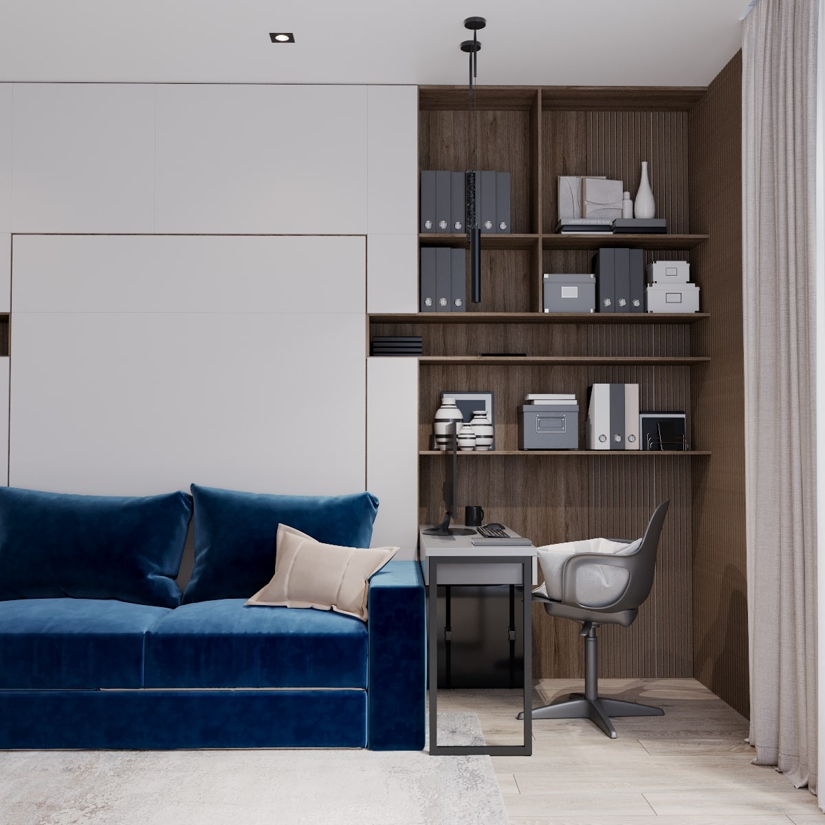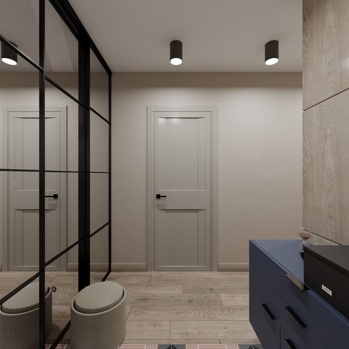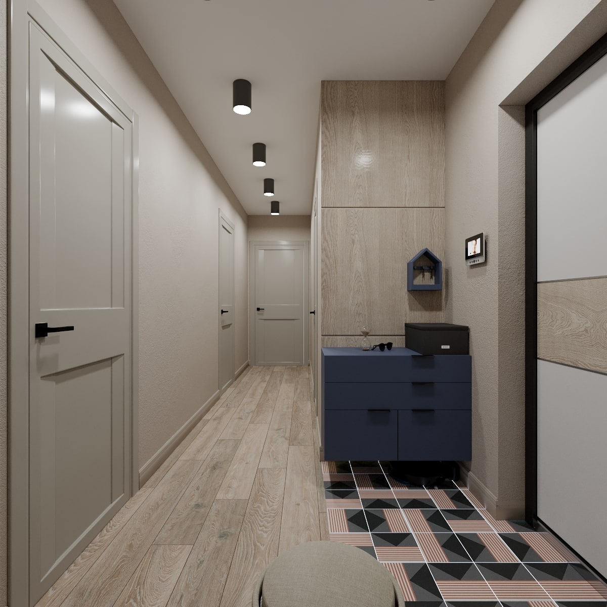 В проекте кемеровского дизайнера Татьяны Лапуновой, на наш взгляд, два таких стильных акцента: мебель глубокого синего цвета и новинка нашей фабрики – дверь PODIO 01 из коллекции Design в эмали светлого цвета. Оригинальность этой модели в необычной, создающей разные объемные плоскости на полотне, фрезеровке. Это ультрасовременный дизайн, который способен делать не каждый производитель дверей.