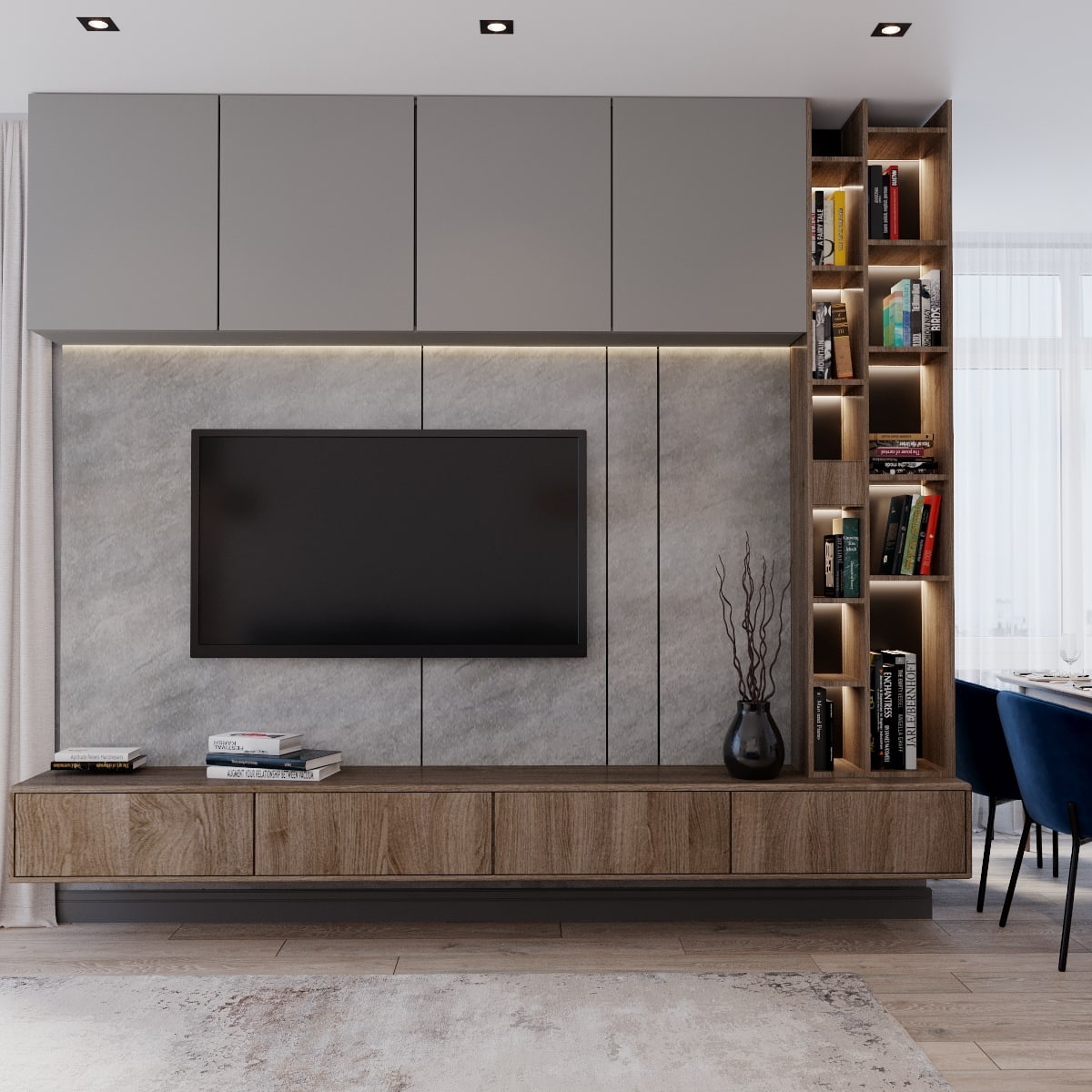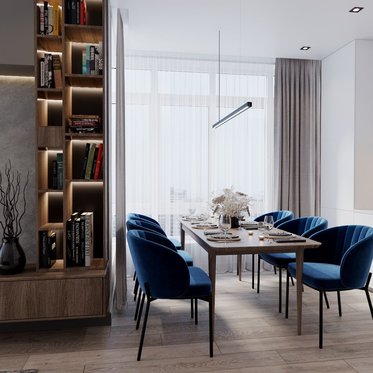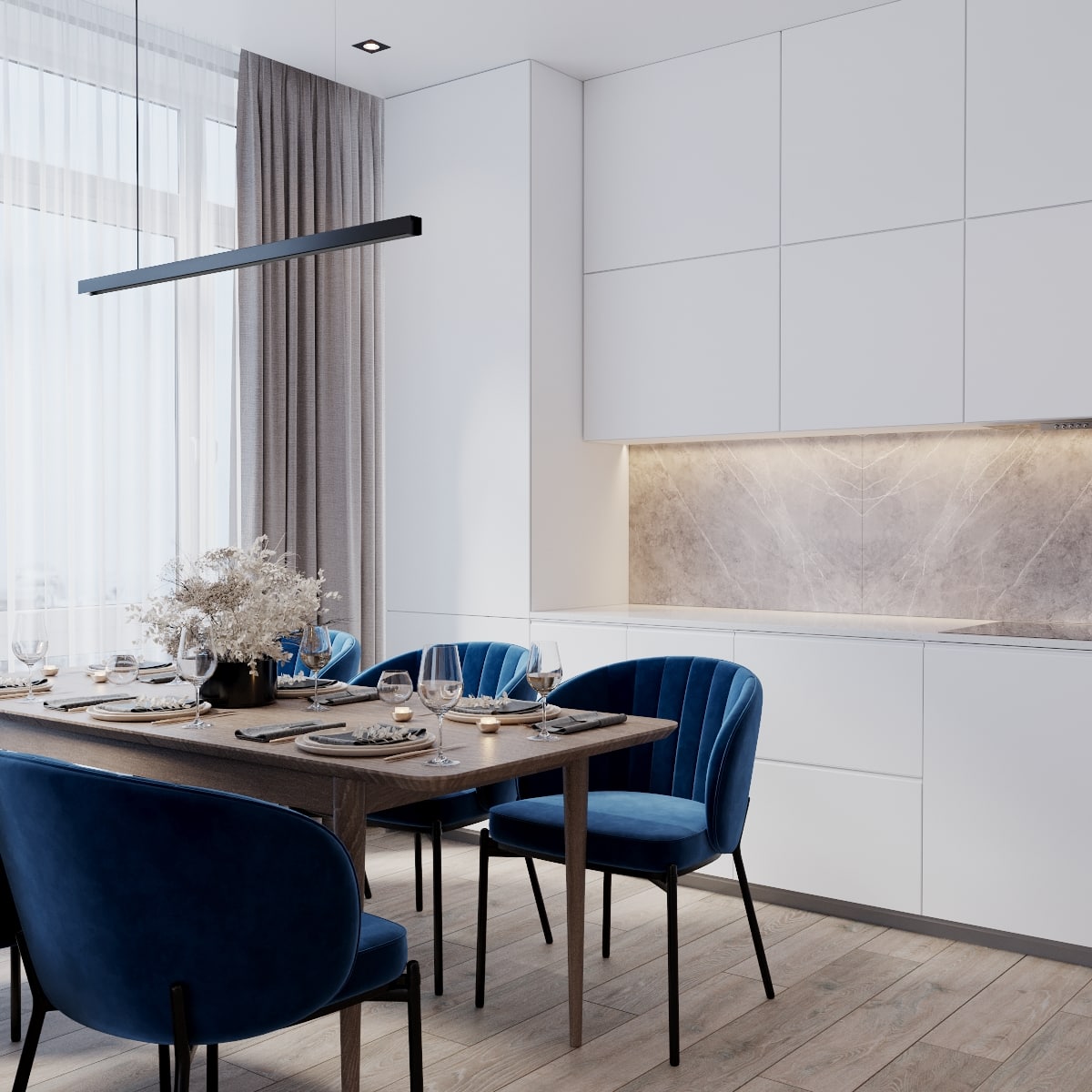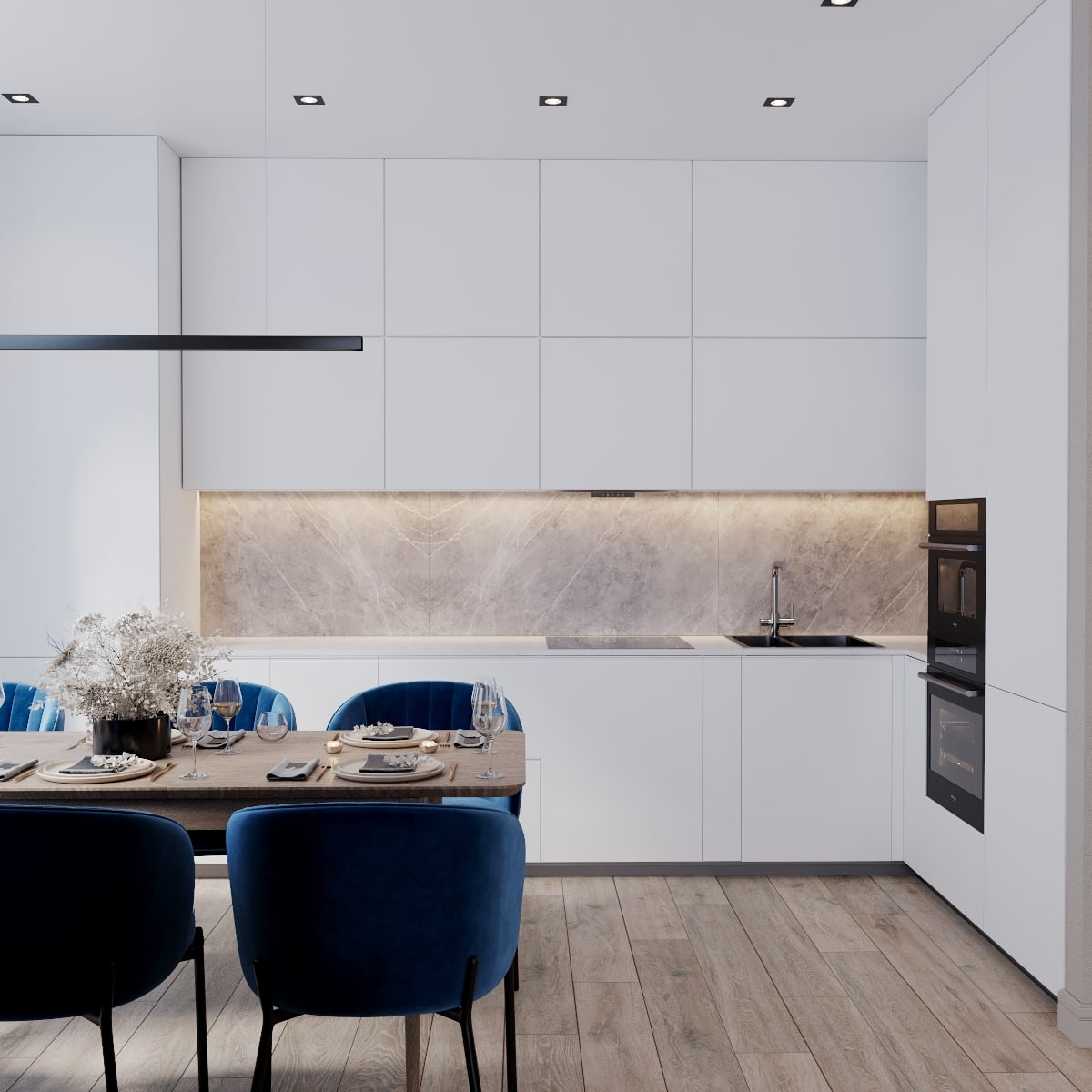 В проекте кемеровского дизайнера Татьяны Лапуновой, на наш взгляд, два таких стильных акцента: мебель глубокого синего цвета и новинка нашей фабрики – дверь PODIO 01 из коллекции Design в эмали светлого цвета. Оригинальность этой модели в необычной, создающей разные объемные плоскости на полотне, фрезеровке. Это ультрасовременный дизайн, который способен делать не каждый производитель дверей.