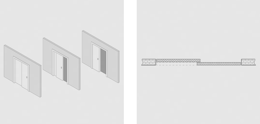 Каскадные системы устанавливаются в нестандартно широкие проемы и включают 3, 4 и больше полотен. Чаще всего это решение используется для гостиных, столовых, гардеробных, зонирования квартир-студий.